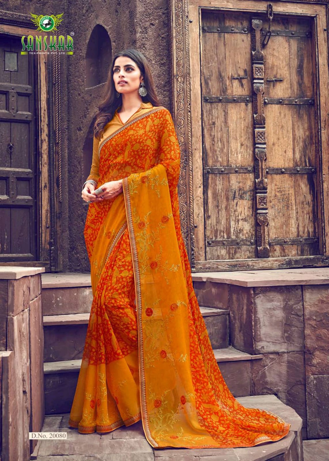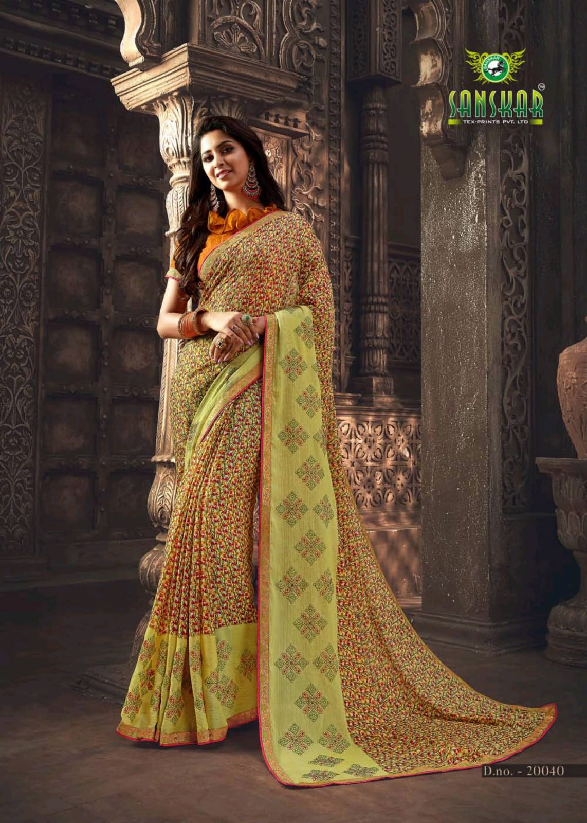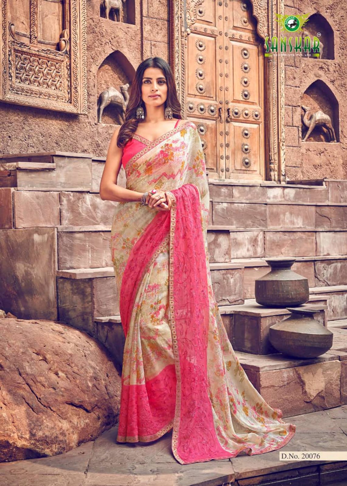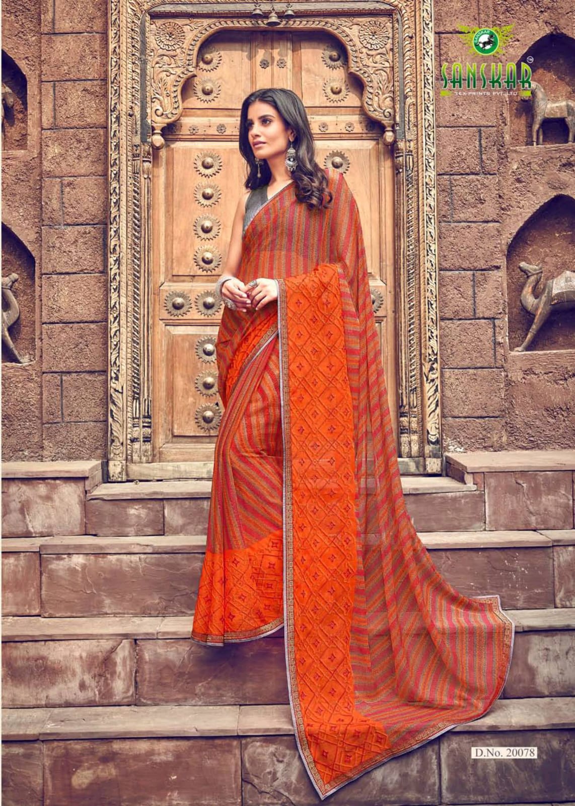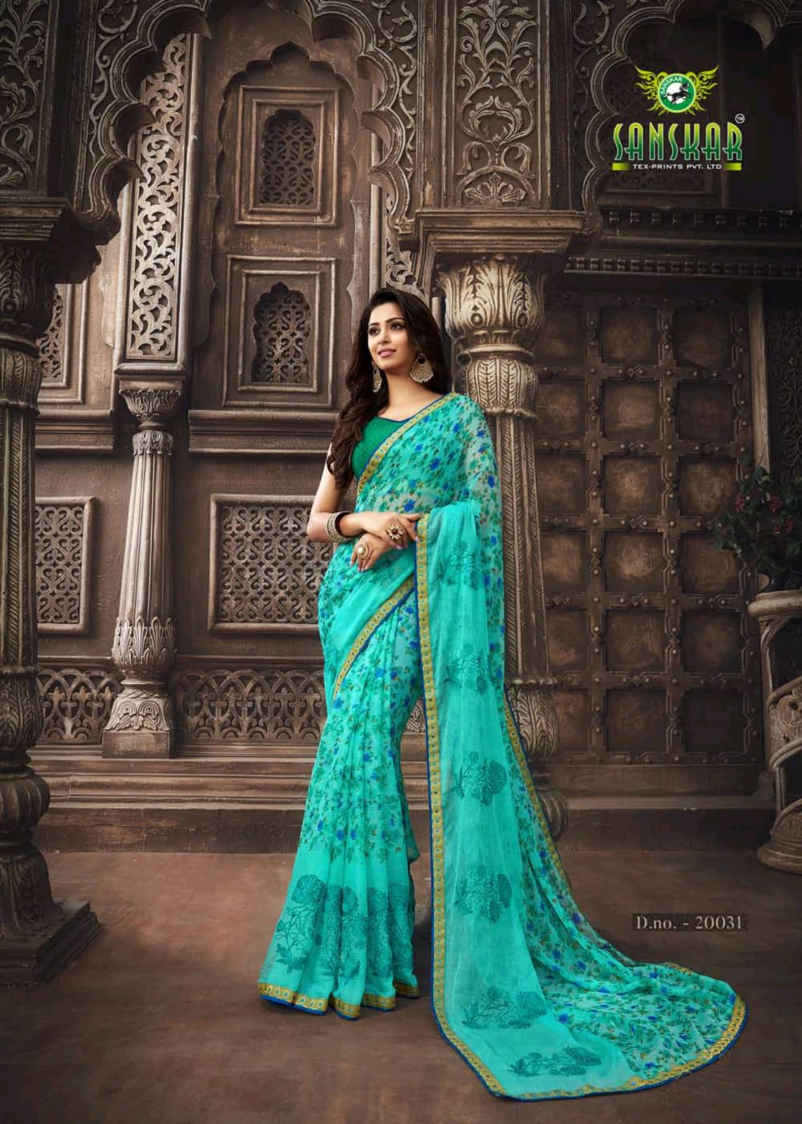 Nayna Hit By Sanskar Tex Prints Chiffon With Fancy Work Synthethic Saree Collections