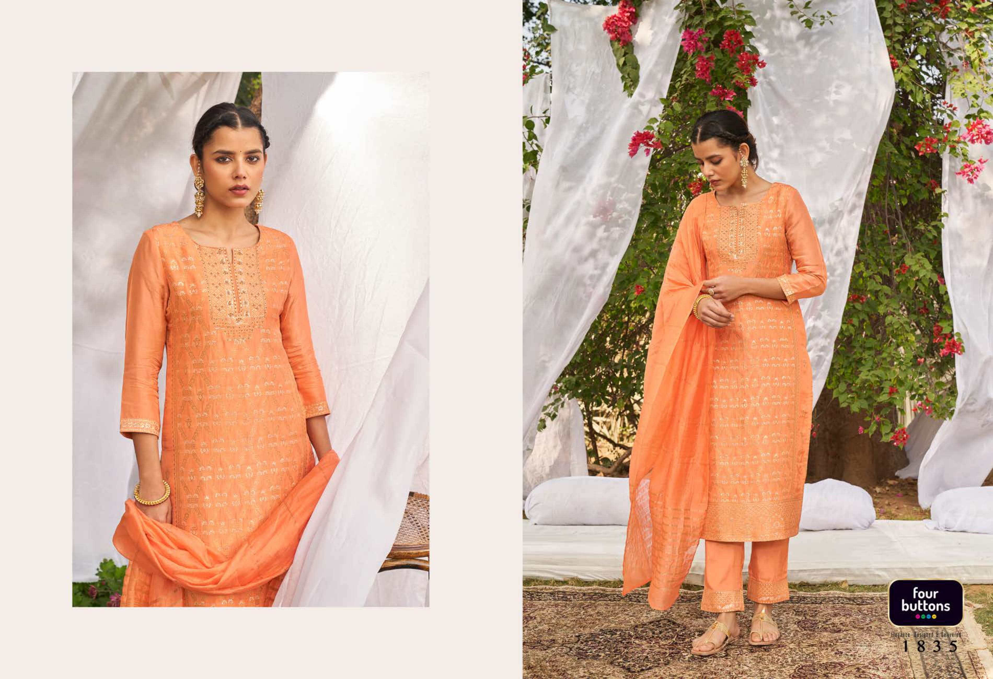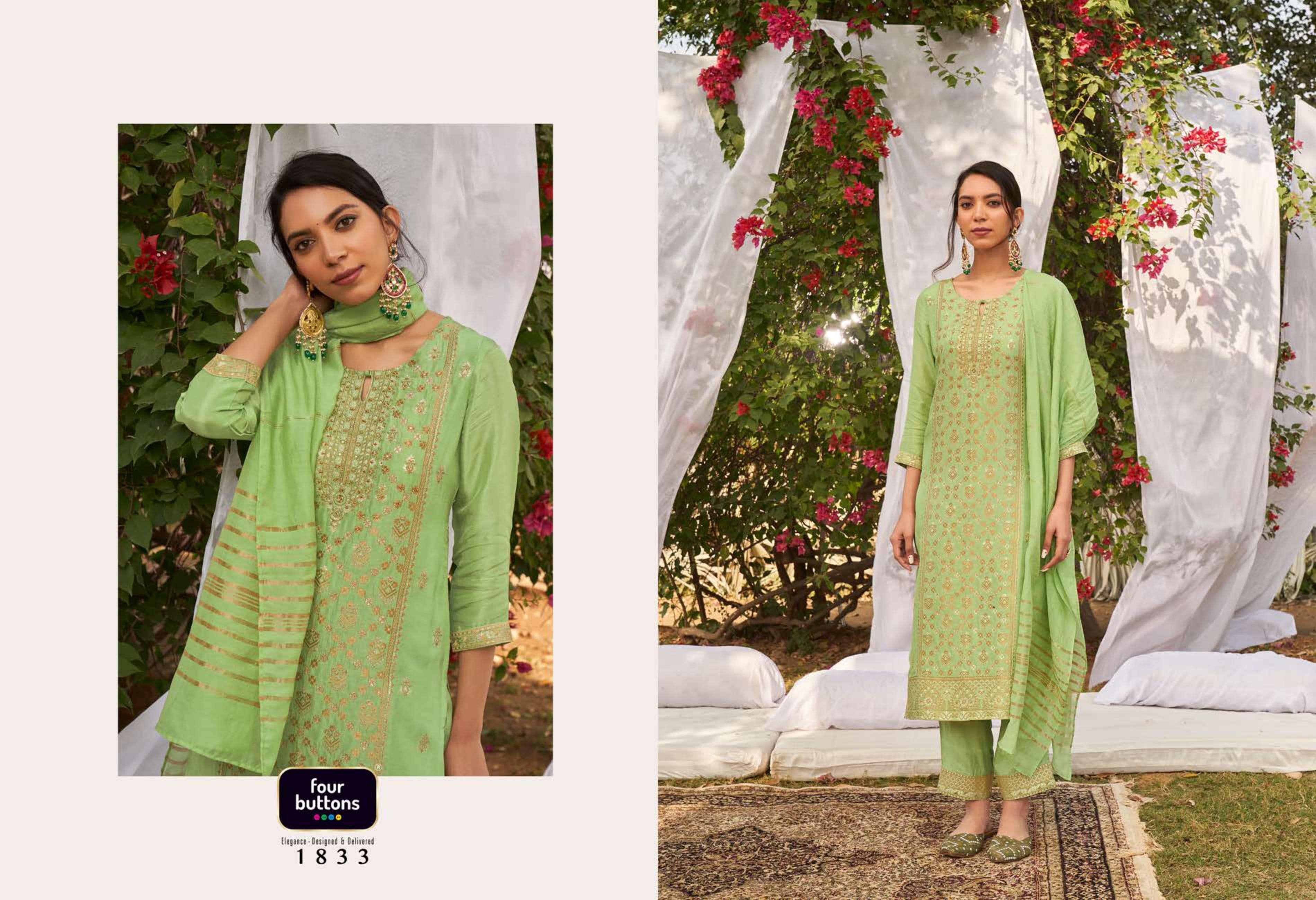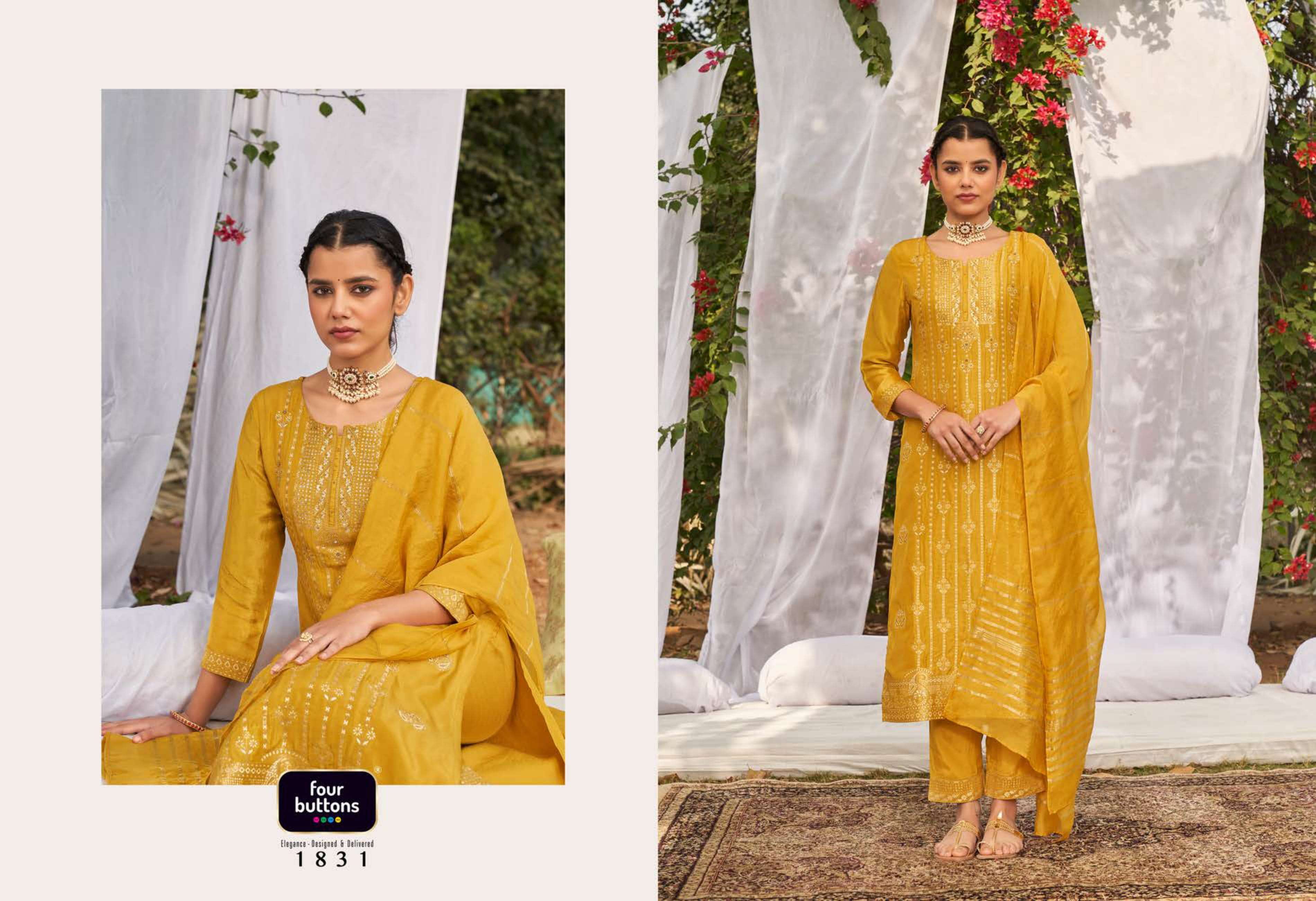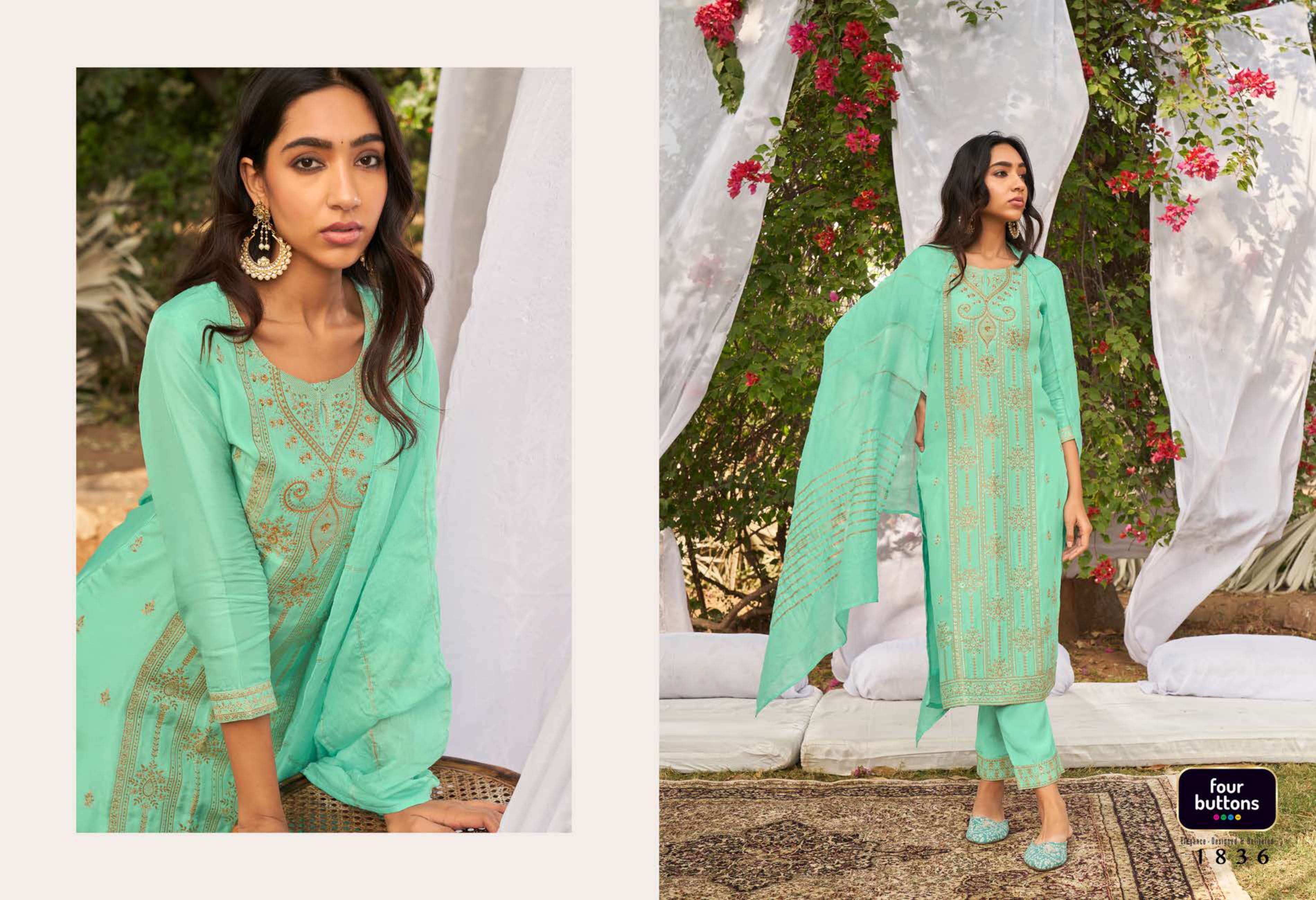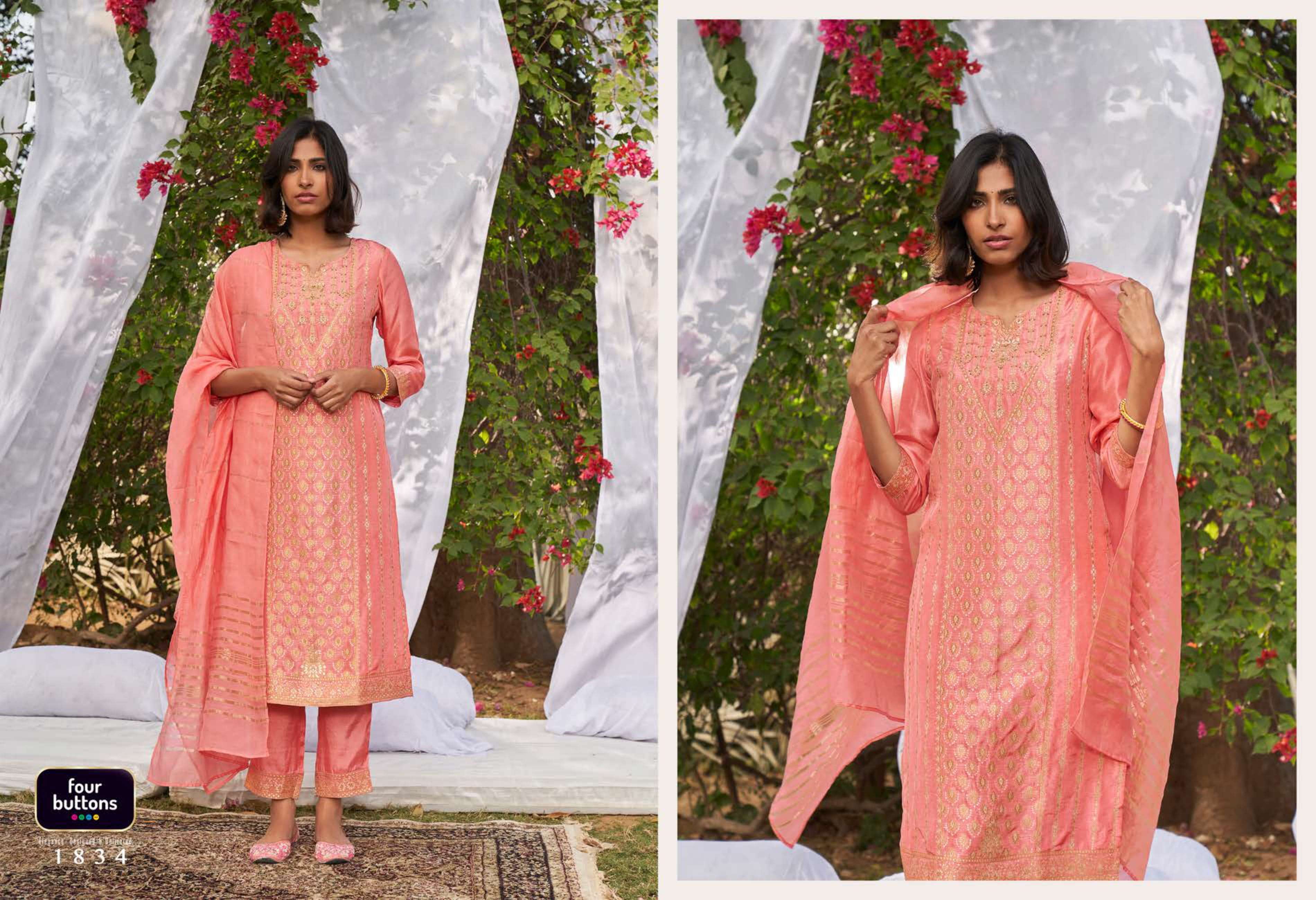 FOUR BUTTONS proudly launches its NEW collection 2022 "NAZAKAT"2 FABRIC KURTI - PLACEMENT JACQUARD WITH MX AND HANDWORK ON PURE DOLA SILK BOTTOM - PURE VISCOSE SILK WITH JACQUARD ATTACHMENT DUPATTA- PURE VISCOSE WEAVING ZARI RATE - Rs 1599/- SIZES - S, M, L, XL, XXL, 3XL |