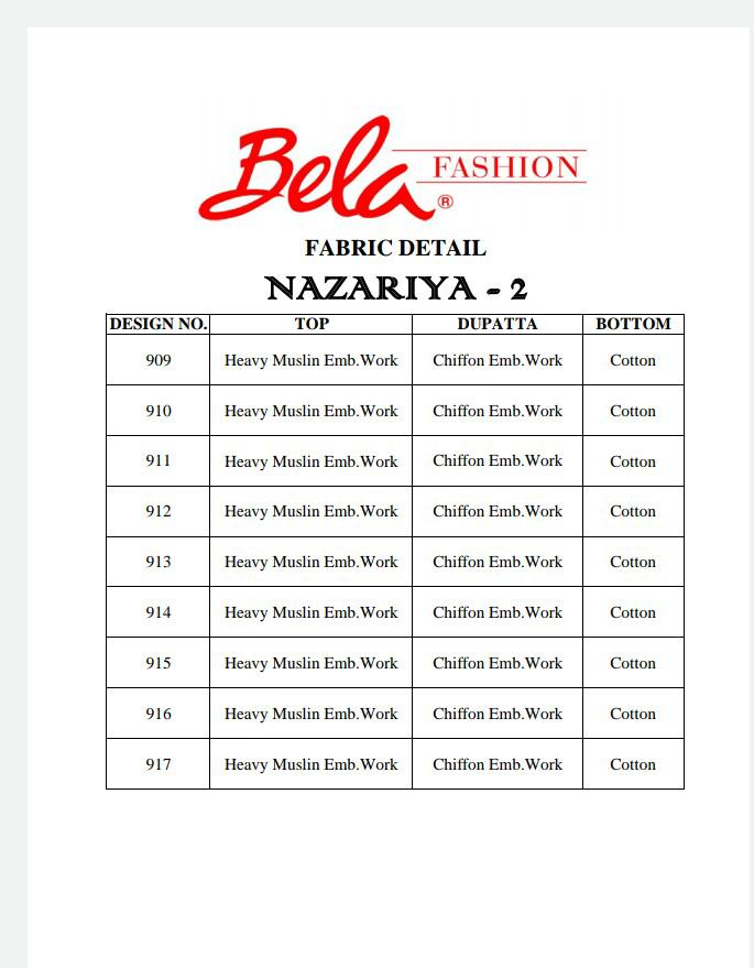 Nazariya Vol 2 By Bela Fashion 909-917 Series Muslin Embroidered Salwar Suits