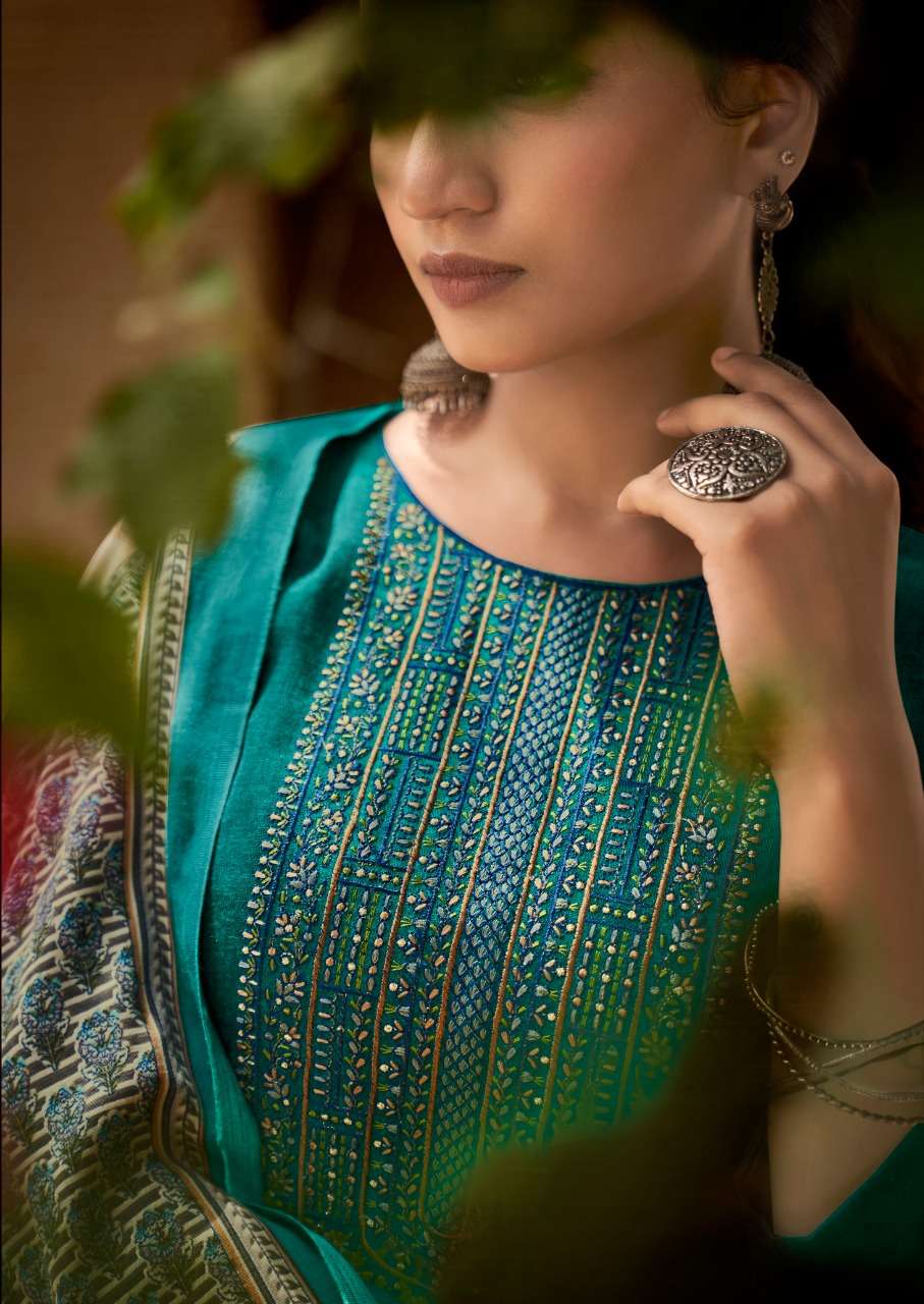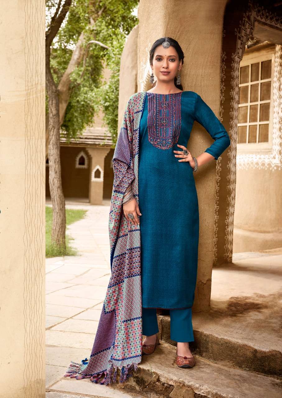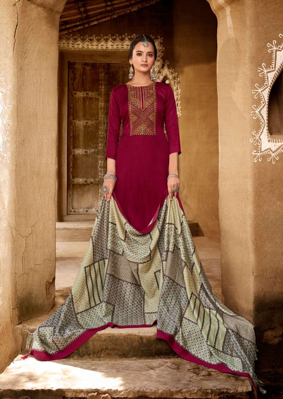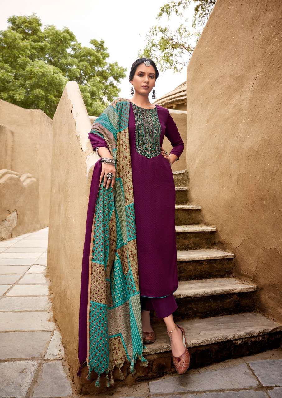 LEVISHA ✨💐 NAZIYA 💐✨ ♦️Description♦️ 🔹Top: Pure Pashmina Negative print With Self Embroidery (2.50)mtr. 🔹Dupatta: Pure pasmina Swal printed Excellent Premium Quality (2.30 mtrs) 🔹 Bottom: Spun Pasmina Dyed (3.00 mtrs) 🔹Beautiful 8 design set 🔹 Rate: 595/- |
