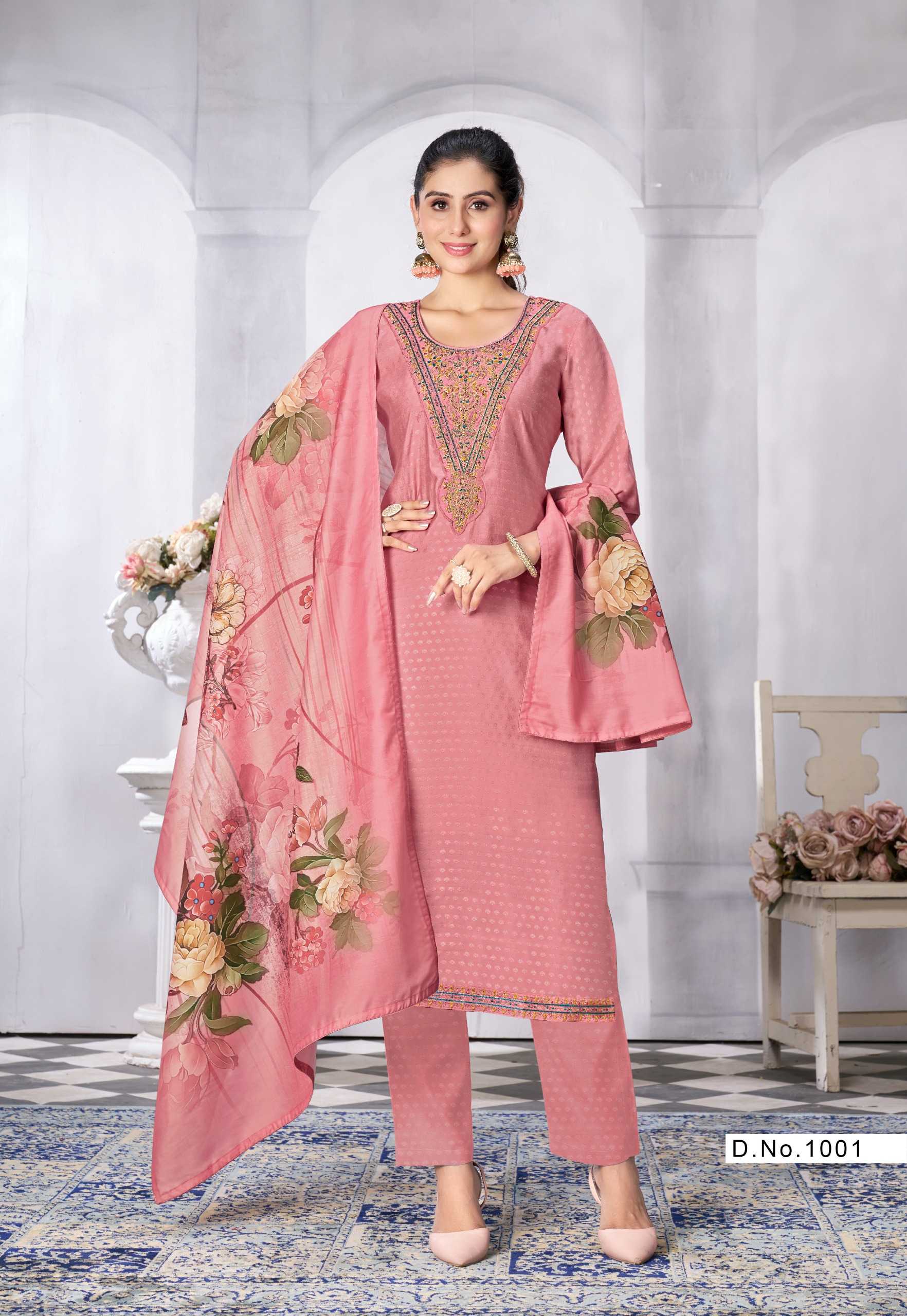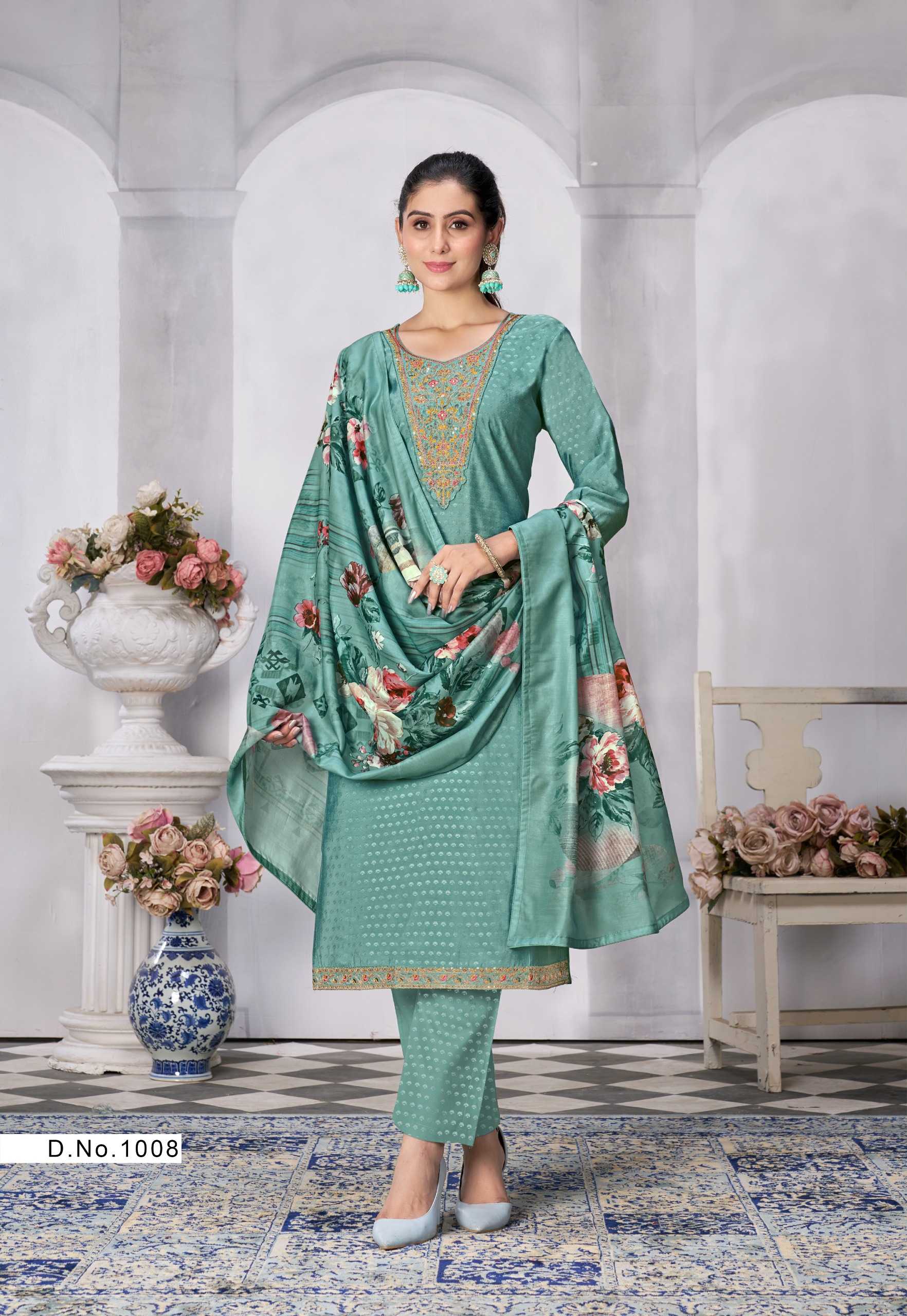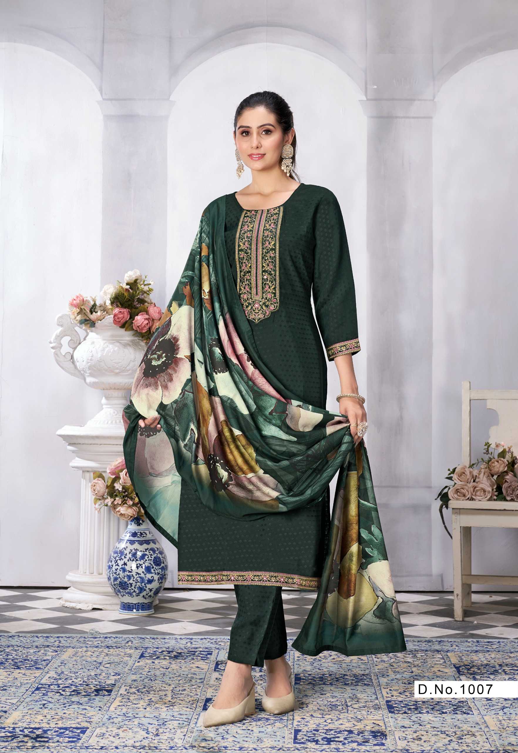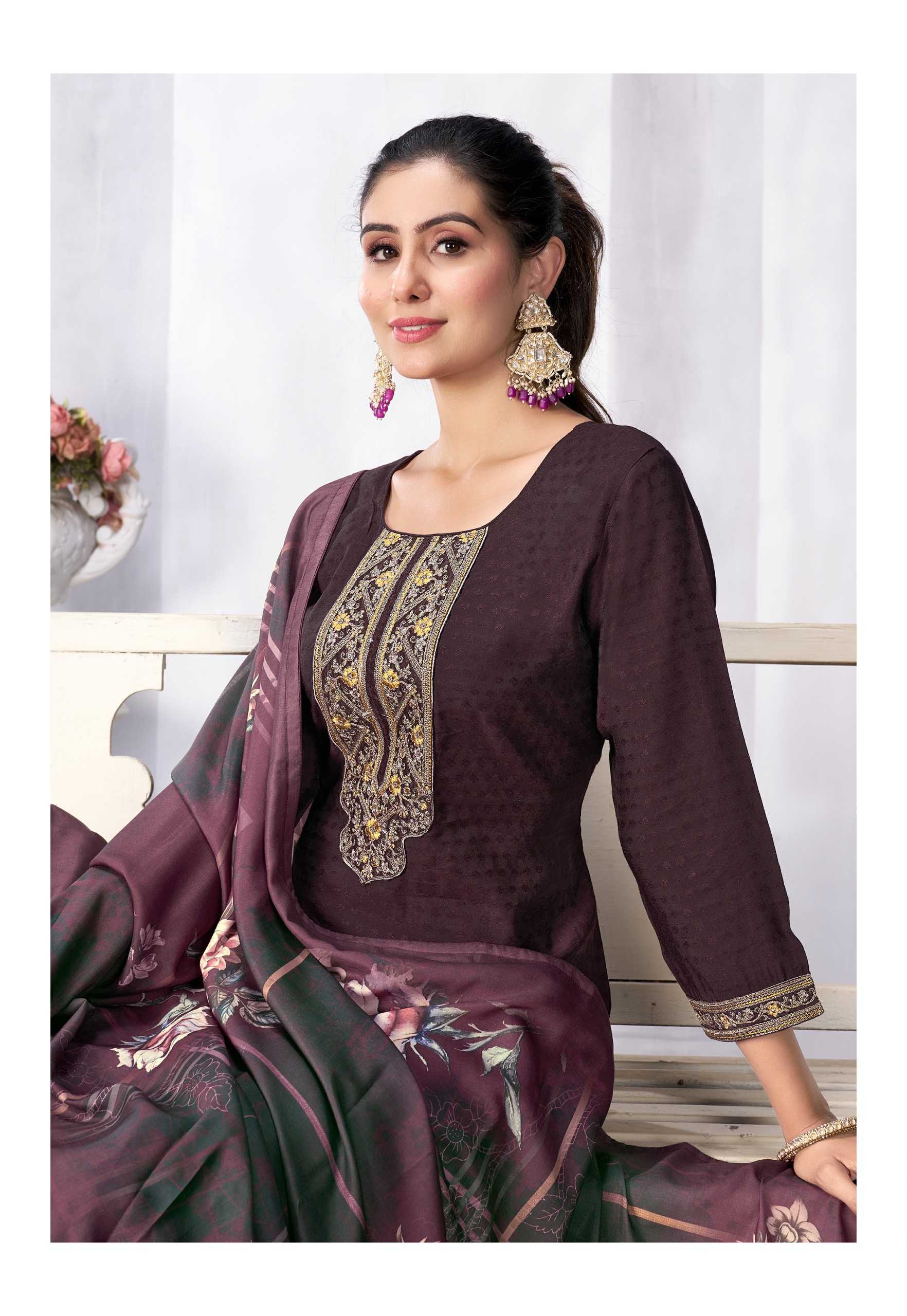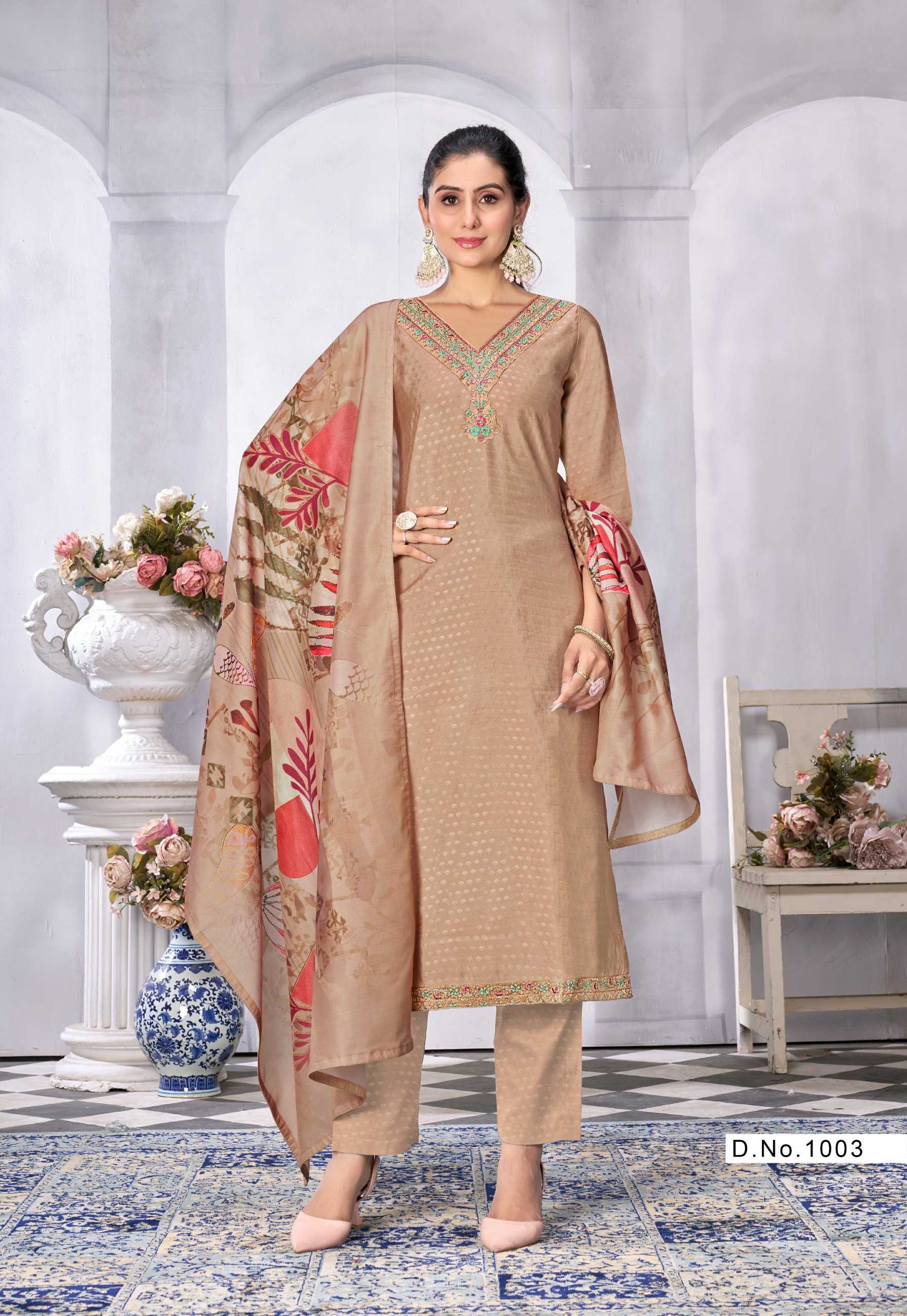 Nazmein Exclusive work on Neck Sleves and Daman. Duppatta - musline cotton digital print with 4 side piping. Size - L to 4xl Rate 1095/- |