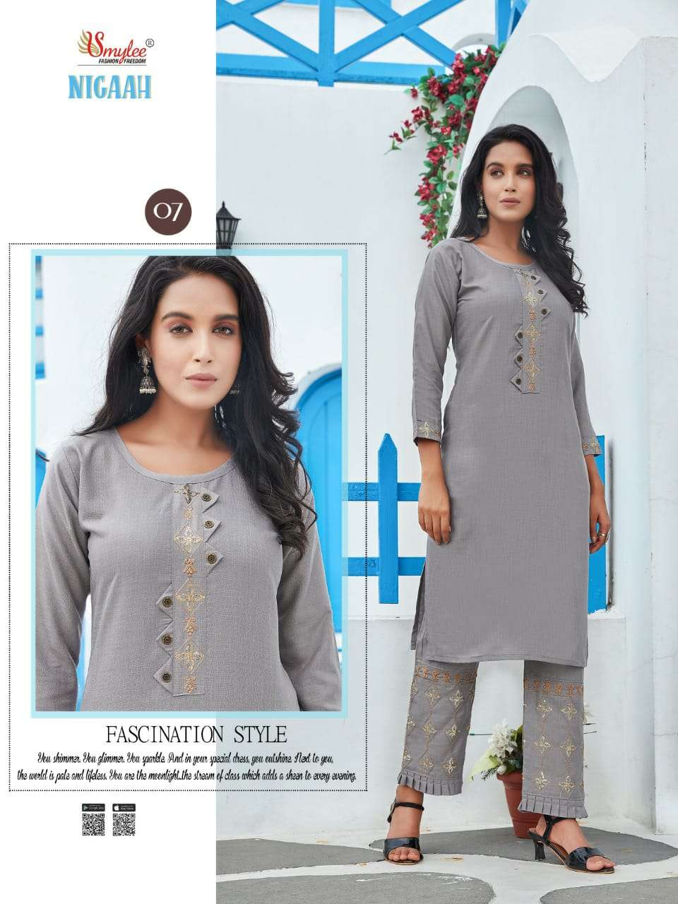 | Other Details | Brand - Rung . Kurti with pant NIGAAH WITH PAINT  CATLOG FEBRIC.                TOP.. HeavY BOMBAY SLUB  WITH   EMBROIDERY & SEQUENCE WORK PC's. 8 Size. M. L. XL. XXXL Rate Wholsale r 525 Per pcs . Set to set. GST 5 Percent Extra. |