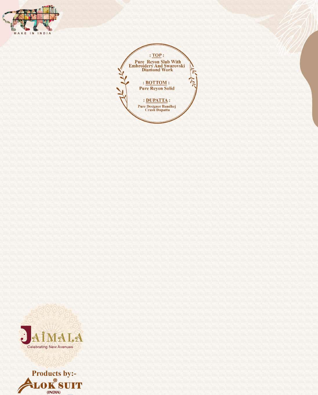 JAIMALA by Alok Suit - Make in India 👑 💃 Fabric Details: 💃 👖 BOTTOM: Pure Reyon Solid 🧣 DUPATTA: Pure Designer Bandhej Crush Dupatta 💫 Rate: 5️⃣9️⃣9️⃣+5️⃣% GST 8️⃣ pcs |