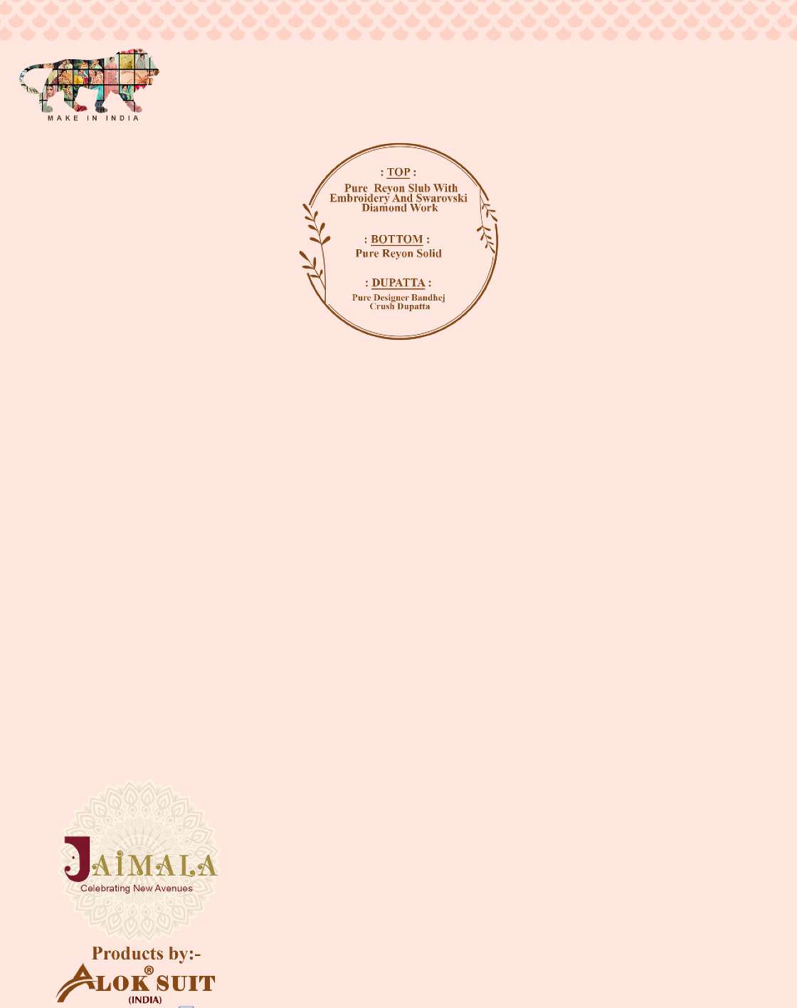 JAIMALA by Alok Suit - Make in India 👑 💃 Fabric Details: 💃 👖 BOTTOM: Pure Reyon Solid 🧣 DUPATTA: Pure Designer Bandhej Crush Dupatta 💫 Rate: 6️⃣2️⃣5️⃣+5️⃣% GST 8️⃣ pcs |