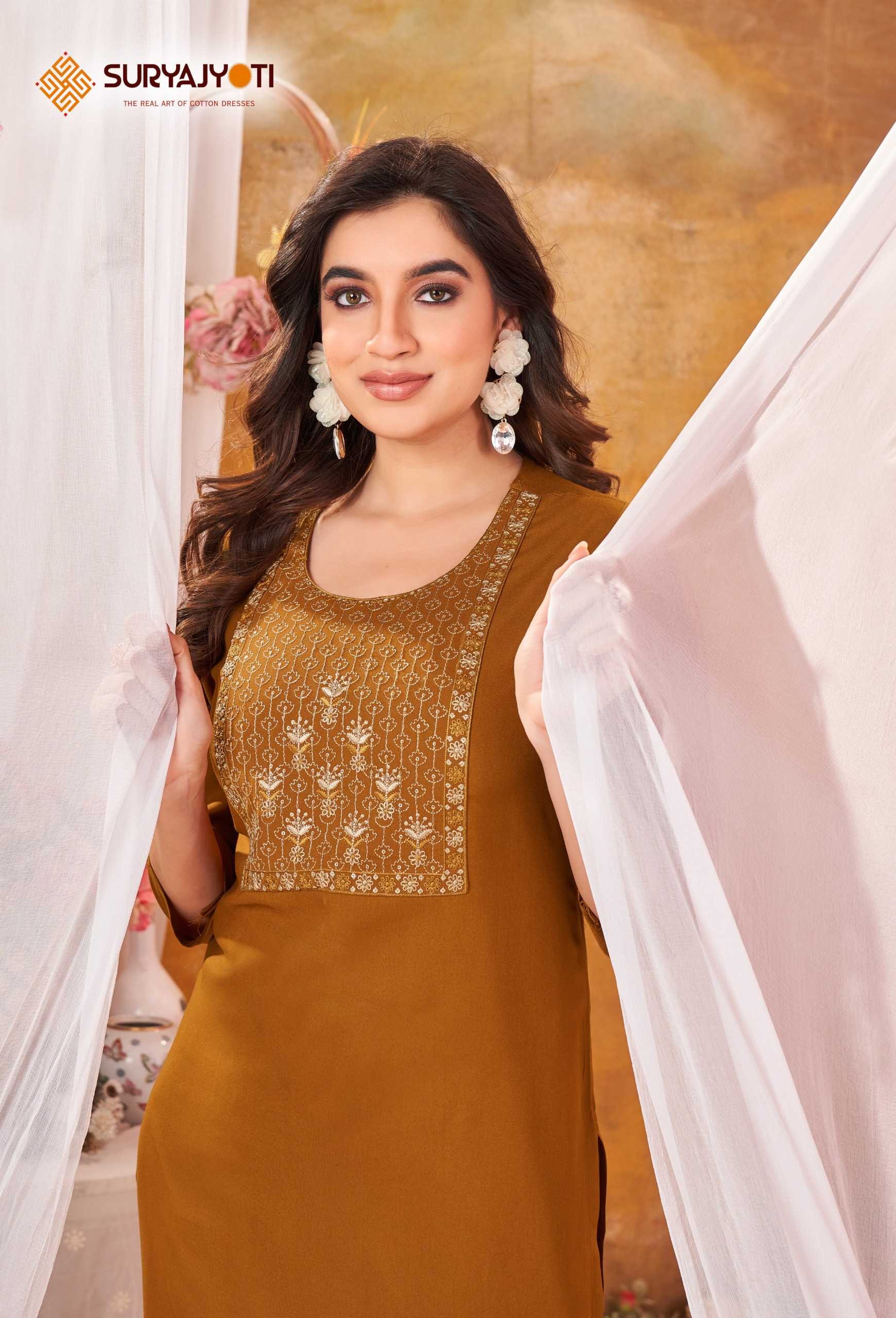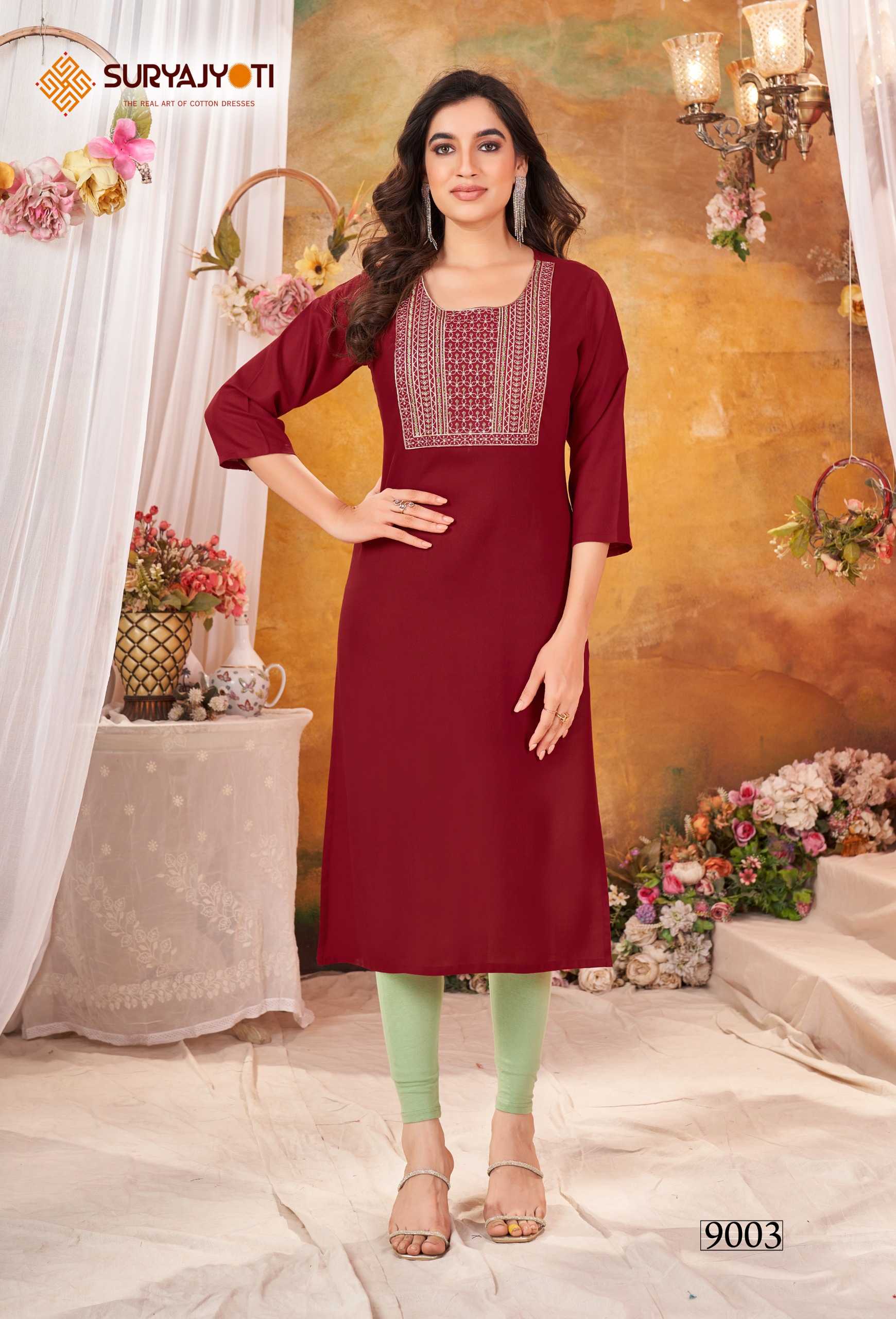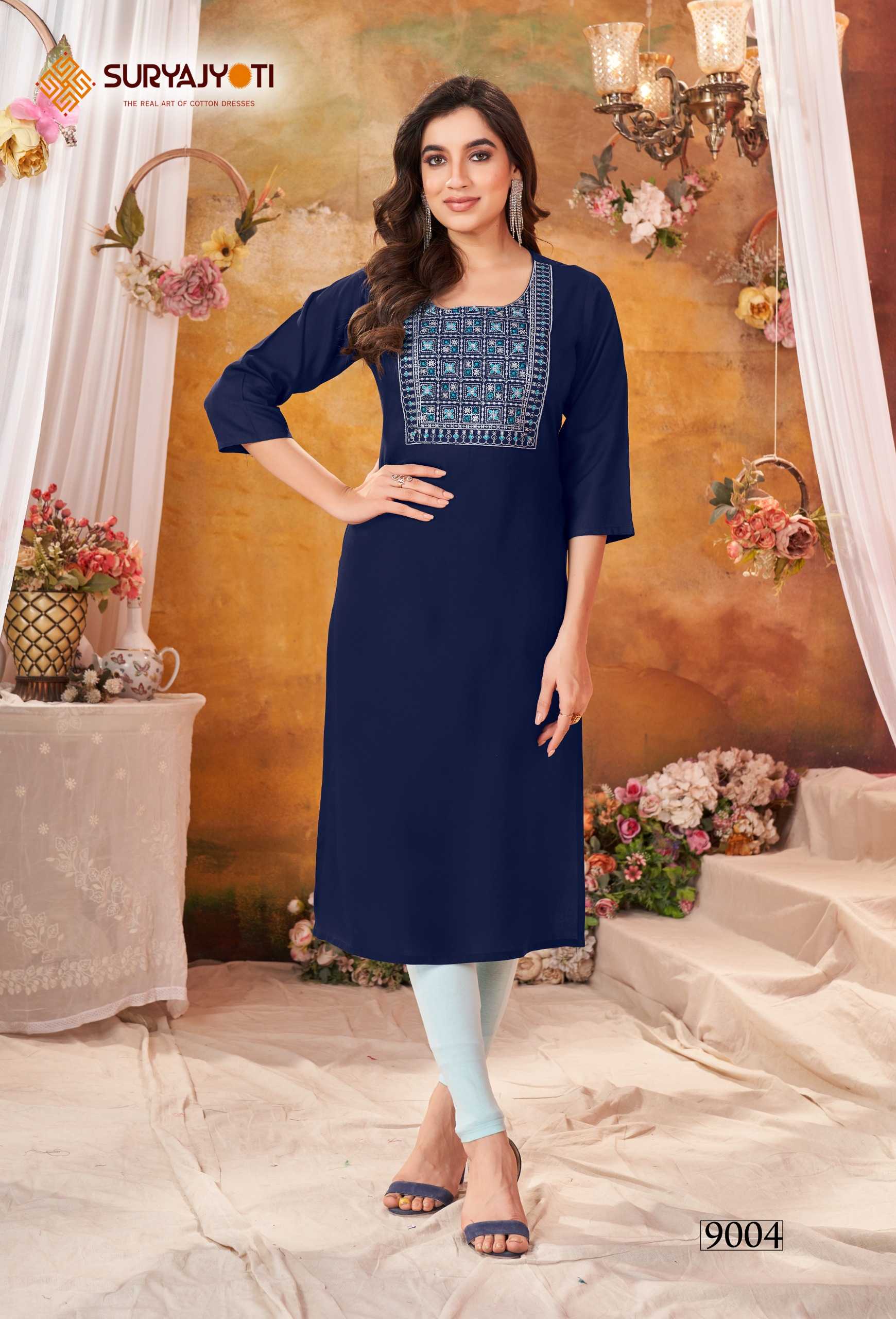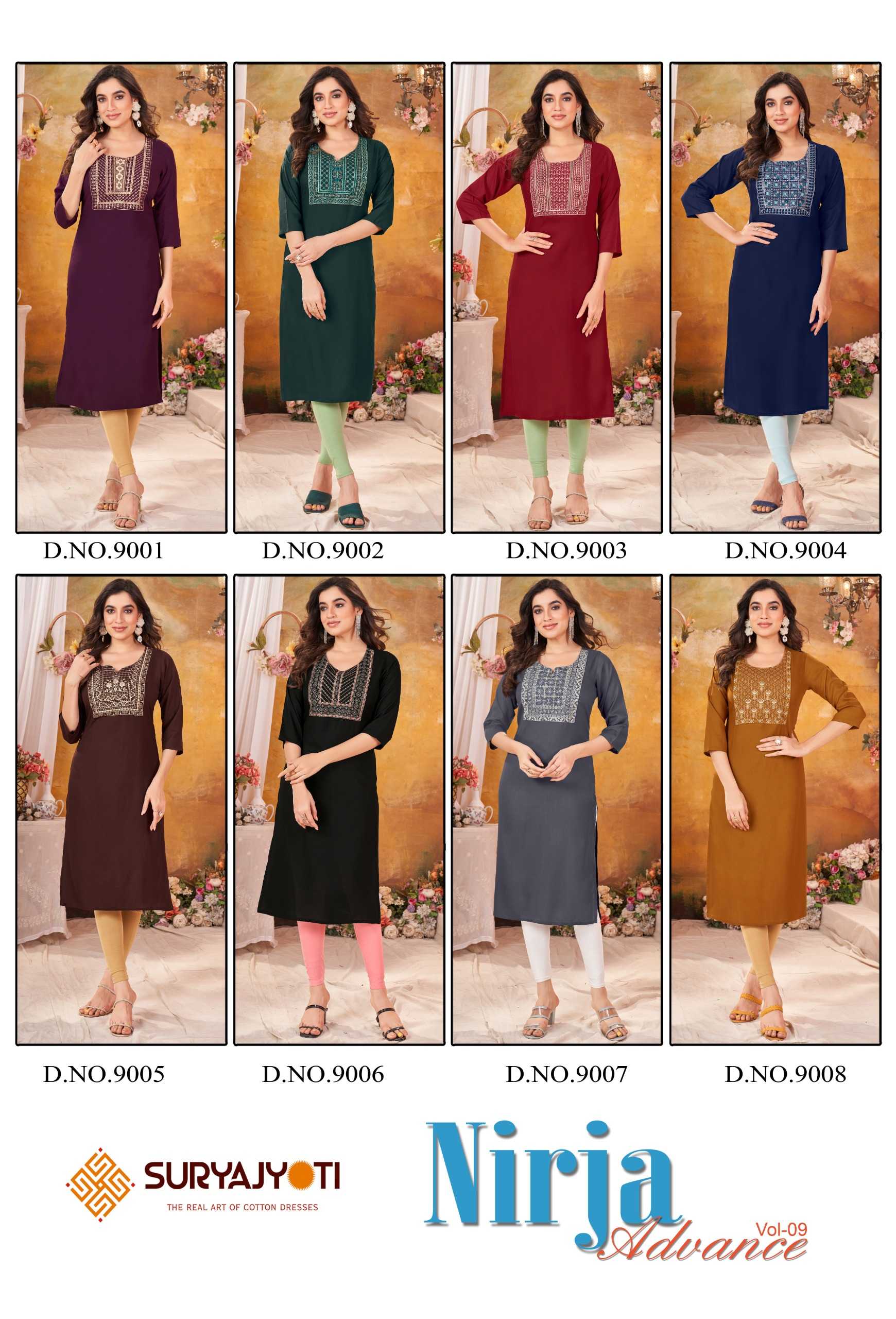 nirja advance vol 9 by suryajyoti rayon pretty look embroidery neck full stitch long kurti