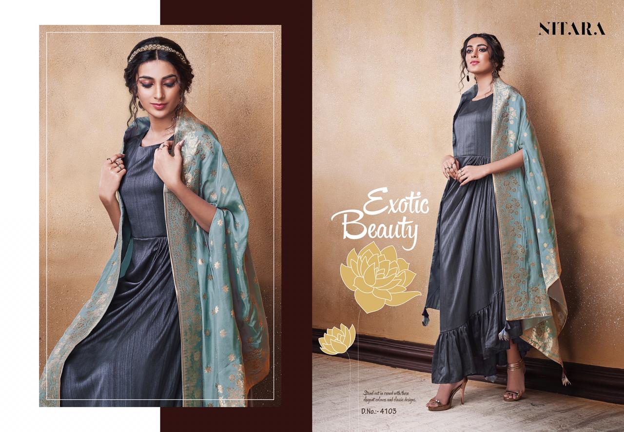 Nitara Lotus Art Dola Silk Latest Collections Gown Style Kurti With Cape Jacket Style Dupatta