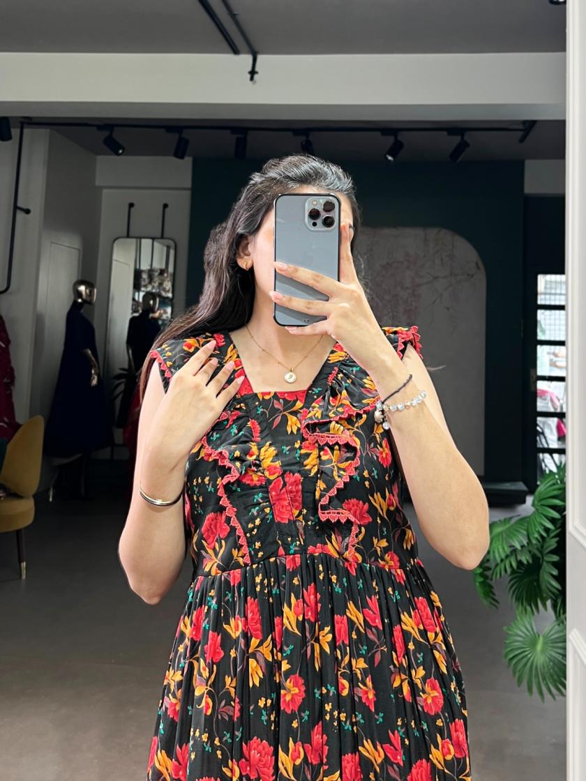 🌷Ethnic Collection🌷 Let the floral prints and silk texture create a story of elegance and charm 🌸 NNK4506BLK Frock (Stitched) Weight : 0.500 KG Rate : 799/- +gst |