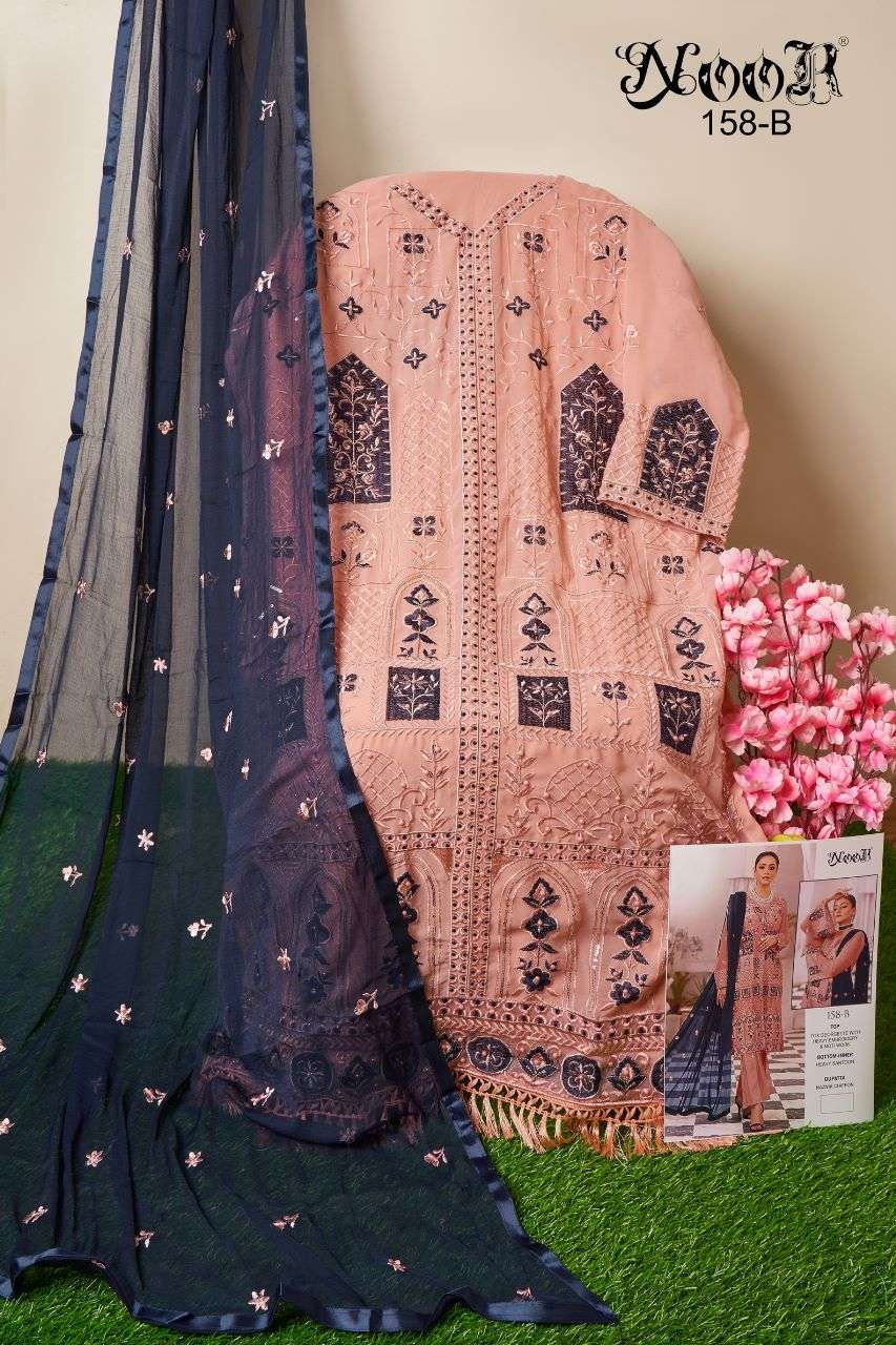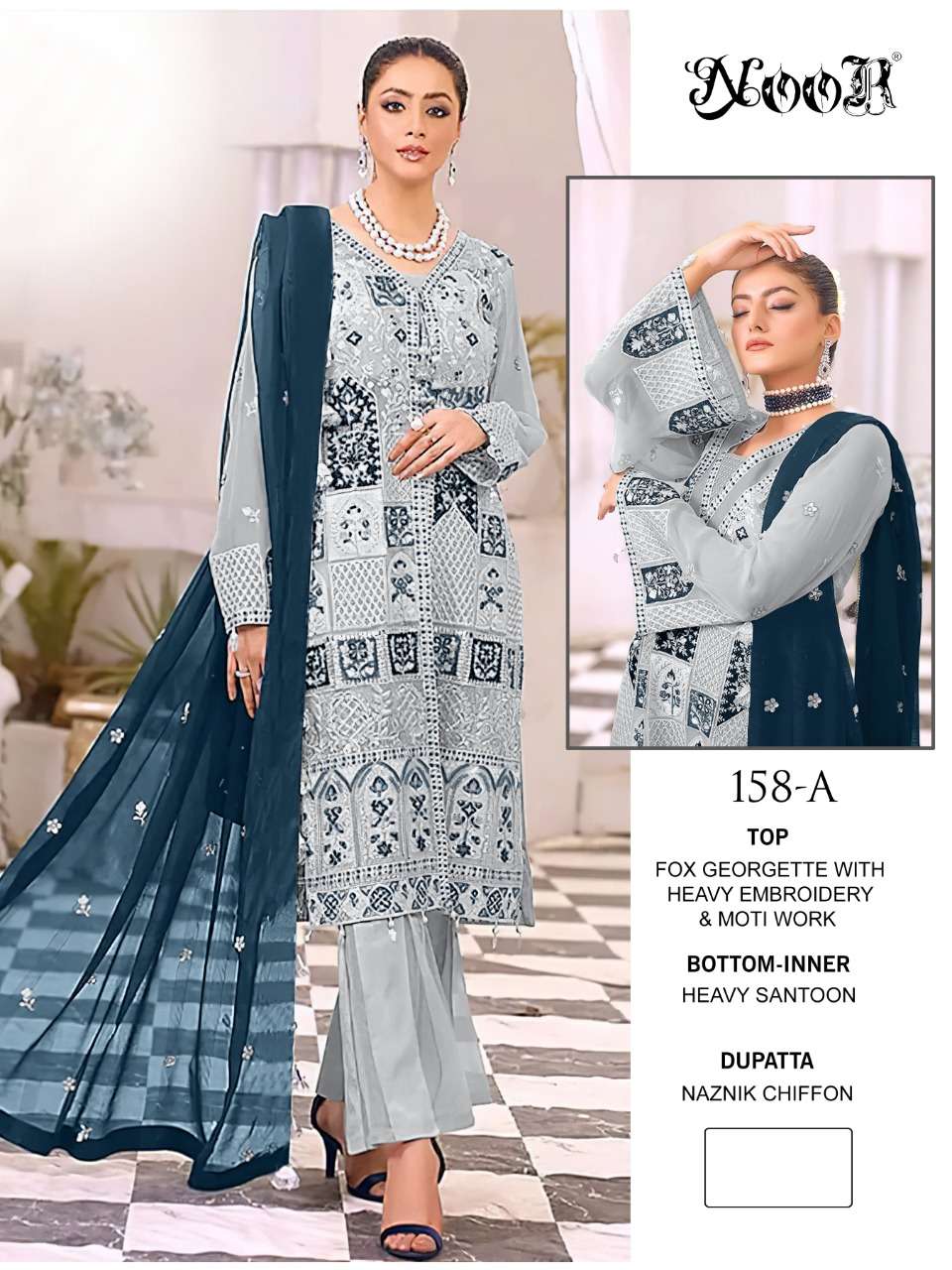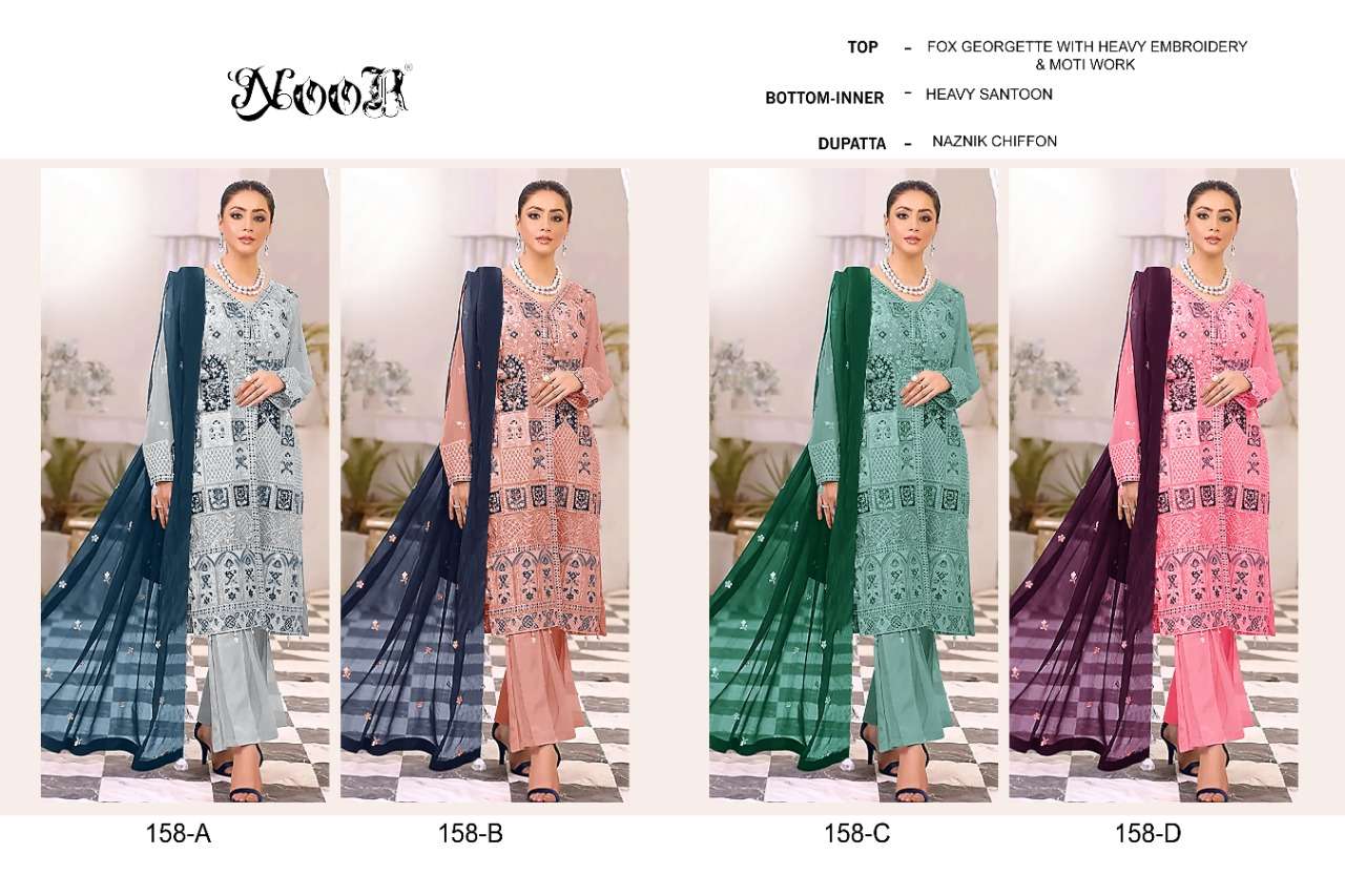 NOOR DNO- 158 TOP- GEORGETTE WITH EMBROIDERY DUPATTA -NAZMEEN BOTTOM - SANTOON-WITH PATCH-WORK RATE = 1099/- |