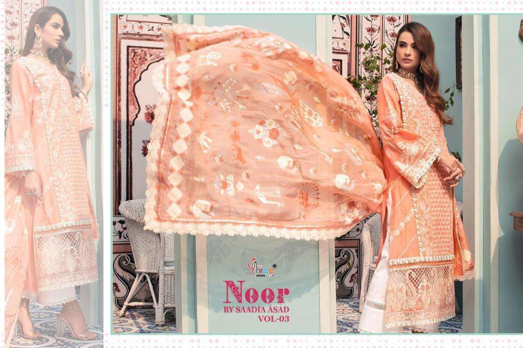 NOOR BY SAADIA ASAD VOL 3 TOP PURE COTTON WITH SIFLY & HEAVY SELF EMBRODERYÂ BOTTOM SEMILAWNÂ DUPPTA TABY SILK / EMBRODERD NETÂ RATE 1199+ GST DESIGNS 5 Shree fabs surat |