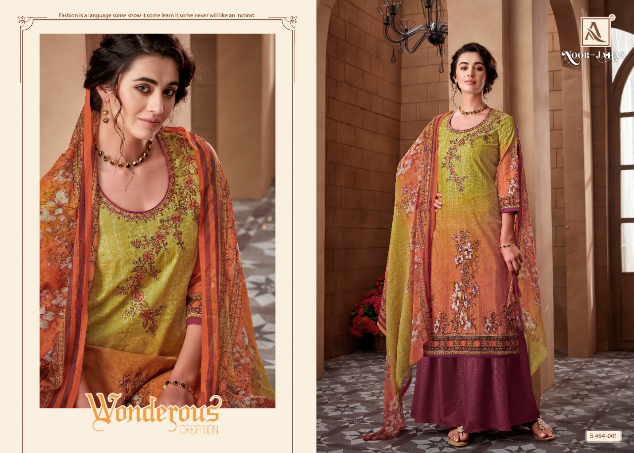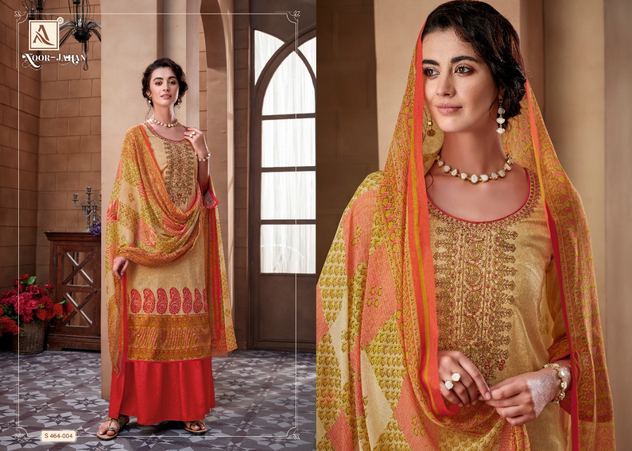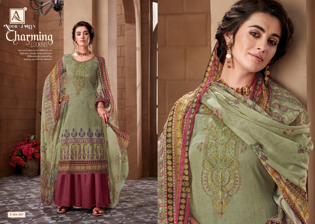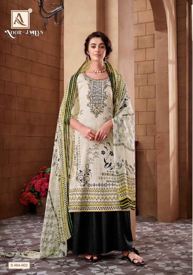 ALOK SUIT NOOR-JAHAN - Incredible Printed Collection Here Alok Suit presents a very fresh Printed collection - NOOR-JAHAN. Fabric Details: Top: Pure Loan Cotton Digital Print with Fancy Thread Embroidery & Swarovski Work Bottom: Pure Cotton Solid Dupatta: Pure Chiffon Digital Style Fancy Print The single set of dresses contains: 8⃣Pcs Really affordable rate: ₹5⃣8⃣5⃣ + 5⃣% GST |