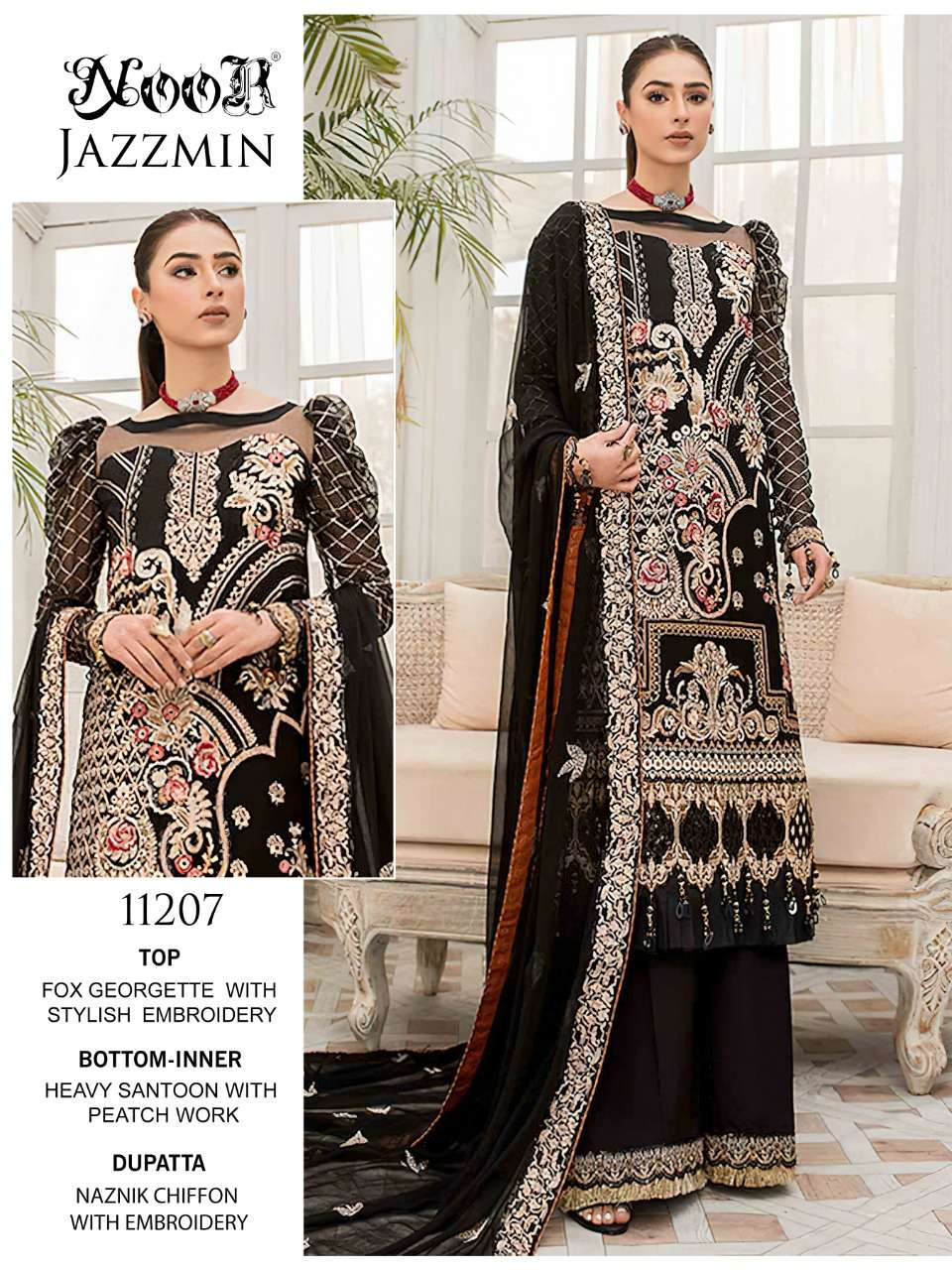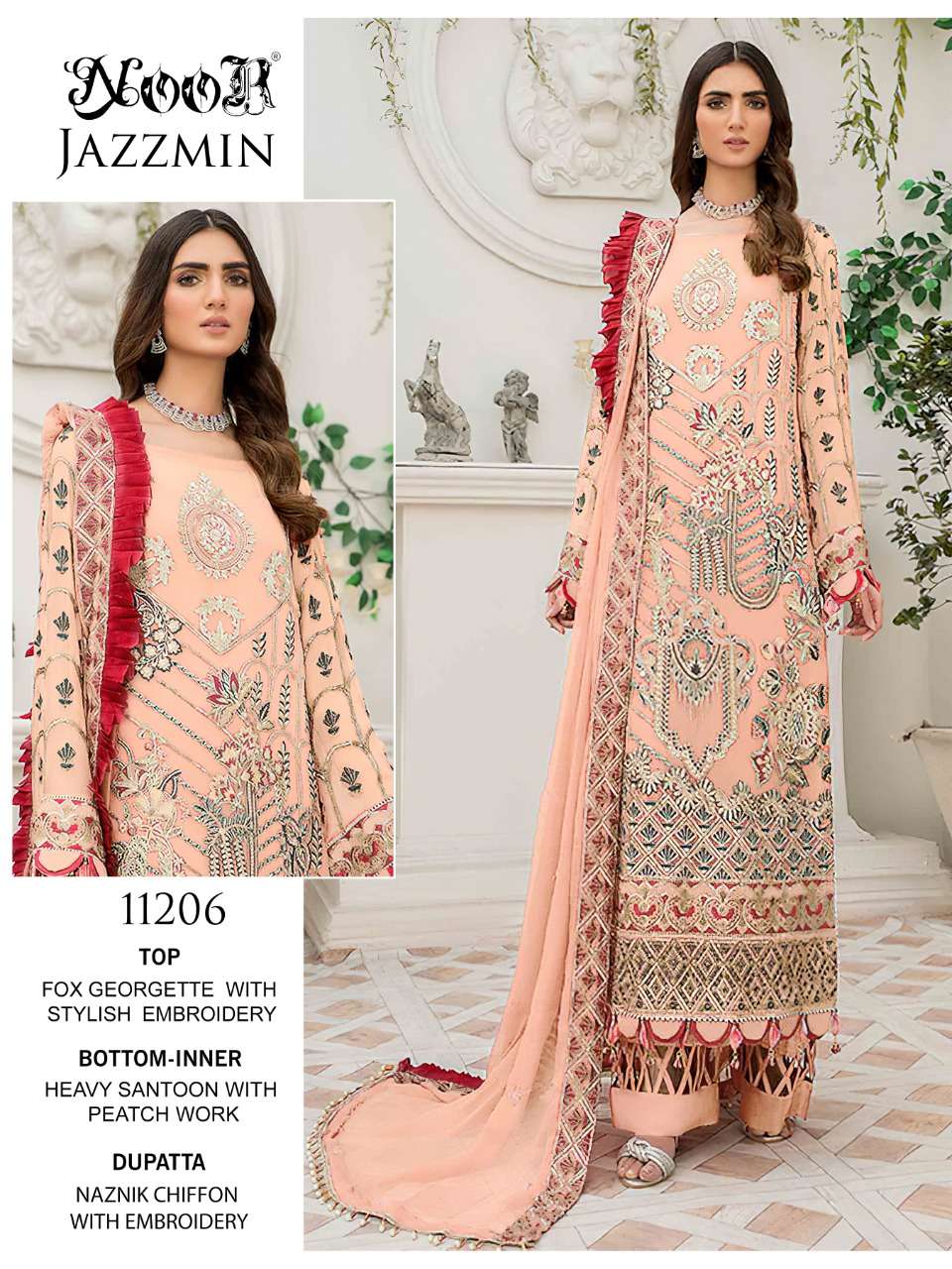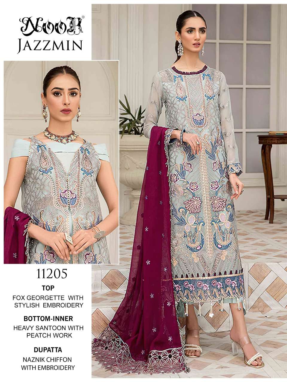 🙏🏻Dear 💕 NOOR JAZZMIN🌲 👇🏻Fabric details 👇🏻 👗 Top : Greogette/ Netwith Heavy Embroidery 👖Bottom inner- Dul Shantun 🔺Dupatta : Naznik WITH HEAVY EMBROIDERY BODER