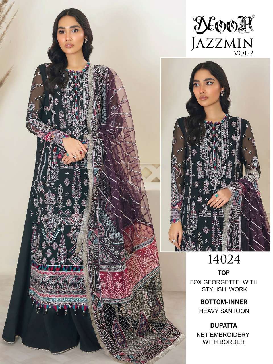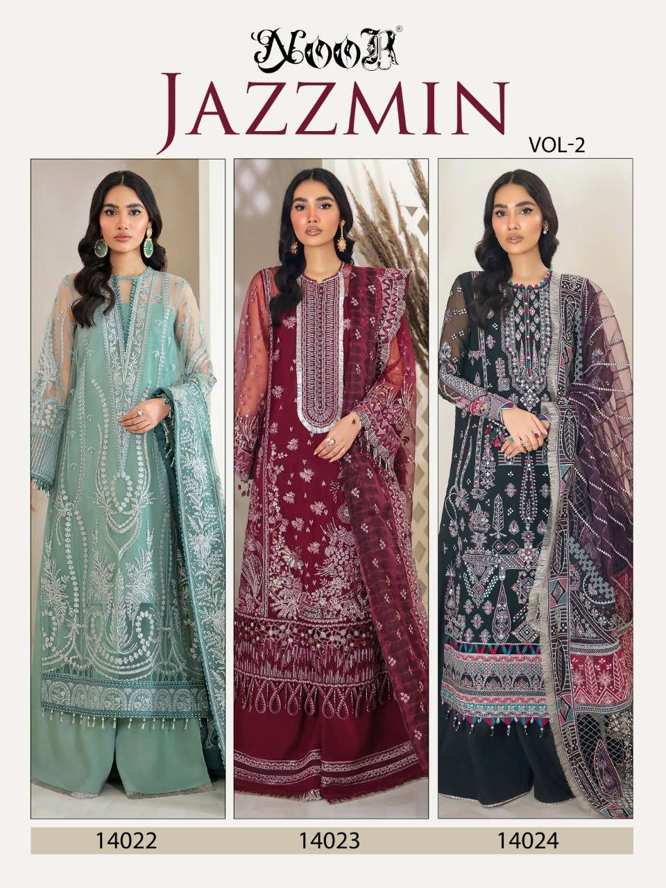 🎁Today NOOR ®️*hitting market again with exclusively trending series of pakistani *concepts 💕 NOOR JAZZMIN vol_2🌲 👇🏻Fabric details 👇🏻 👗 Top : Greogette/ Netwith Heavy Embroidery 👖Bottom inner- Dul Shantun 🔺Dupatta : Net WITH HEAVY EMBROIDERY BODER