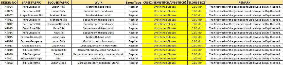 | Note | Stitching available on customer Requirment For Sarees , Salwar Kameez, Lehengha.(i.e M,L,XL,XXL). |