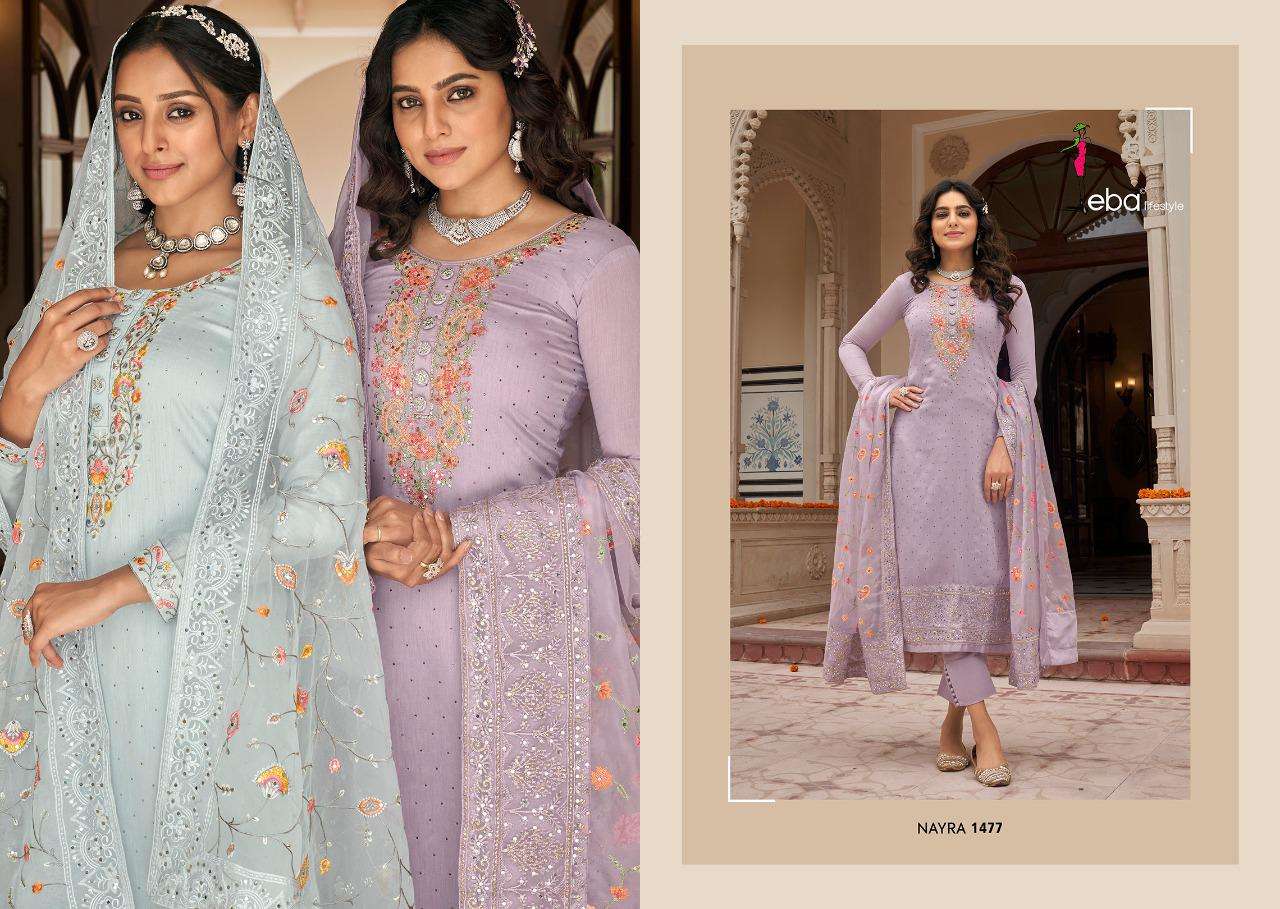 eba lifestyle Nyra vol -5 Top - pure viscose maheshary silk with hevey emboidery Duppta - organza with hevey emboidery Bottom- dull santoon Rate 1999/- Design - 4 pc |