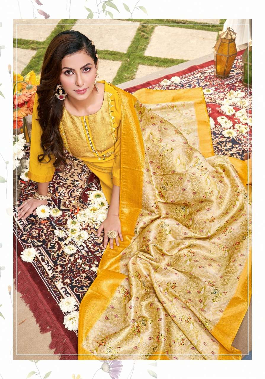 Vivils Silk Mills Pvt LTD OCCASSION VOL 2 KURTI + PANTS + DUPPATA Fabric - ROMAN SILK PANTS - ROMAN SILK DUPPATA - PURE JAQUARD WITH DIGITAL ( SILK BASE ) WORK - EMBROIDERY WITH HANDWORK Length - 47 inches Price - 1399 /- + G S.T Size - M (38) L (40) , XL ( 42 ) , XXL ( 44 ) , 3xl ( 46) QUANTITY - 4 PCS Dispatch date - 7th JAN |