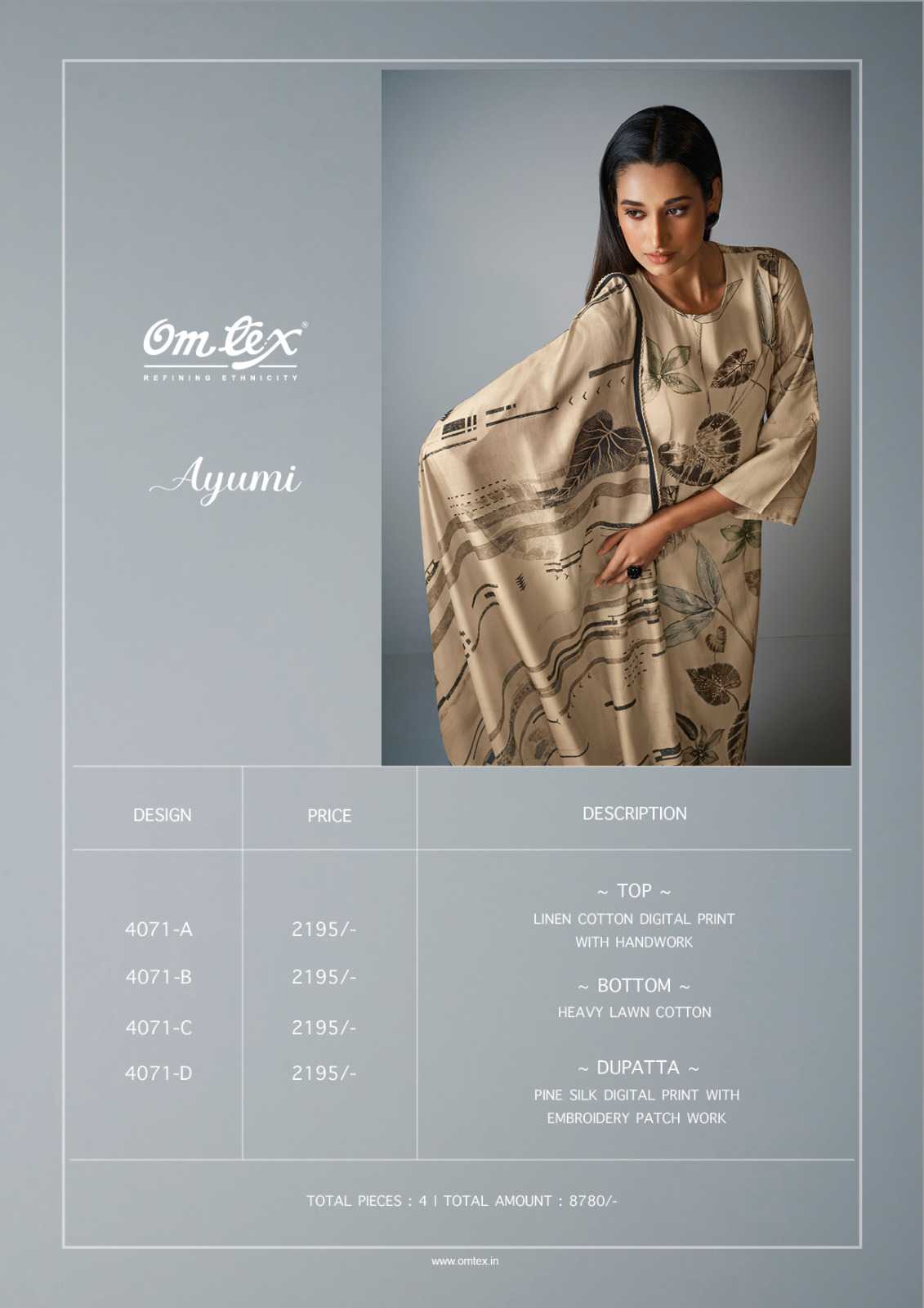 Om Tex Presents Latest Collection Launched on 16-04-2024. Presenting Beautiful collection of 4 PCS with Unstitched .