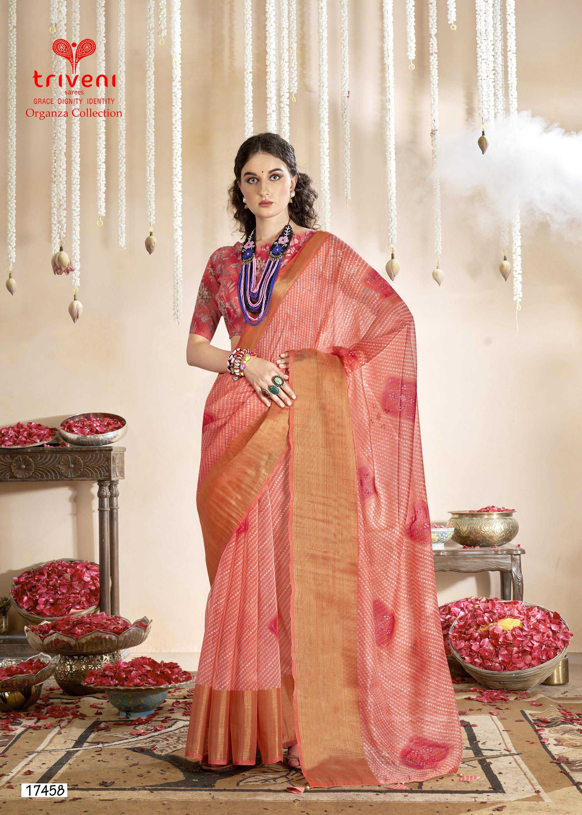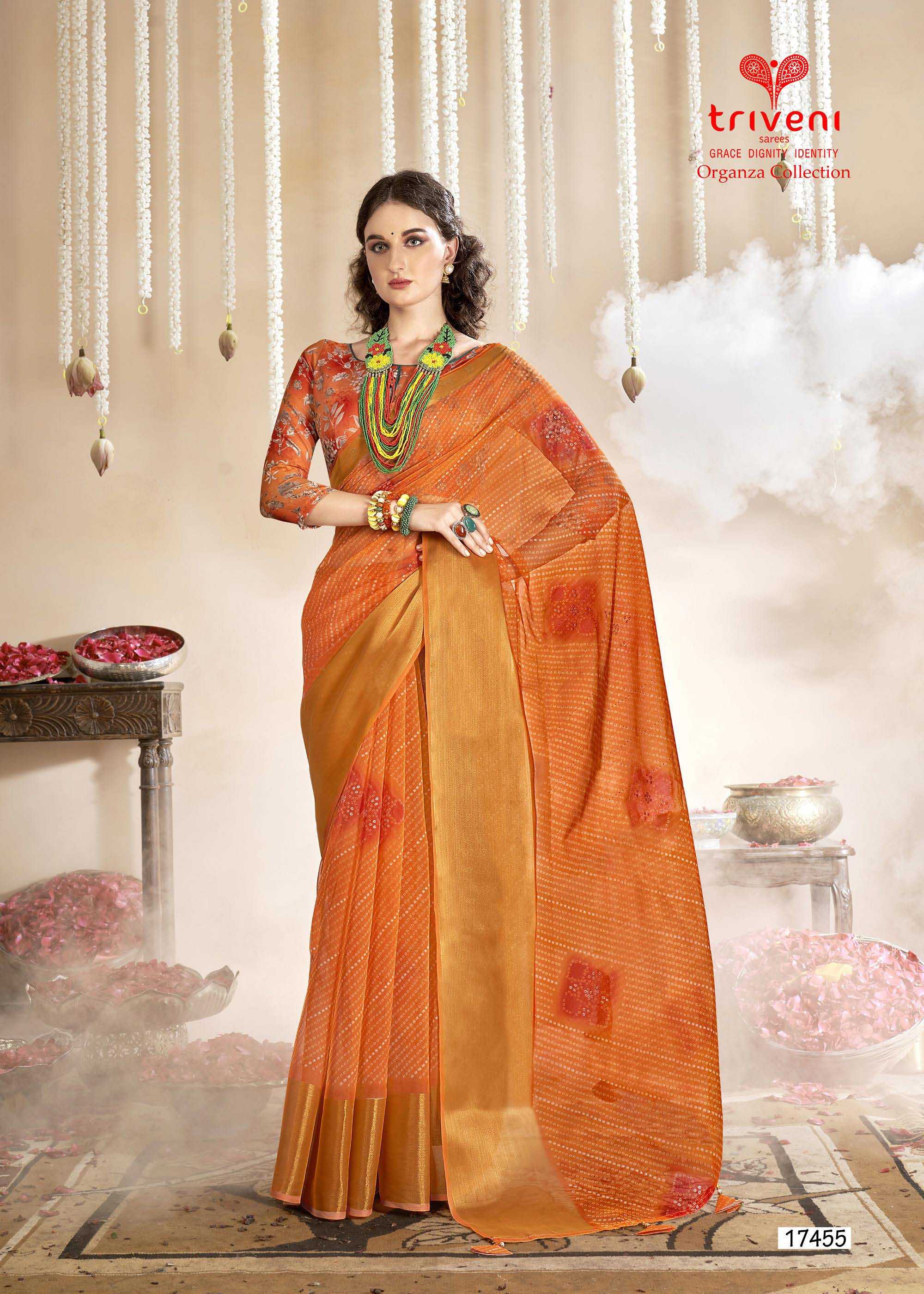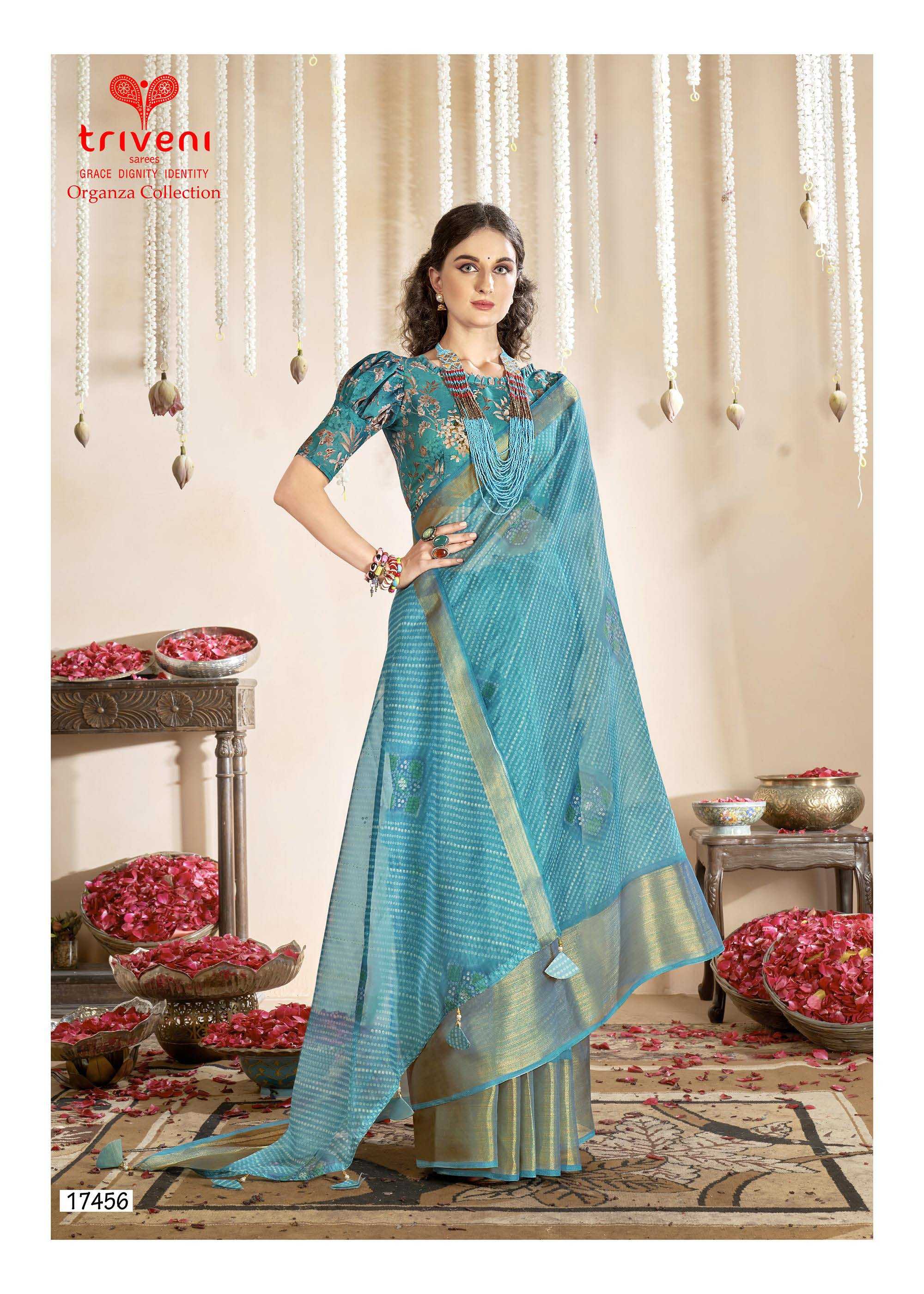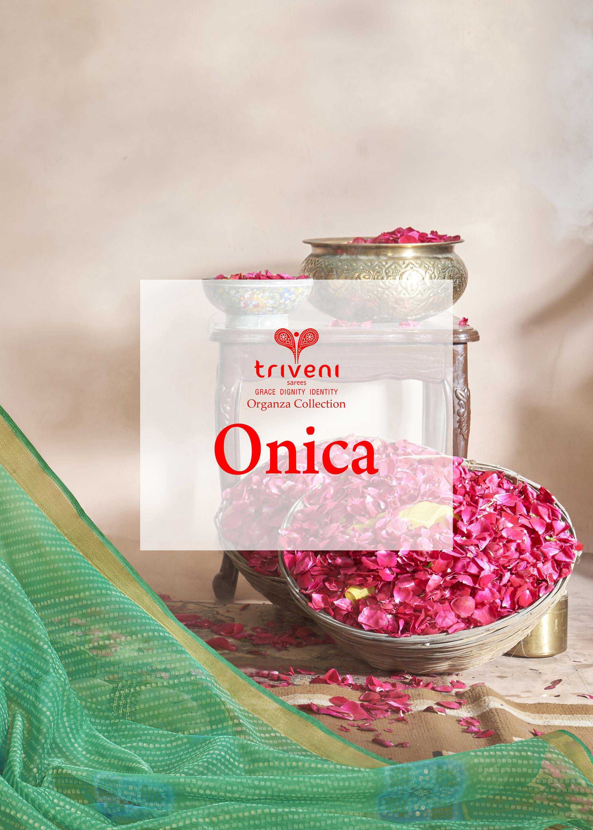 onica by triveni 17451-17458 series new launch fancy organza saree supplier