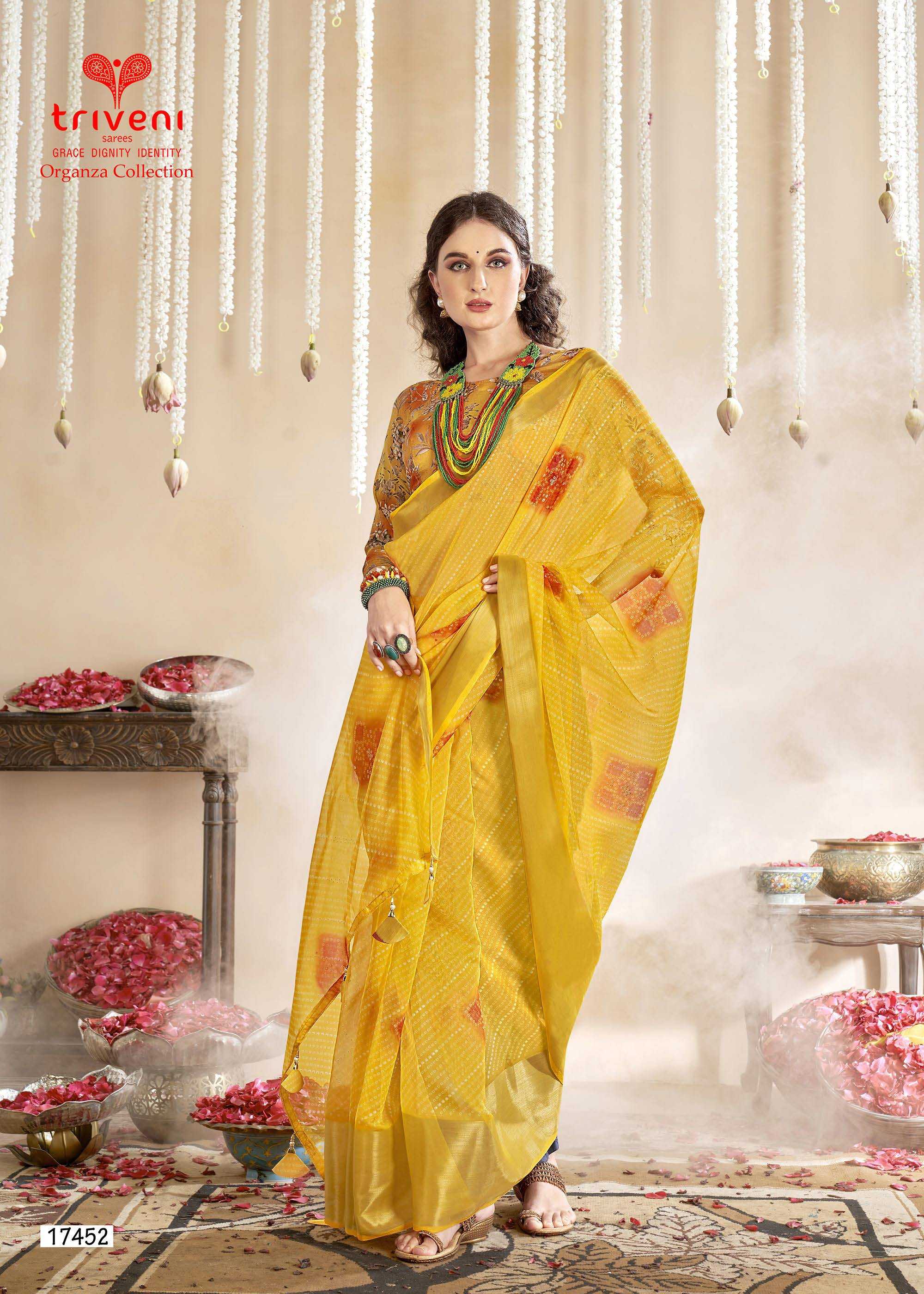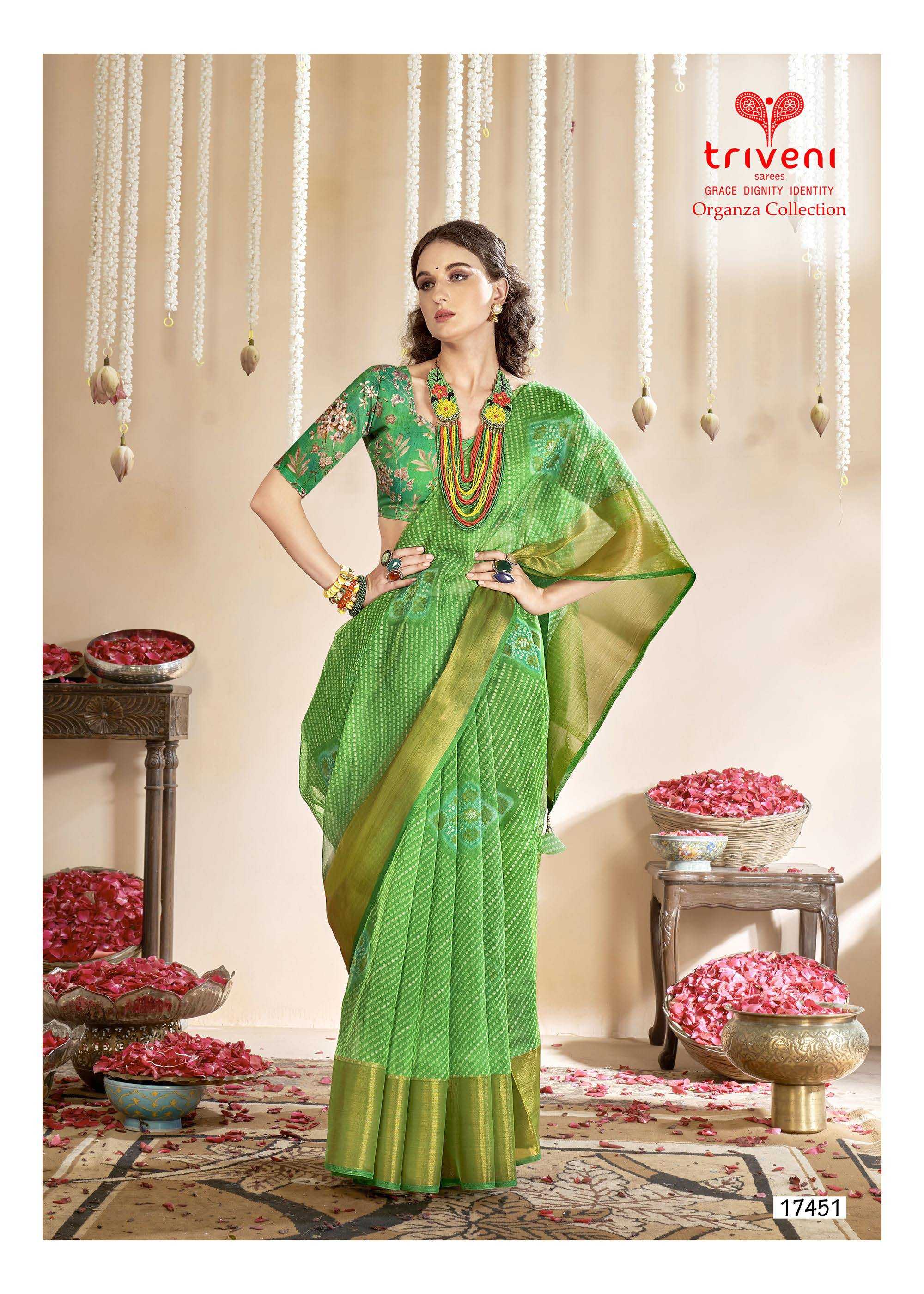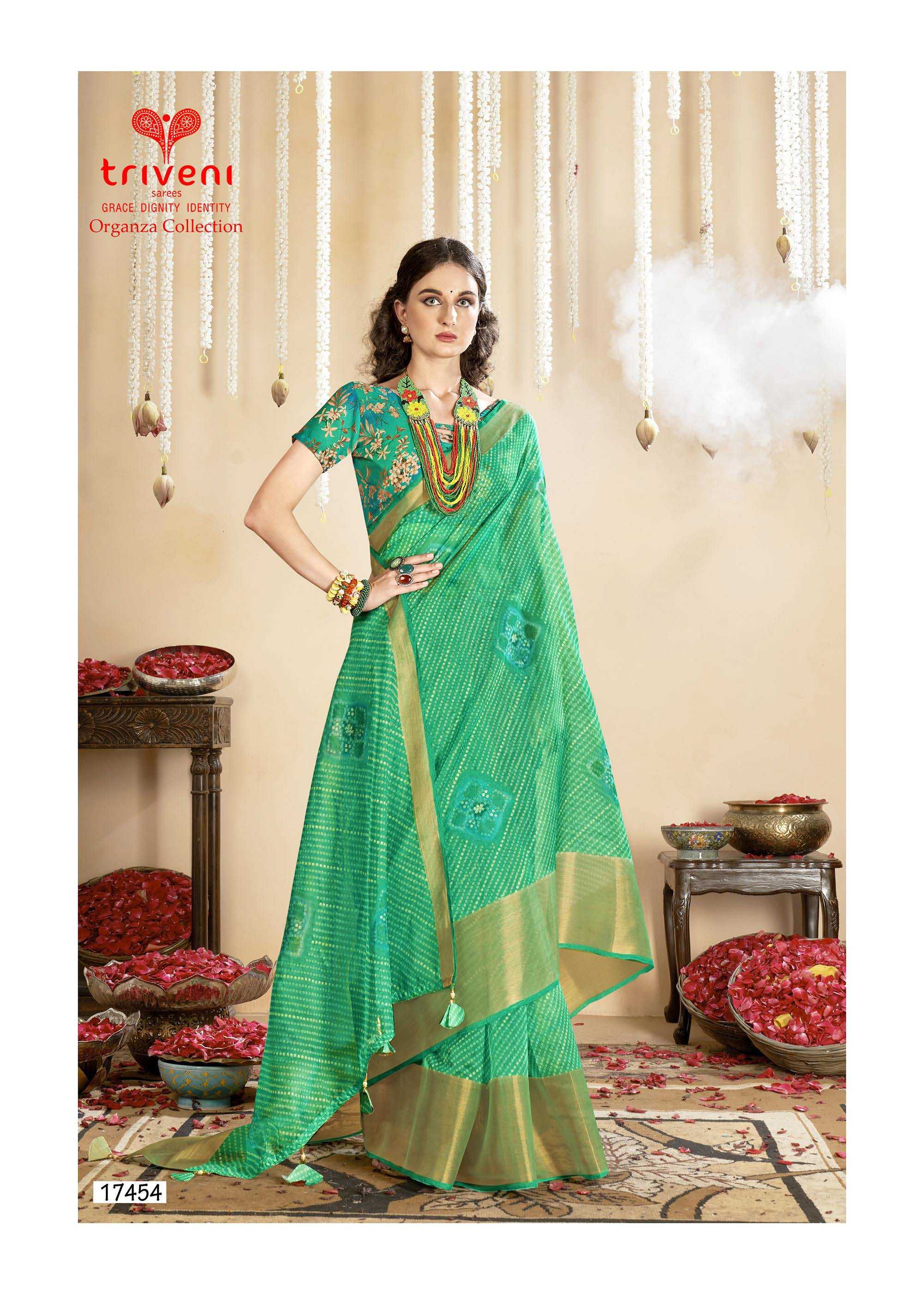 onica by triveni 17451-17458 series new launch fancy organza saree supplier