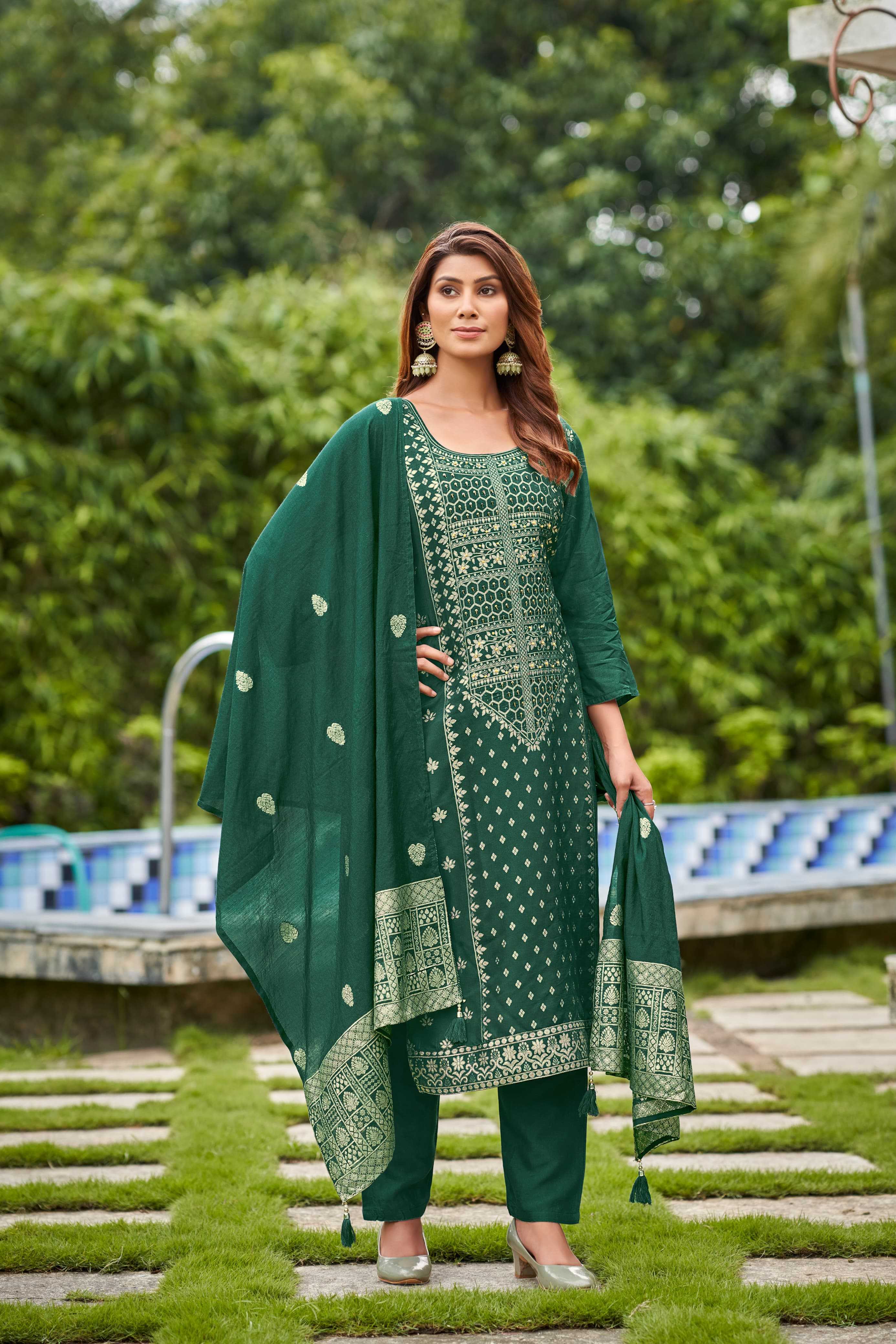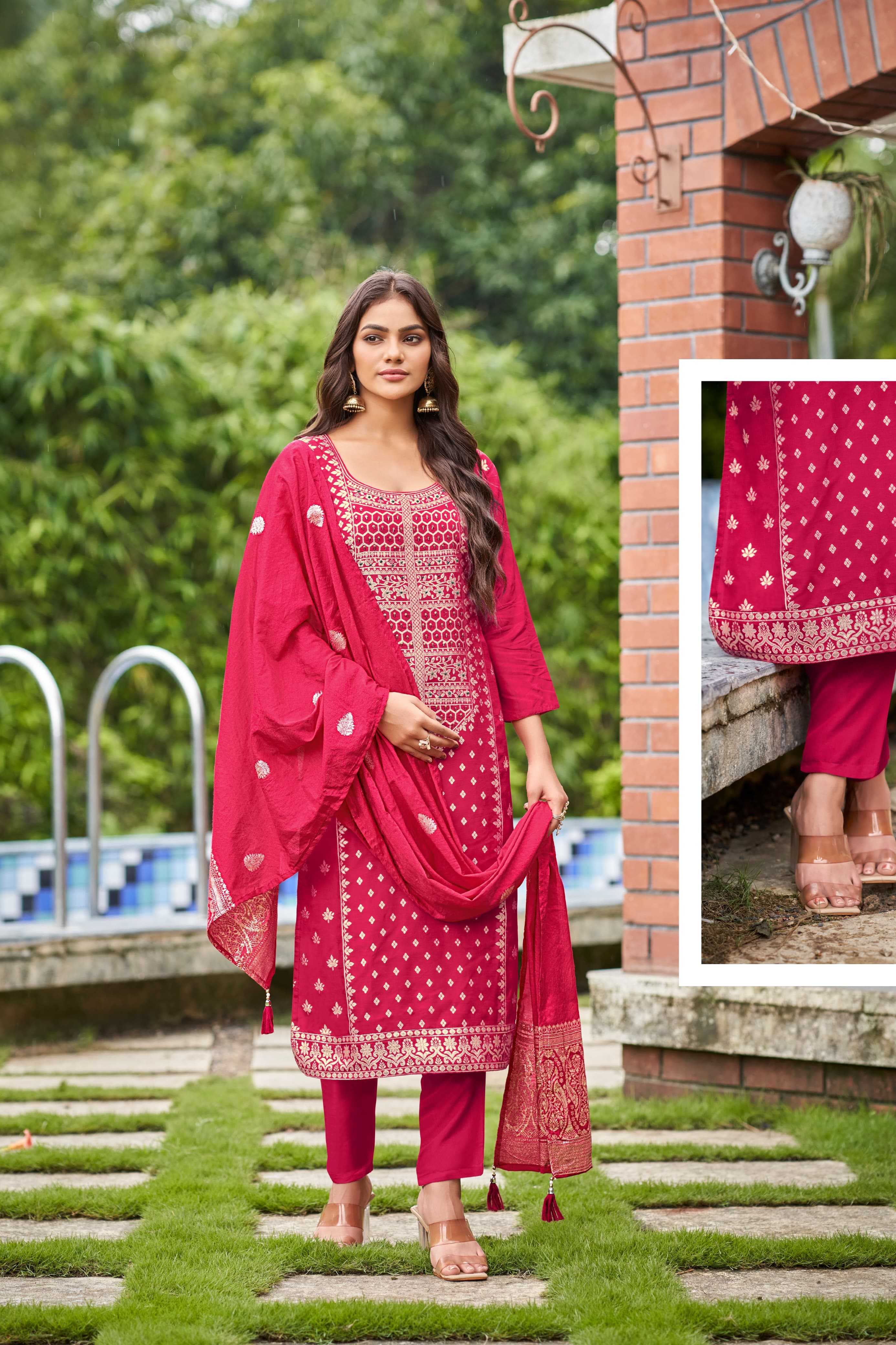 👏🏻👏🏻 Catalouge : 💃 BANARASI 💃 Festive Collection Fabric in Top : Viscos Dola silk Jacquard with astar Sleeves type : 3/4th Rate : 1480/- per pcs + GST 5% Set to set FEELING AWESOME 😊 |