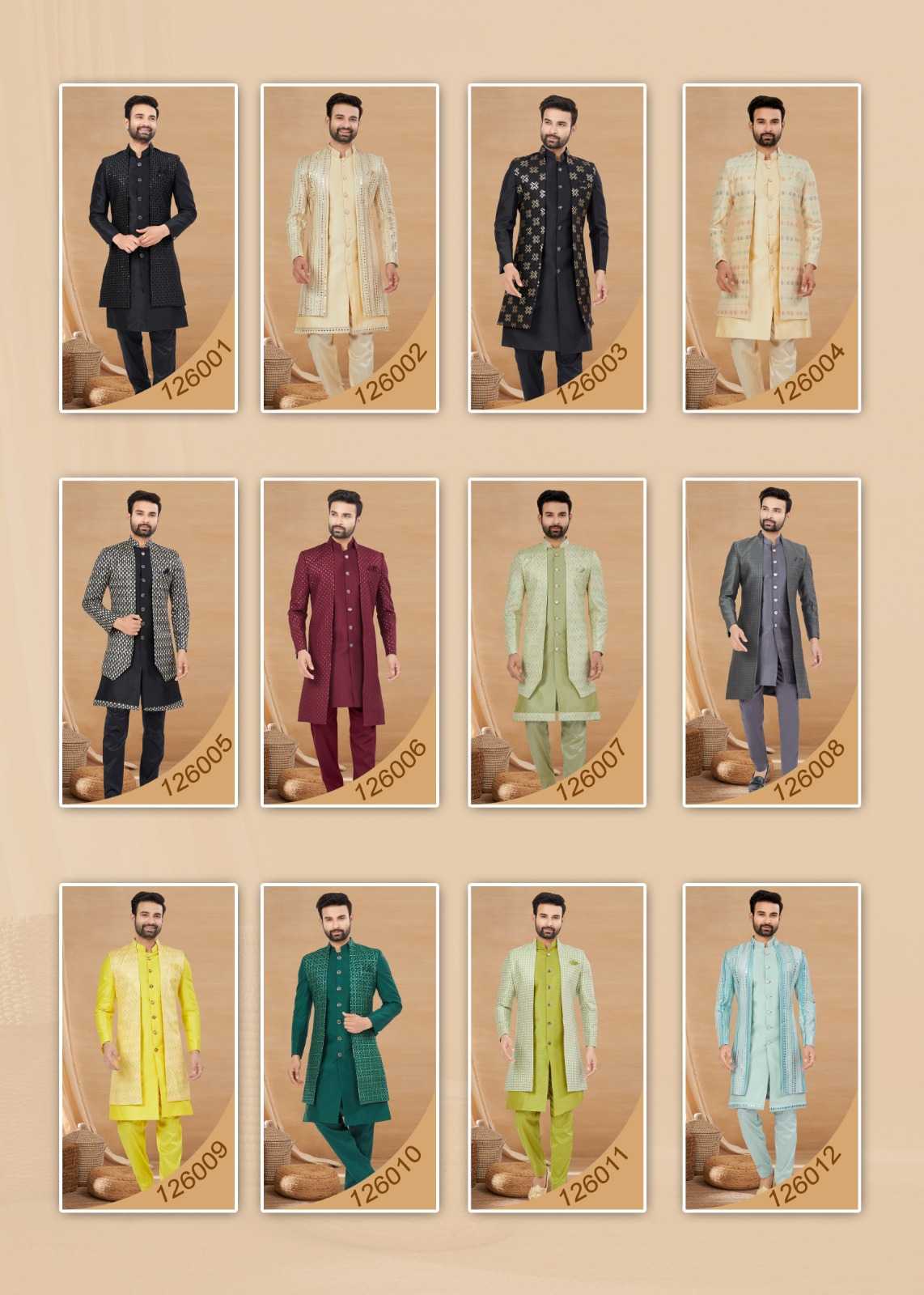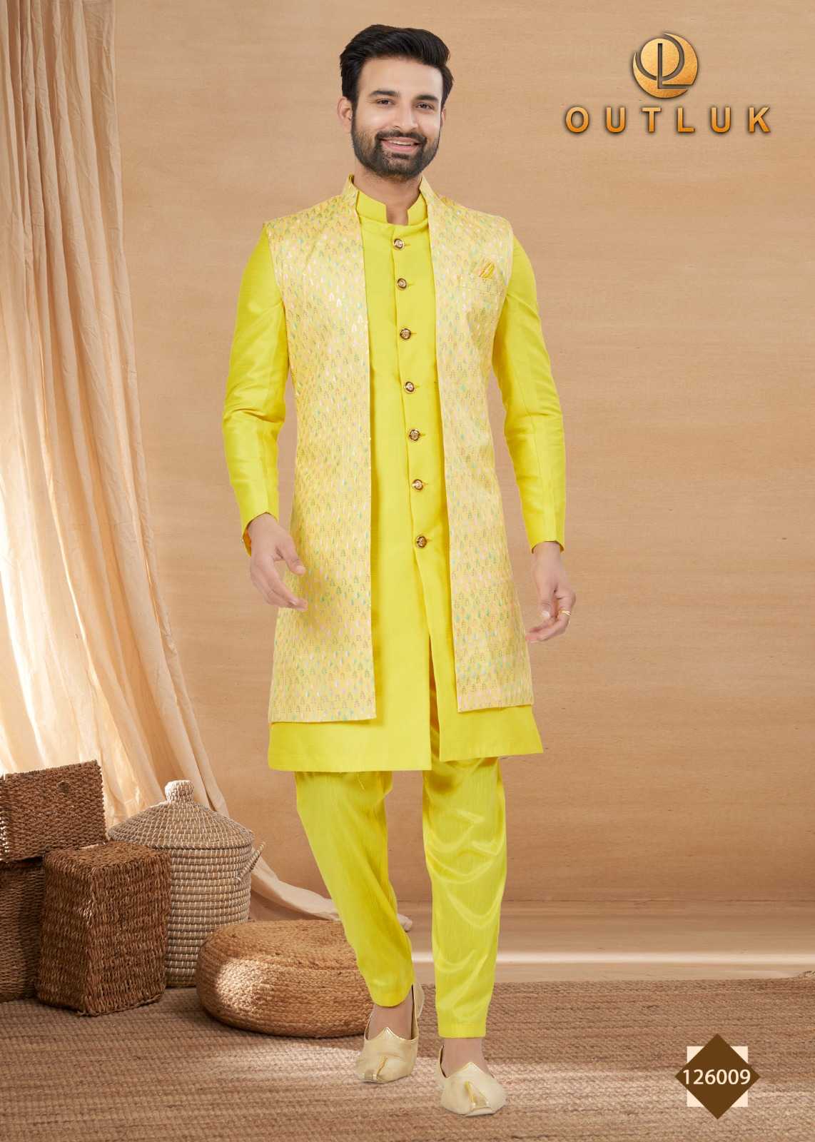 Indo Western and Sherwani Catalog Name: Outluk Premium Series Vol 126 â–ª Jacket Fabric :- Pure Viscos and Jacquard Fabric â–ªKurta Fabric :- Heavy Art Silk with Double Finish â–ªPajama Fabric :- Heavy Art Silk with Double Finish â–ªTotal Design:- 12 pcs â–ªSize:- 32 to 44 (If you want Bigger size then 20% extra charge size 46 to 52) â–ªWork:- Mirror, Thread and Sequence Work Rate - Price List Attached/- |