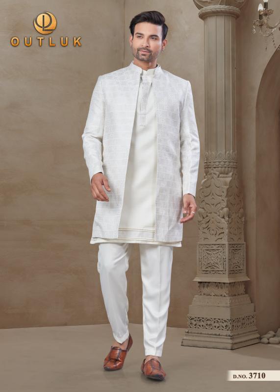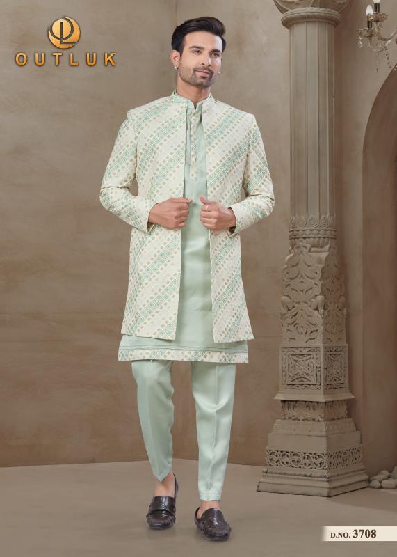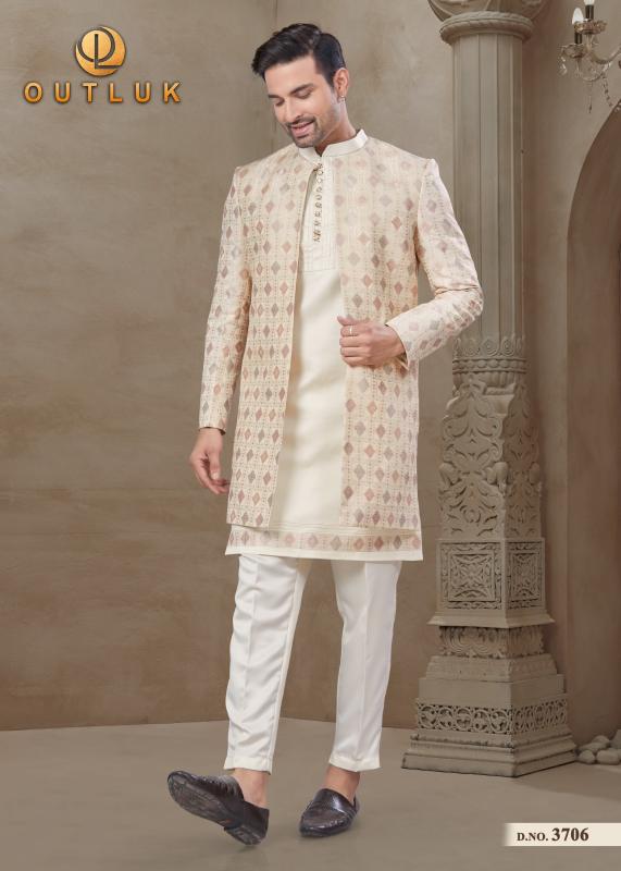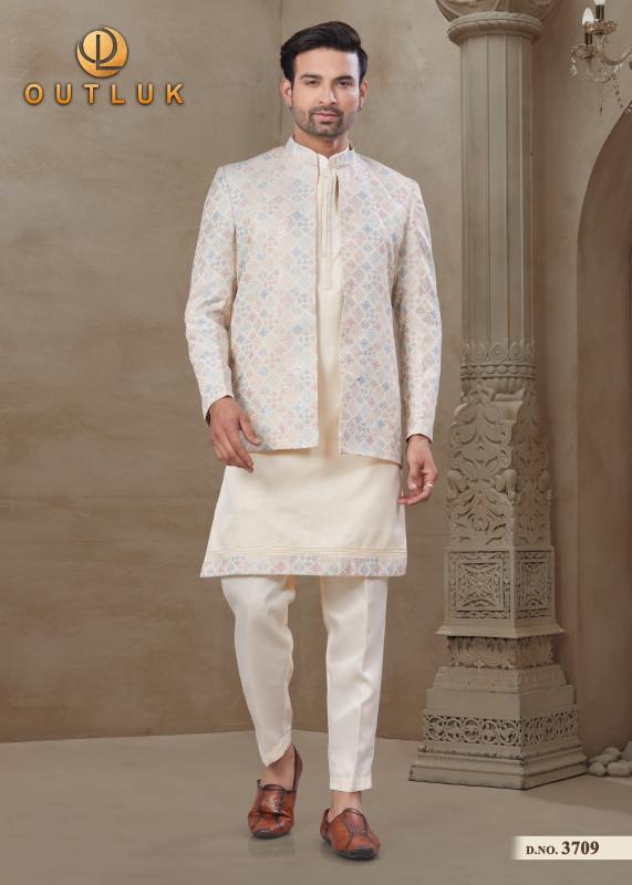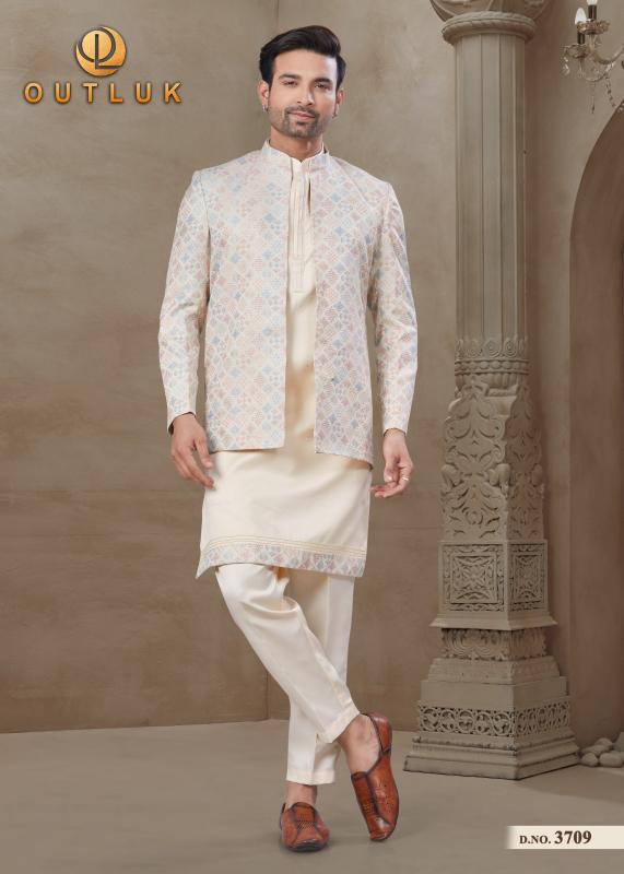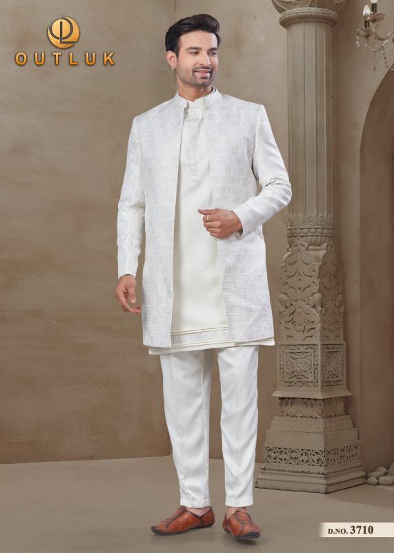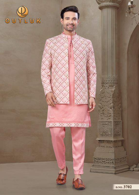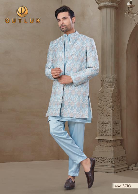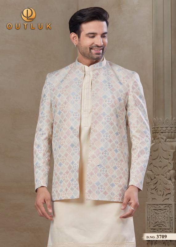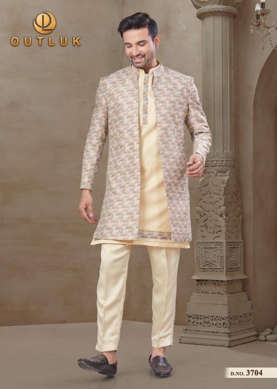 Indo Western Catalog Name: Outluk Premium Series Wedding 37 ▪️ Jacket Fabric :- Mysore SilK and Jacquard Silk With Position Print ▪Kurta Fabric :- Malai Silk ▪Pant Fabric :- Malai Silk ▪Total Design:- 12 pcs ▪Size:- 32 to 46 (If you want Bigger size then 20% extra charge size 48 to 52) ▪️Work:- Position Print with Embroidery Work Rate- Rs.4495/- per pcs 📝Booking started from now... Set And Single Available *Delivery 4-5 Working Days after Confirm GST-12 Extra |