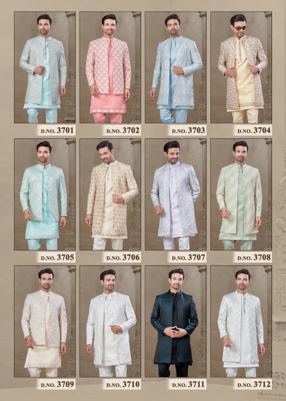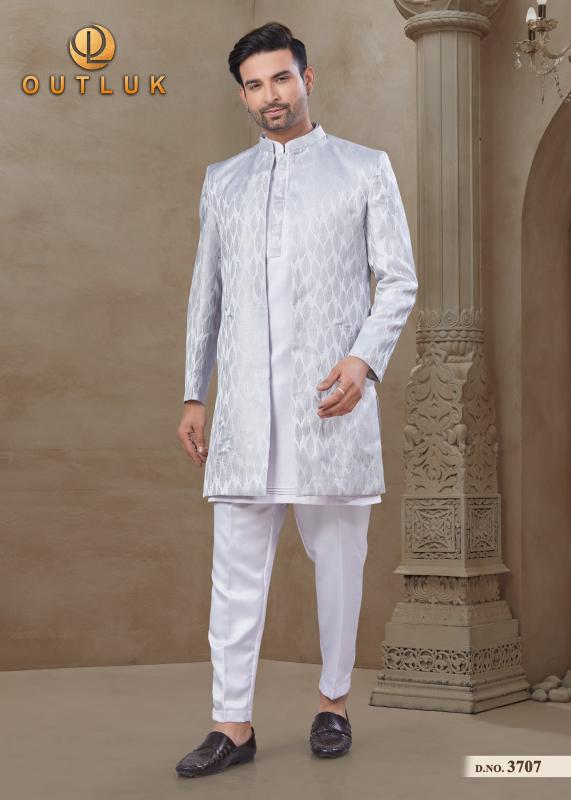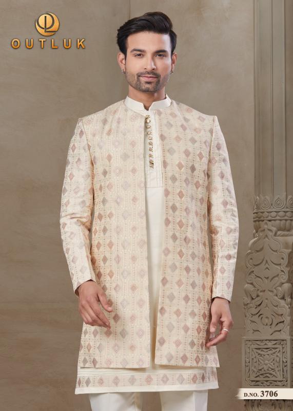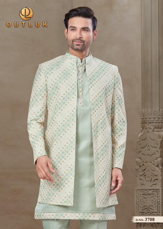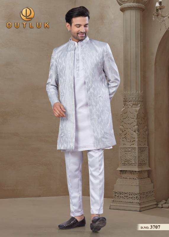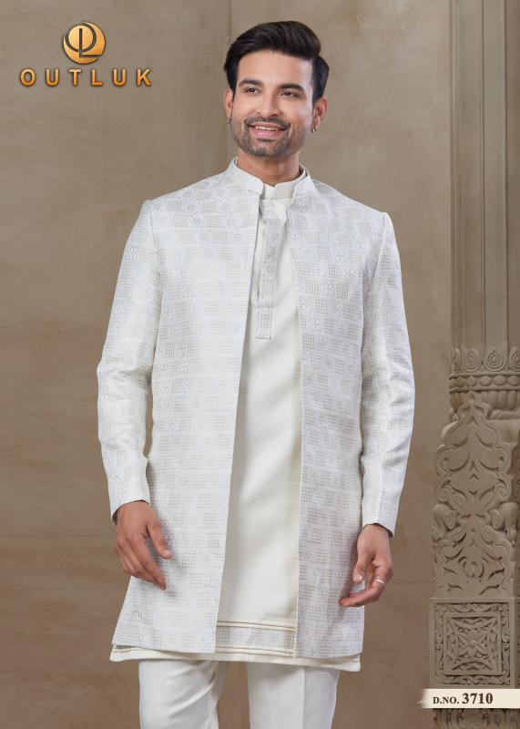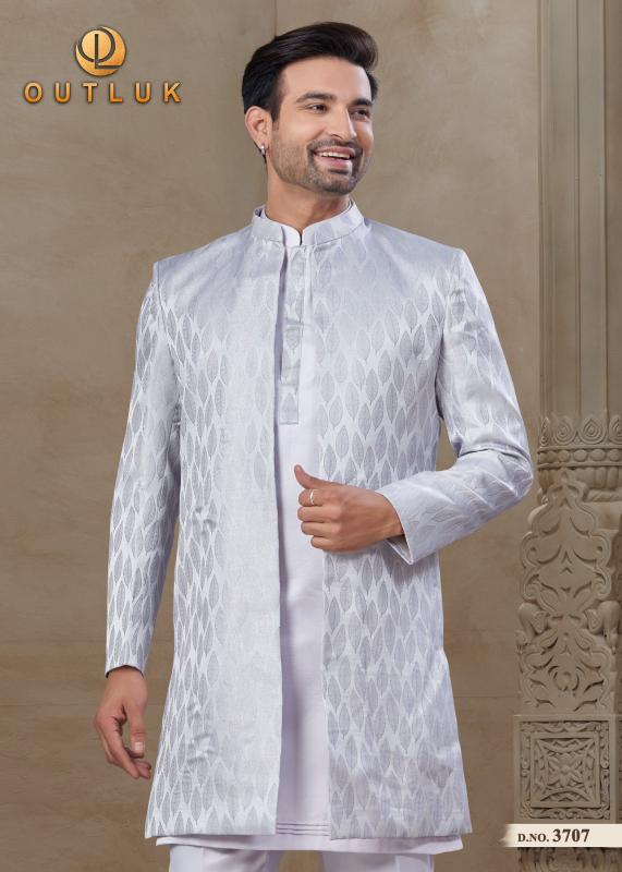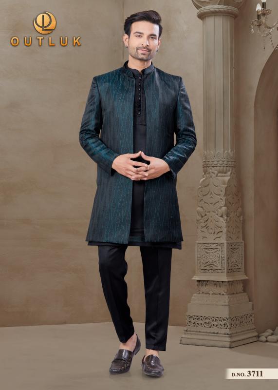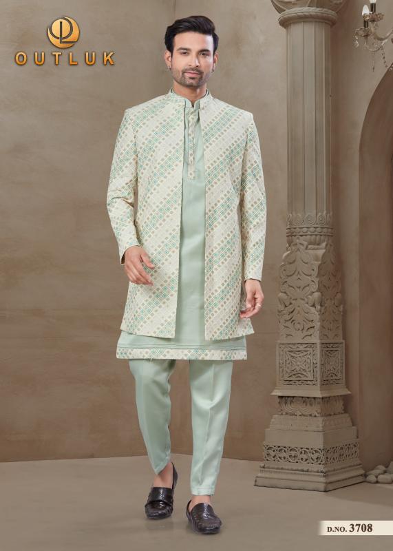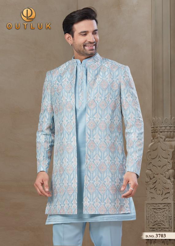Indo Western Catalog Name: Outluk Premium Series Wedding 37 ▪️ Jacket Fabric :- Mysore SilK and Jacquard Silk With Position Print ▪Kurta Fabric :- Malai Silk ▪Pant Fabric :- Malai Silk ▪Total Design:- 12 pcs ▪Size:- 32 to 46 (If you want Bigger size then 20% extra charge size 48 to 52) ▪️Work:- Position Print with Embroidery Work Rate- Rs.4495/- per pcs 📝Booking started from now... Set And Single Available *Delivery 4-5 Working Days after Confirm GST-12 Extra |