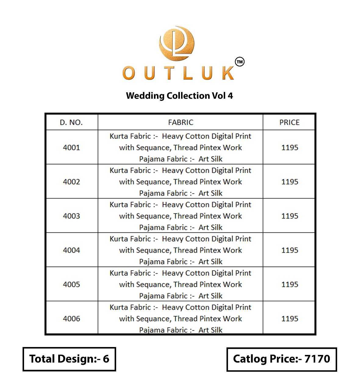 Outluk Added Wedding Collection Series New Designs in Pintex Work Kurta Pajama Catalog Name: Outluk Wedding Collection Vol 4 🔸 Fabric Details 🔸 ▪Kurta Fabric :- Heavy Cotton Digital Print with Sequance, Thread and Pintex Work ▪Pajama Fabric :- Art Silk ▪Total Design:- 6 pcs ▪Size:- 38,40,42,44 📝Booking started from now... Set Available Delivery : Same Day Ship |
