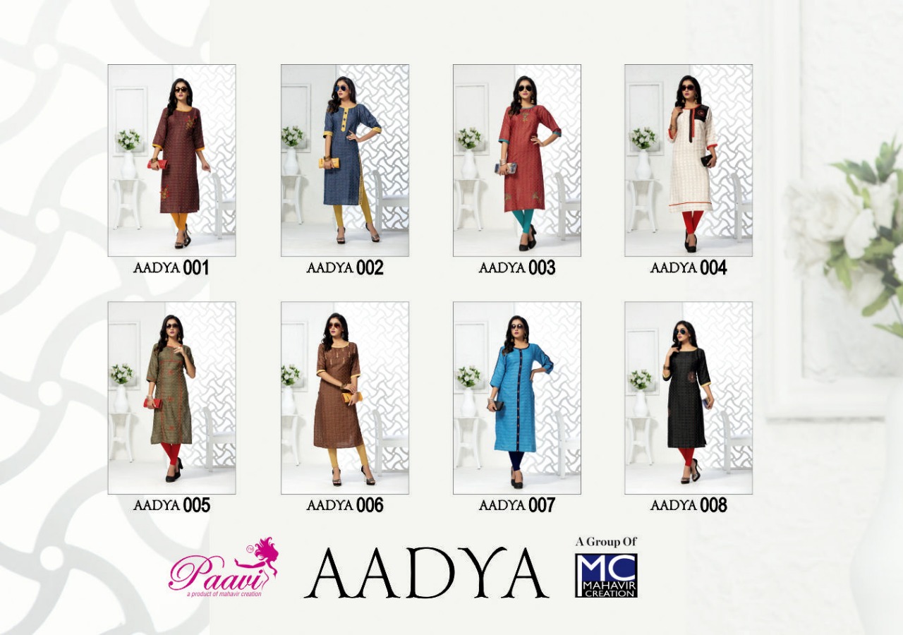 Dear Customers, Welcome to MAHAVIR creation KURTI We are introducing *PAAVIS New kurti catalogue Catalogue:- aadya CLOTH :- two ton box ✅CONCEPT :- straight SIZE :- M to 3xl RATE :- 360/- Total designs :- 8 DESIGNS |