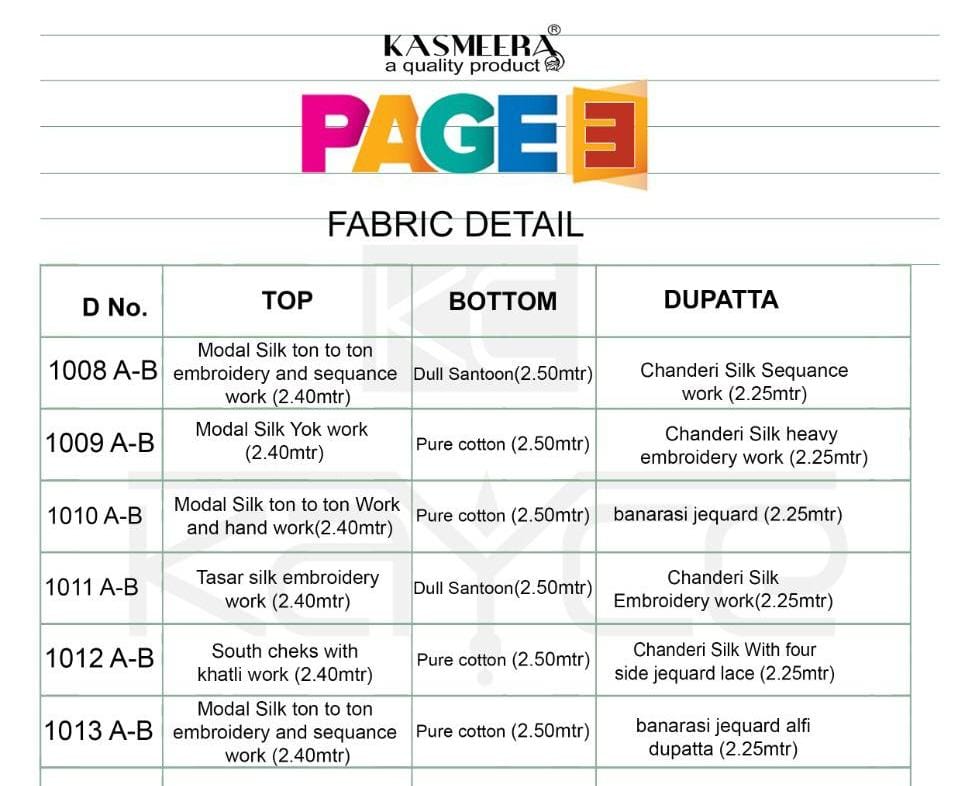 Page 3 By KINTI ® Fabric. : Cotton Cambric Print Style. : Straight Stiching Patterns Lenght. : 42(Approx) Sleeves : Full Sleeves Sizes : M L XL XXL Designs : 12 |