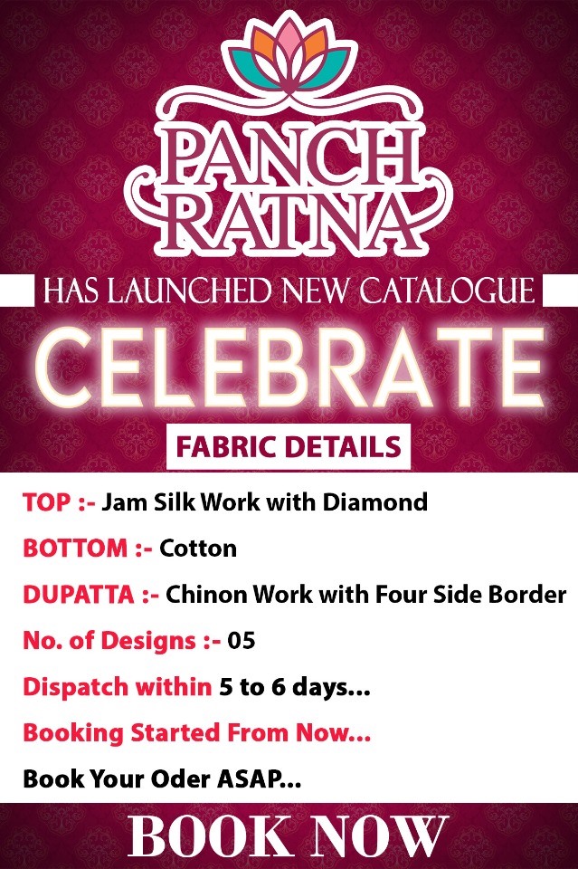 Catalog Name: CELEBRATE 🔸 Fabric Details 🔸 ▪Top:- Jam Silk Work With Diamond ▪Bottom:- Super Cottan ▪Dupatta:- Chinon Work With Four Side Border ▪Total Design:- 5 Rate - 649 per PC’s . Set to set ⏰Dispatching 5 to 6 days later 📝Booking started from now... 📞Order yours soon.... |
