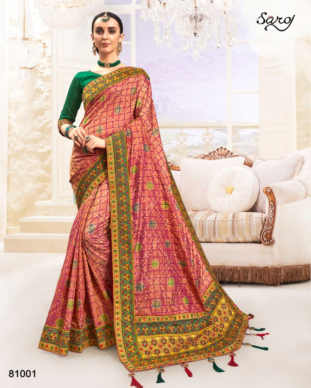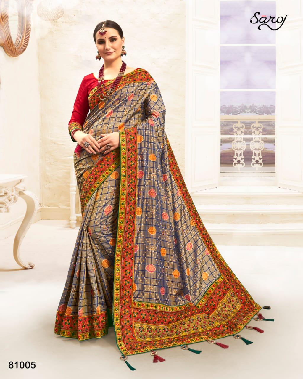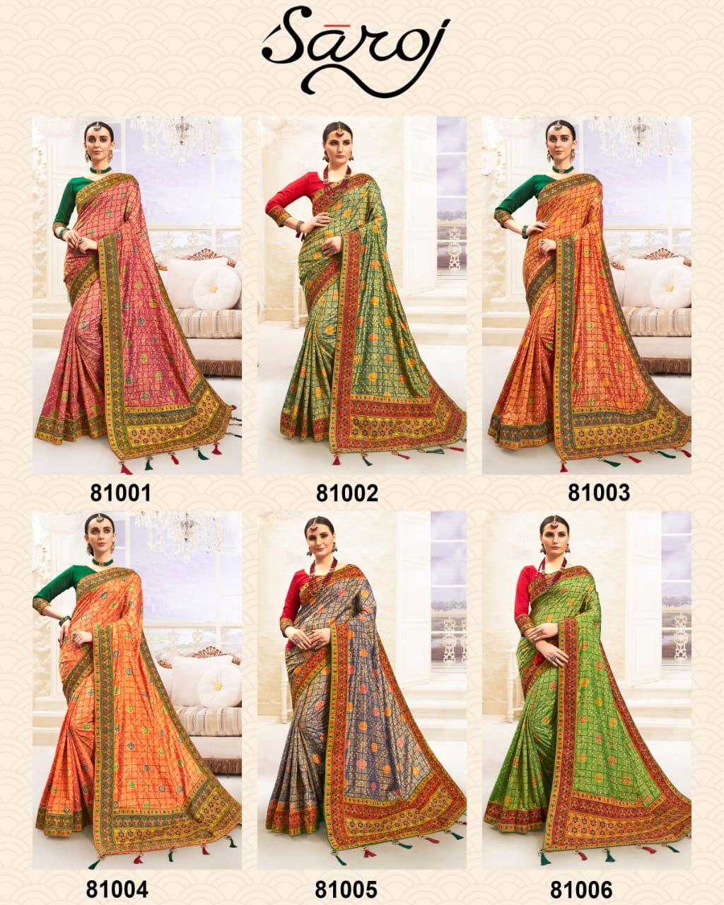 *Panihari by Saroj * Fabric: Heavy Sana Silk with Kachhi style multy work. Blouse: Banglori Silk. 6 Designs in set . Rate -1515 per pcs . Delivery 2 days . Set To Set . GST 5 Percent Extra |