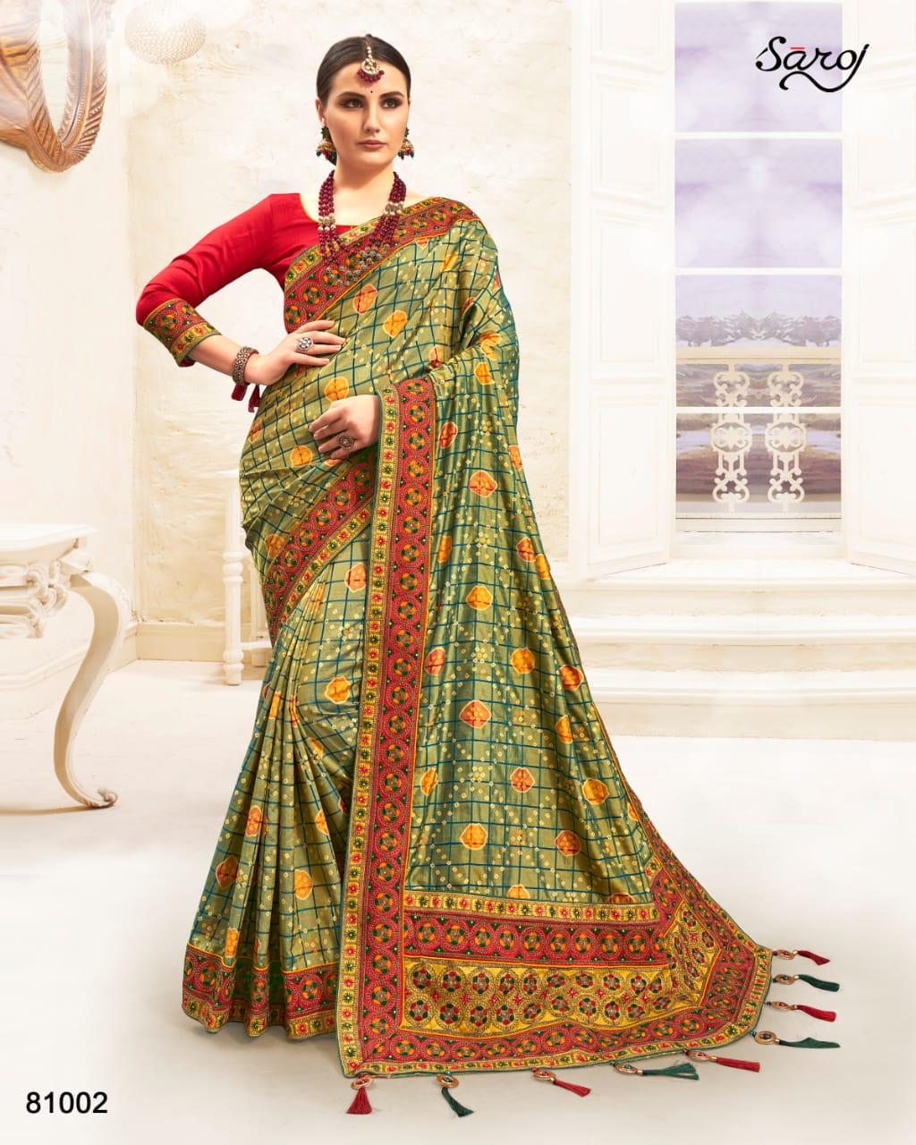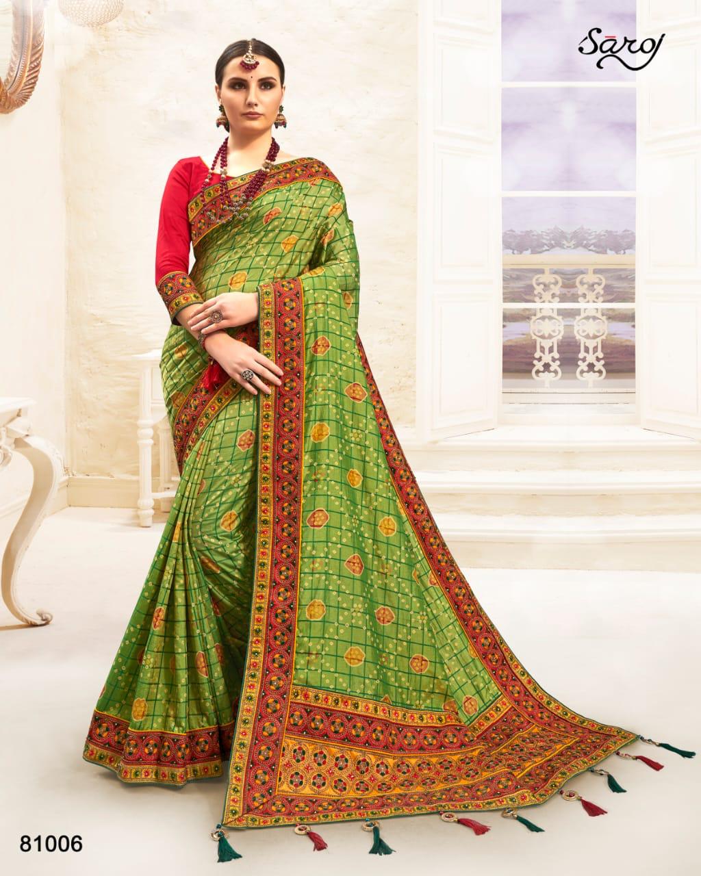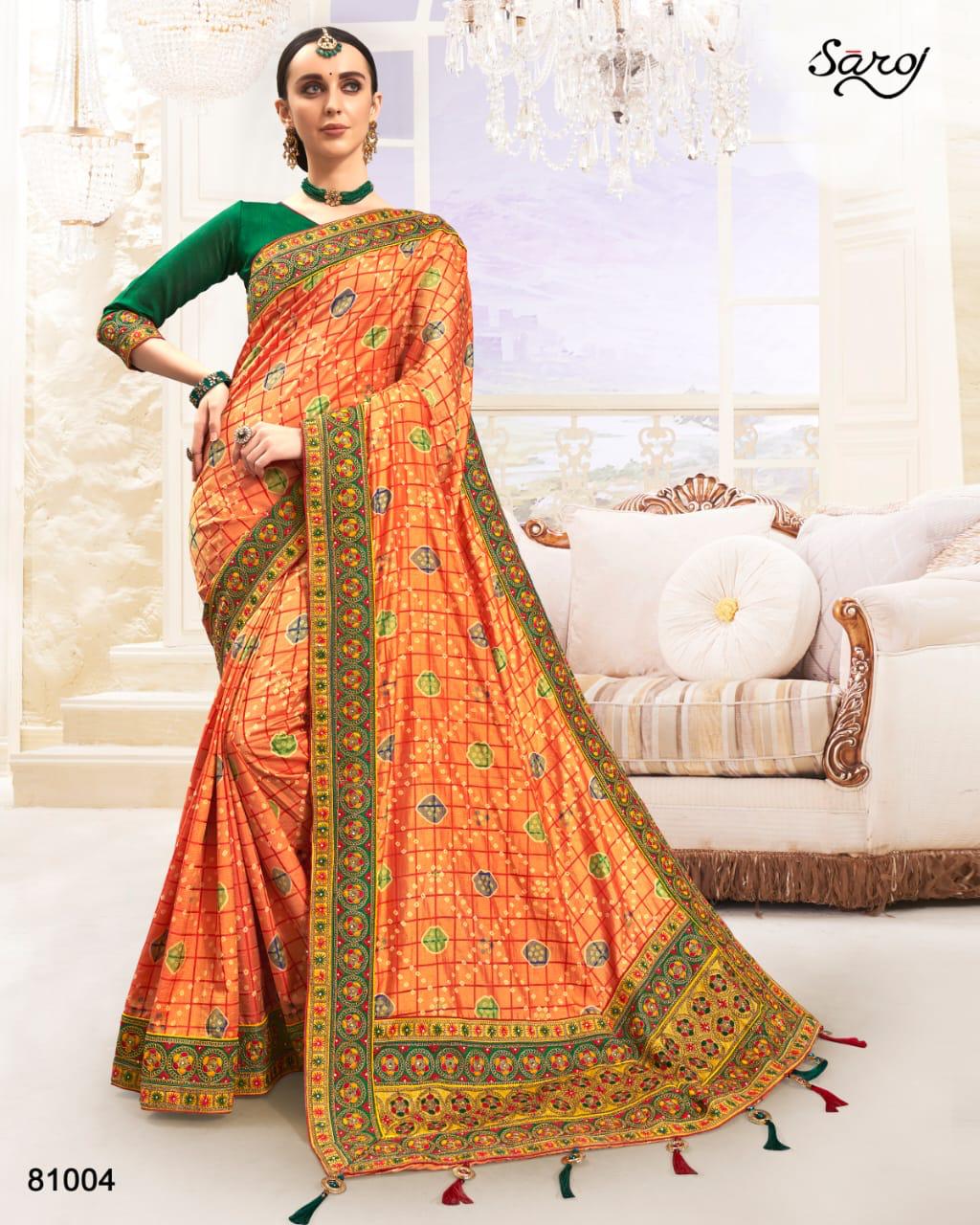 *Panihari by Saroj * Fabric: Heavy Sana Silk with Kachhi style multy work. Blouse: Banglori Silk. 6 Designs in set . Rate -1515 per pcs . Delivery 2 days . Set To Set . GST 5 Percent Extra |