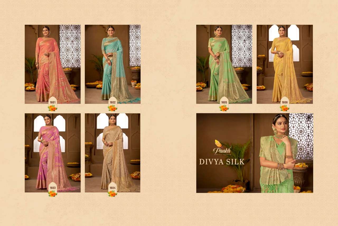PANKH PRESENTS ITS LATEST DESIGNER SAREE CATALOGUE DIVYA SILK 1601-1606 SERIES COTTON - Fabrics Cut-6.30 Mtrs 06 PC CATALOG Rate - 785/- Set to Set Only 5%GST APPLICABLE SET TO SET DELIVERY 5-6 days |