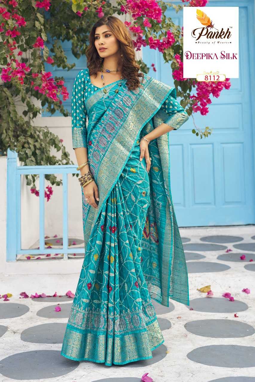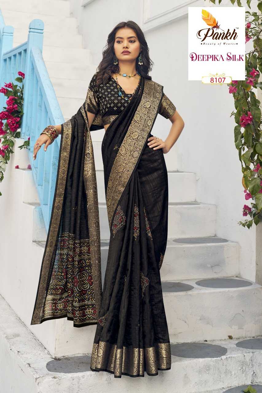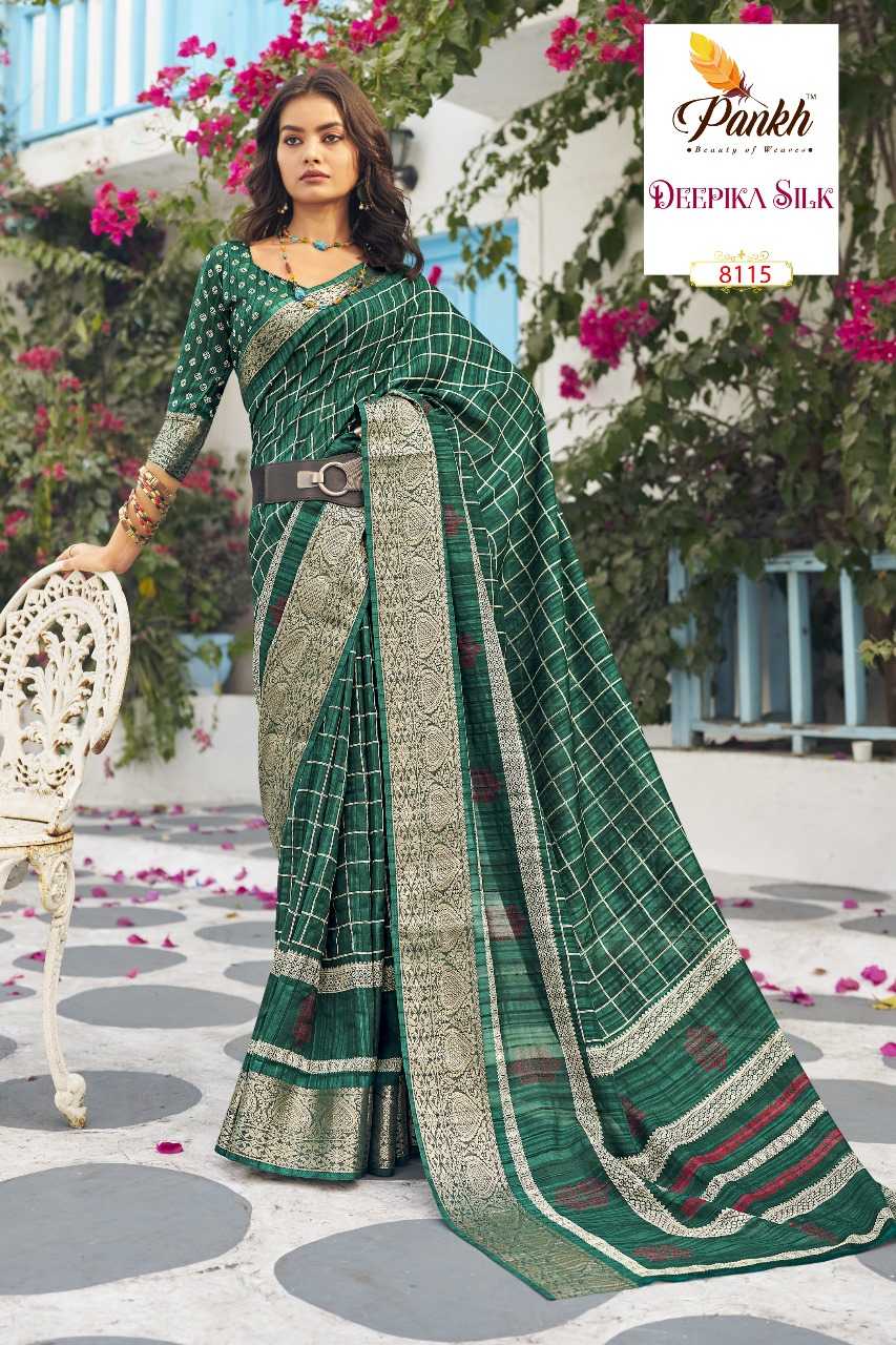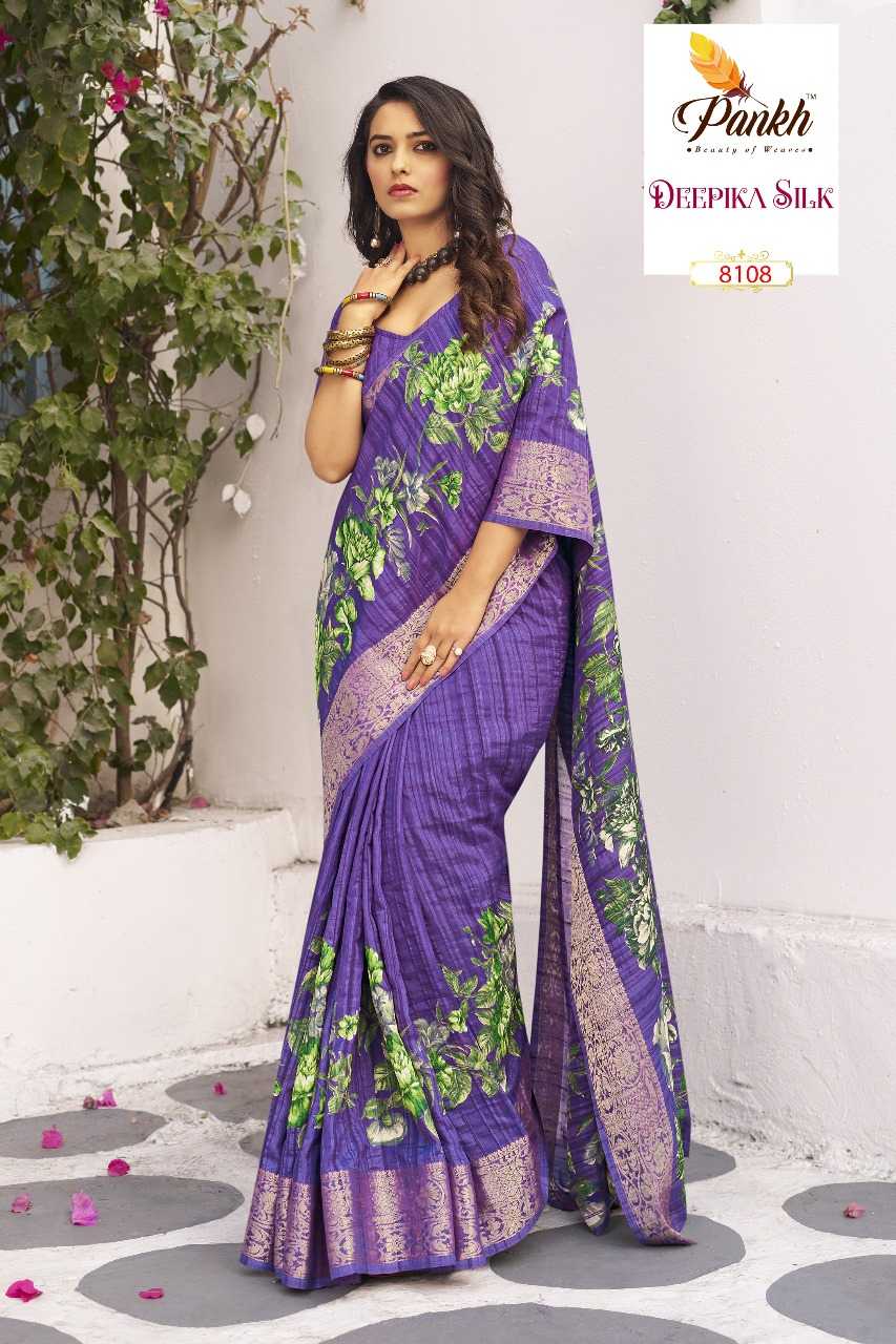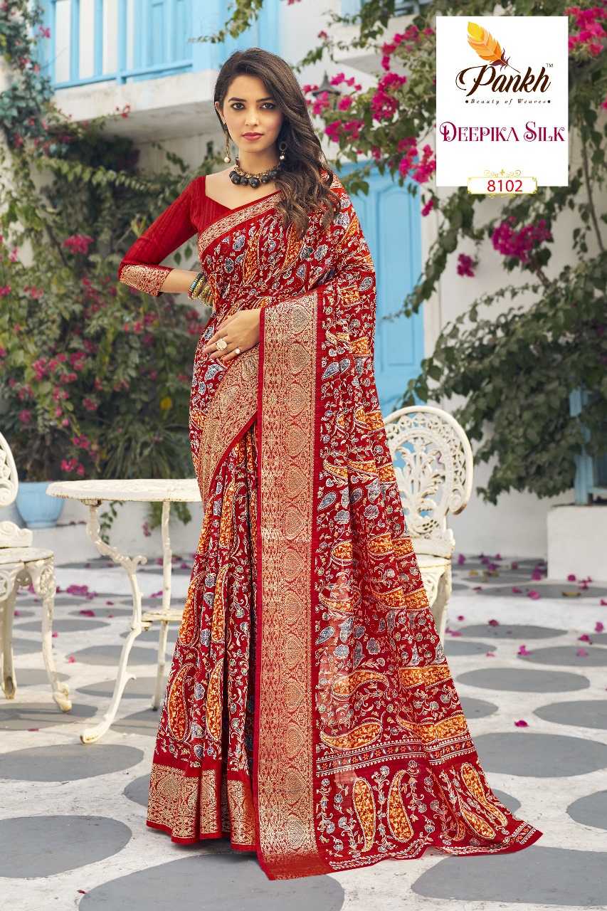 hits Catalogue 💮 Brand - Pankh Catalogue - DEEPIKA SILK Fabric - "MUNGA SILK PRINTED SAREE WITH WEAVING BORDER SAME FABRIC PRINTED BLOUSE & WEAVING SLEEVE BORDER" Rate - 1395/- With GST EXTRA No of pcs in set : 16 |