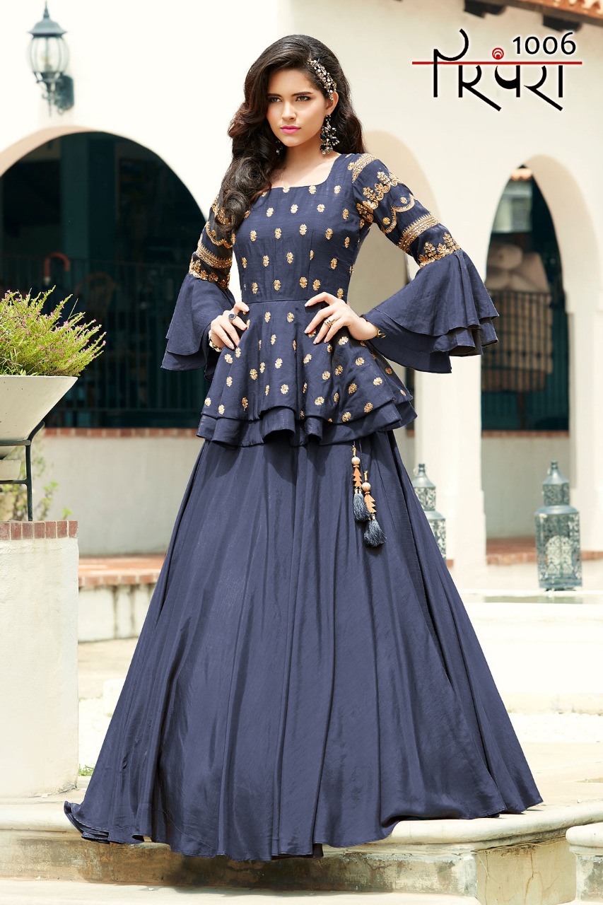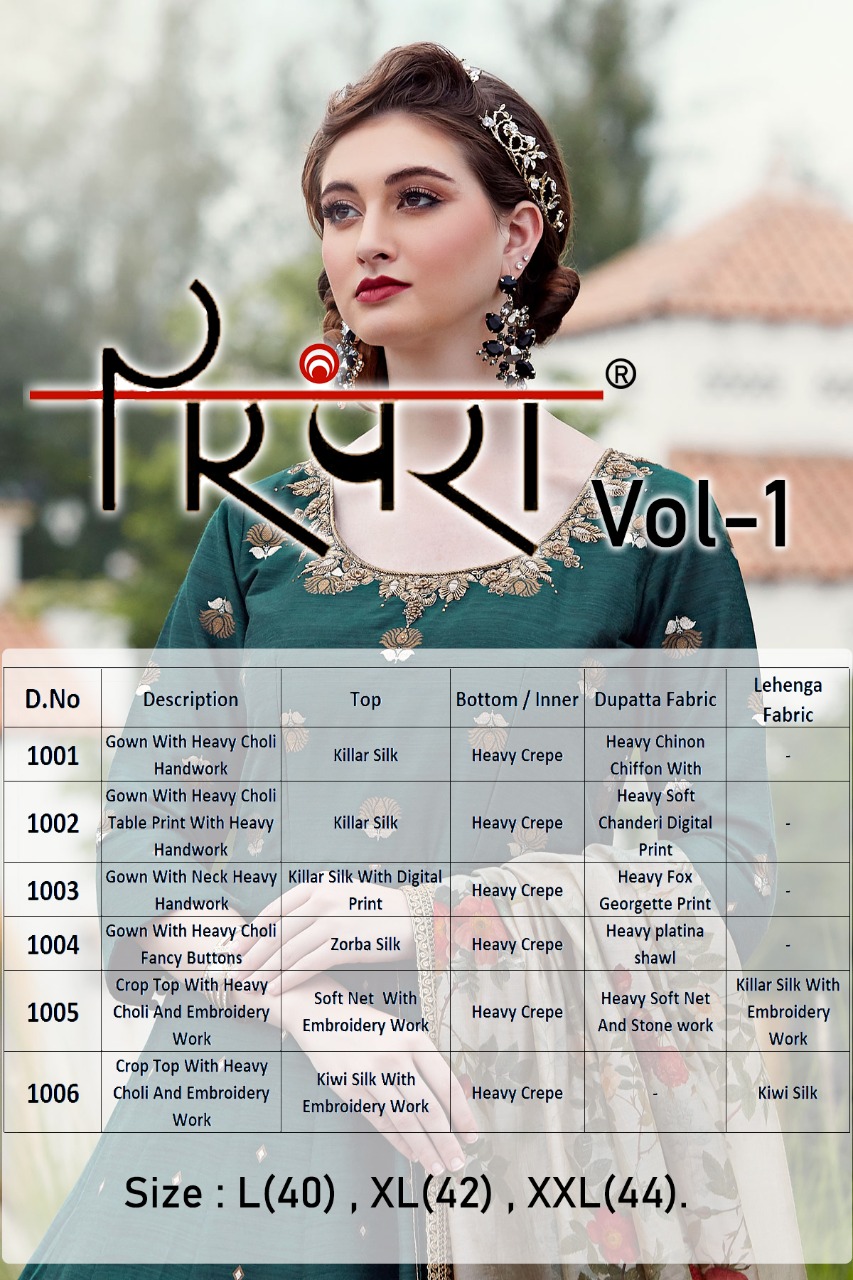 PARAMPRA Vol 01 New Designer Gown/Crop Top Exclusive Collection Total 6 Design Size - L , XL , XXL RATE 1001 - 2580/- 1002 - 2250/- 1003 - 1950/- 1004 - 1850/- 1005 - 2500/- 1006 - 2220/- Average Rate 2225/- ONLY SET TO SET AVAILABLE |
