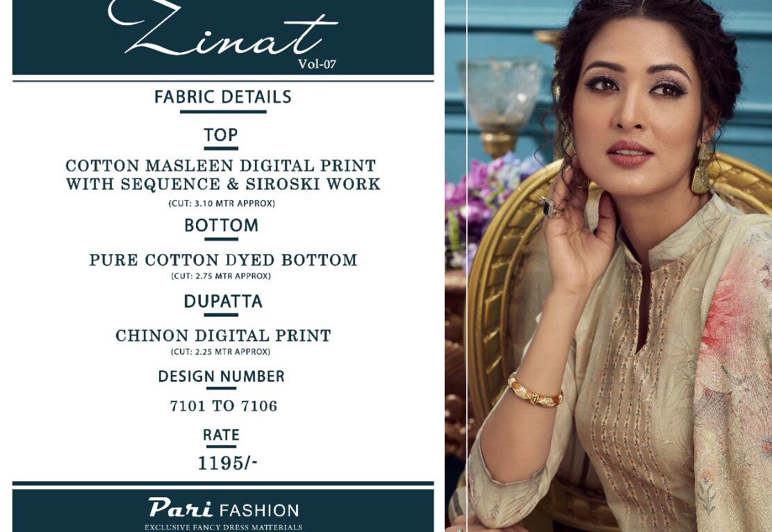 Catlog name - ZINAT VOL-7. Rate- 1195 per pcs . Set to set. GST 5 Percent Extra. Delivery from today |