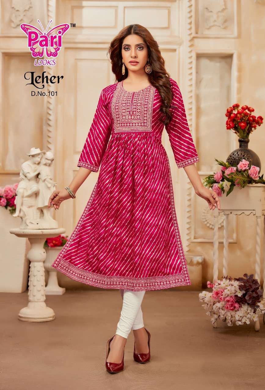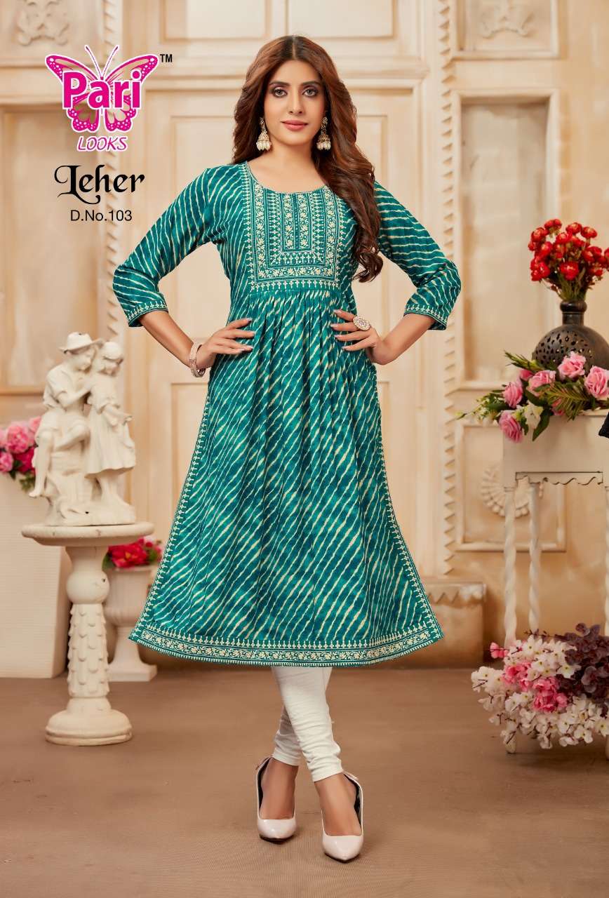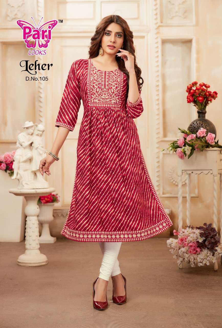 pari leher rayon foil print and work nyraa cut pattern kurti bulk orders