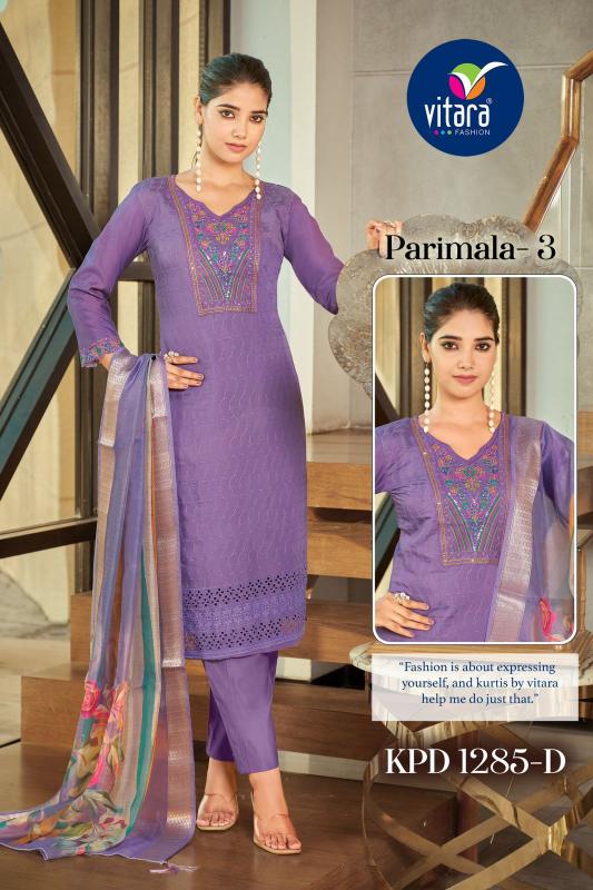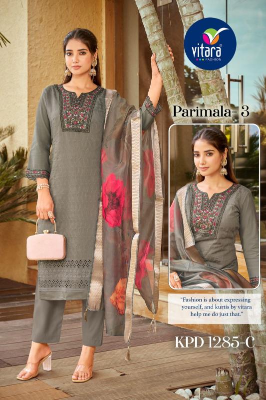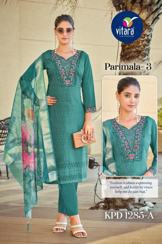 .Vitara fashion launched pic & choose 3pcs Combo set Name - PARIMALA-3 fabric🎀 *TOP- roman borrer shifli with embroidery 🏵️*Bottam-**- roman silk 🌻dupatta- organza jcrd with digital print 💥size -m to 2xl 🌟design-4 RATE-*/- 1035/- per pcs |