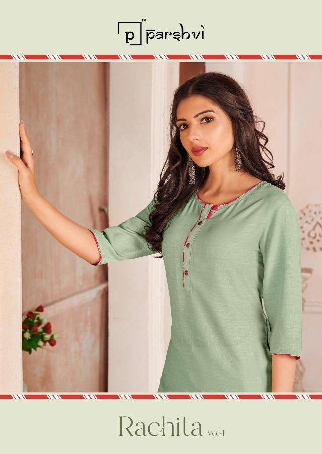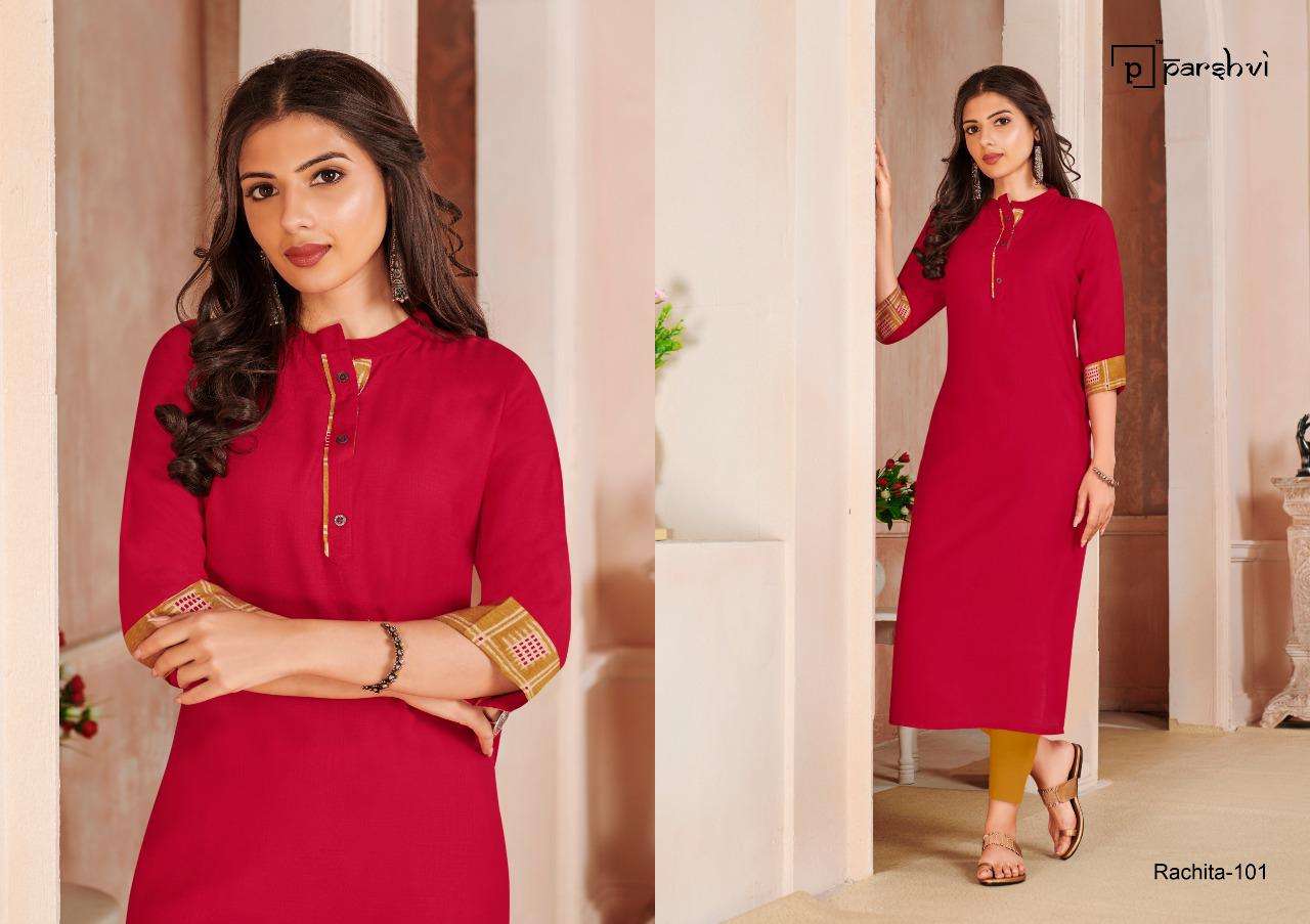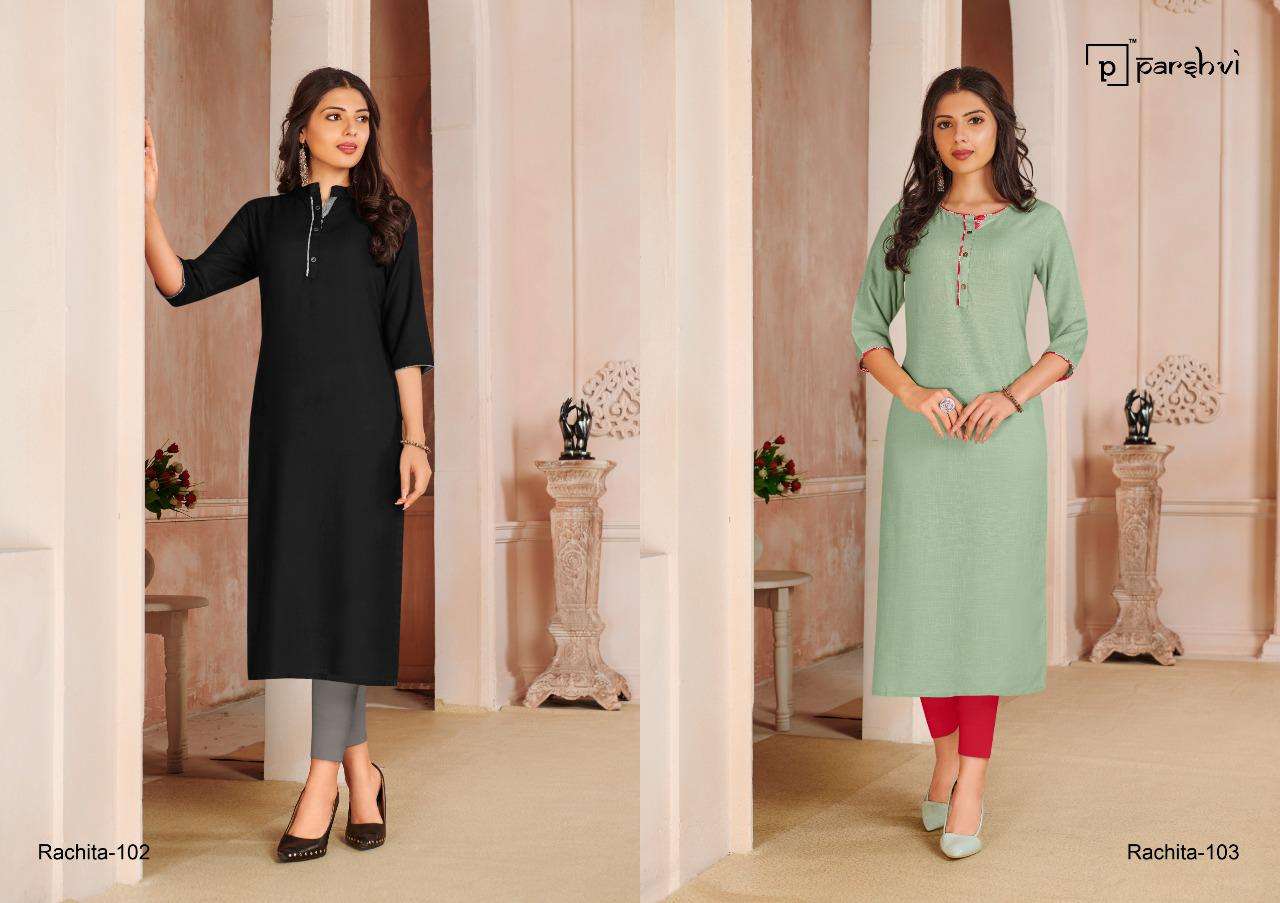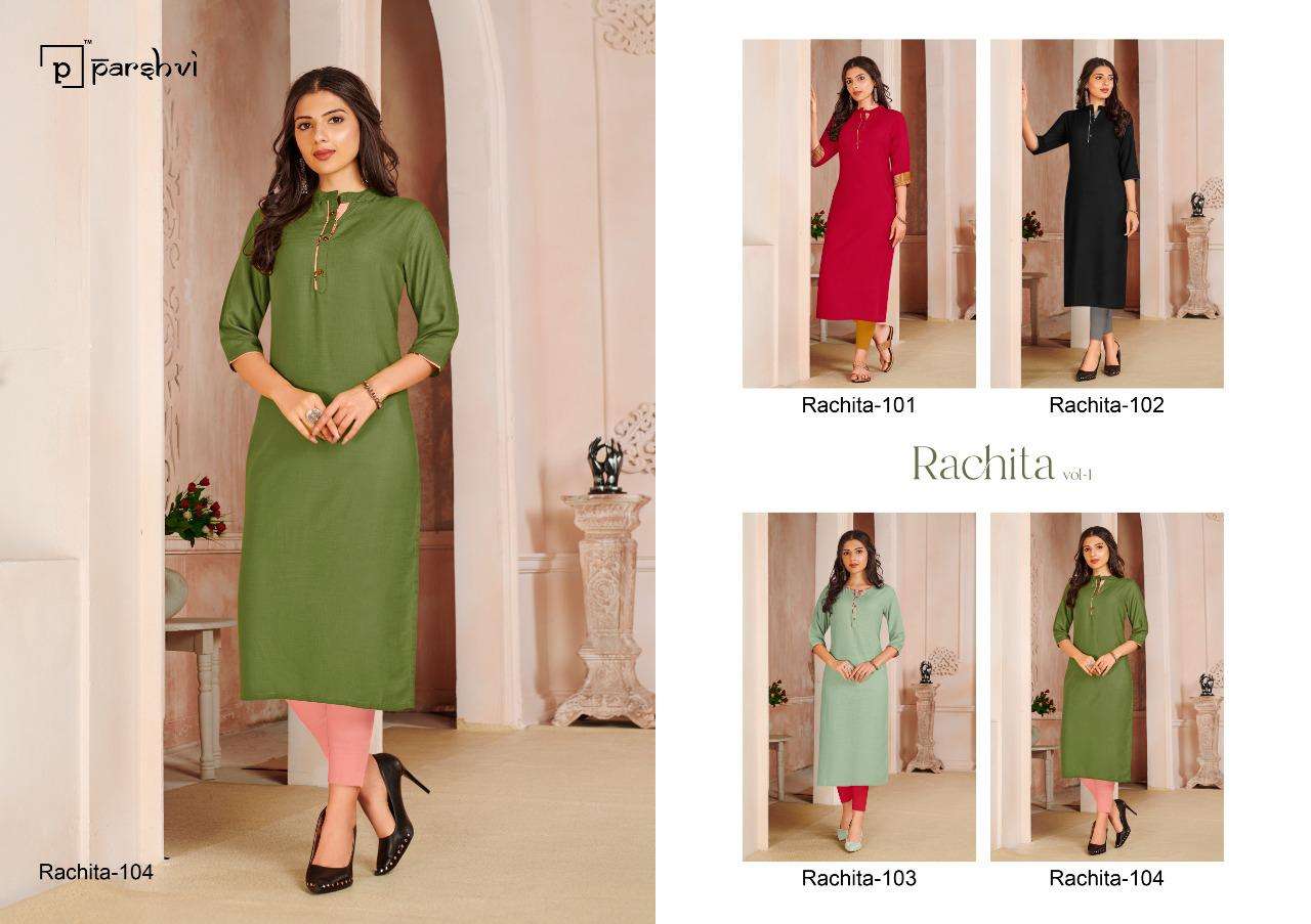 R STUDIO  LAUNCHES EXCLUSIVE DESIGNER KURTI       PARSHVI CATALOGUE NAME- RACHITA VOLUME-1        FABRIC RAYON SLUB SIZE -  M -38,L-40,XL - 42, XXL - 44,   LENGTH  - 44+ DESIGN- 4  RATE:- 299/- GST +5% ADD ON BILL AMT Set to set FROM R STUDIO SURAT |