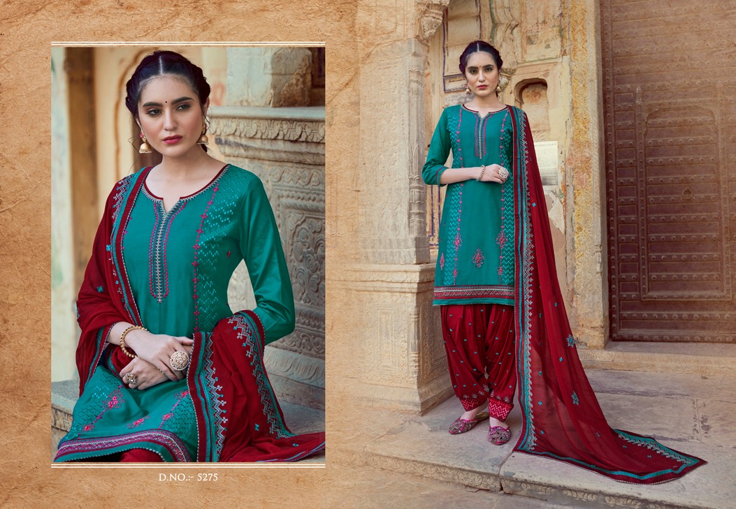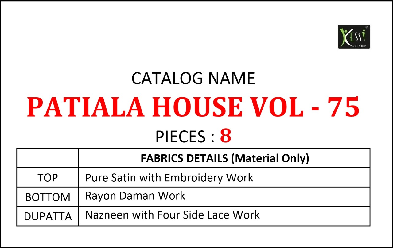 Kessi Fabrics Pvt. Ltd. has launched Catalog name : Patiala House Vol - 75 Fabric Details ▪Top:- PURE SATIN WITH EMBROIDERY WORK ▪Bottom:- RAYON WITH EMBROIDERY WORK ▪Dupatta:- NAZNEEN WITH WORK ▪Total Design:- 8 RATE - 799/- |