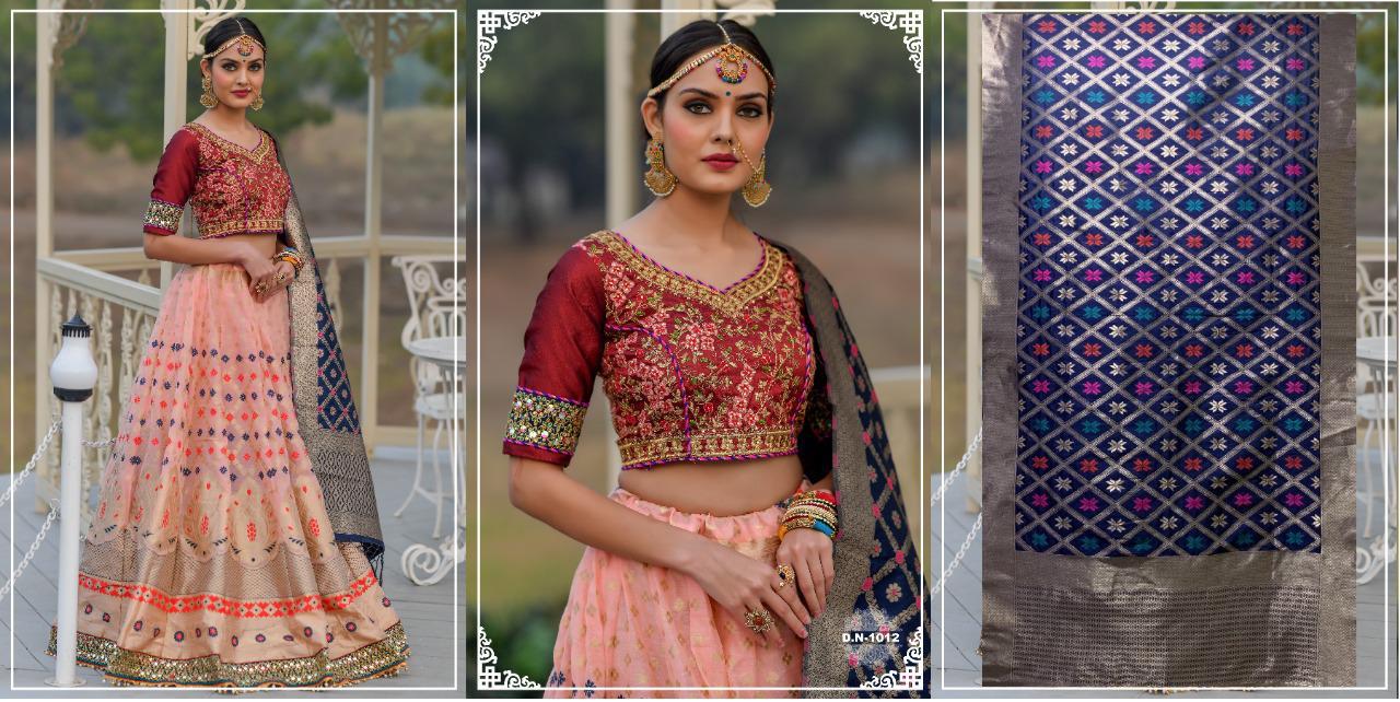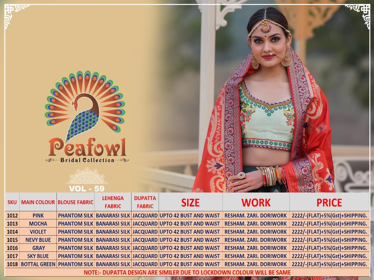 ======================= 🦚 Peafowl Vol-59 🦚 ======================= Febric Details Attached ======================= ======================= Design No:- 1012=2222/-₹ Design No:- 1013=2222/-₹ Design No:- 1014=2222/-₹ Design No:- 1015=2222/-₹ Design No:- 1016=2222/-₹ Design No:- 1017=2222/-₹ Design No:- 1018=2222/-₹ ======================= Lehangas Fabric=Banarasi silk Choli fabric=Phantom silk Dupatta Fabric=Banarasi silk Work-Resham & Zari & Embroidery ========================= 1-Pise Weight-1.5 Kg Size-Up to 42 Bust and waist |