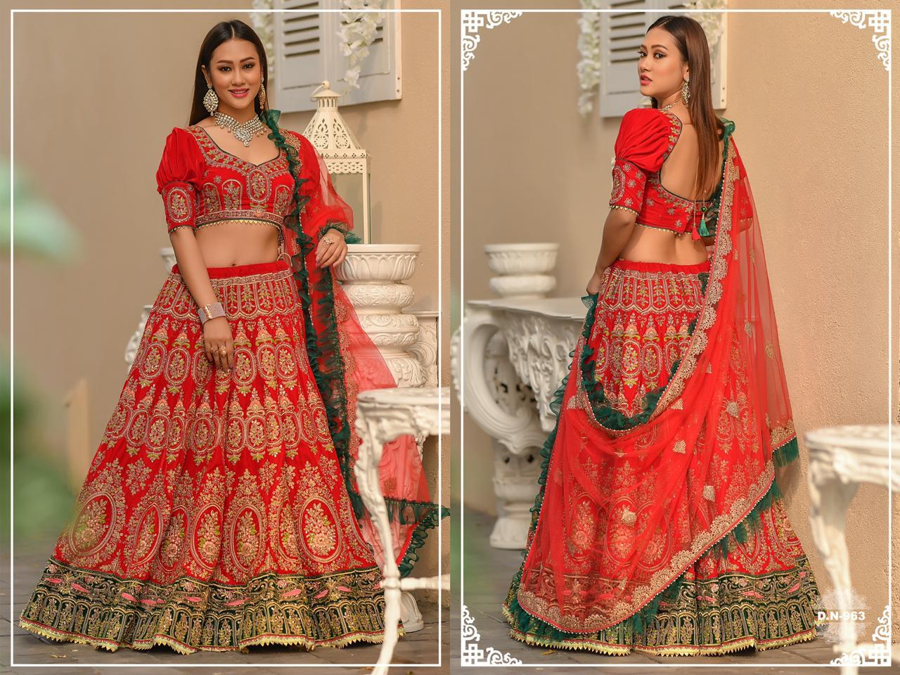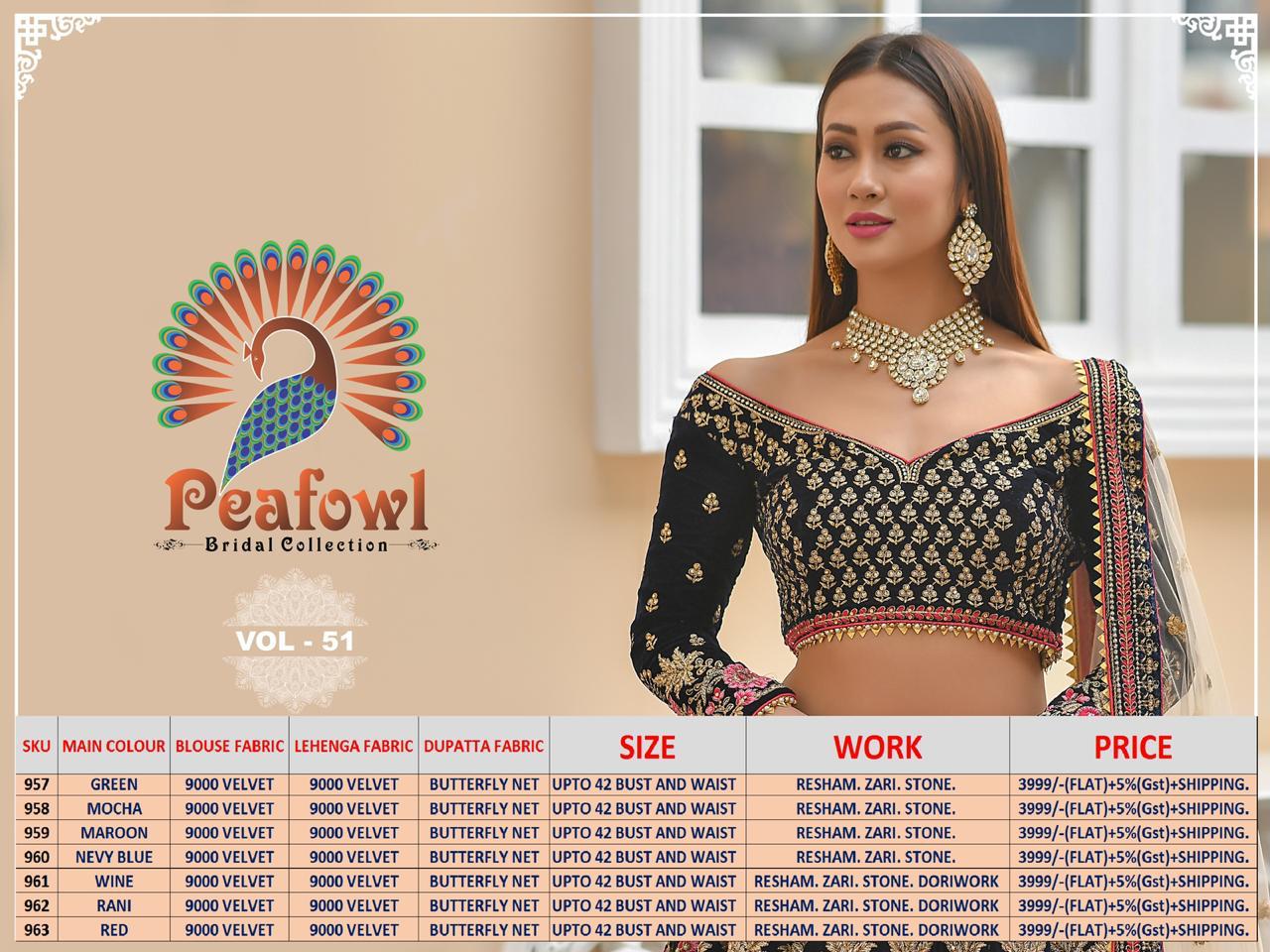 Bridal Lehangas Choli ======================= Peafowl Vol-51 ======================= Febric Details Attached ======================= ======================= Design No:- 957=3999/-₹ Design No:- 958=3999/-₹ Design No:- 959=3999/-₹ Design No:- 960=3999/-₹ Design No:- 961=3999/-₹ Design No:- 962=3999/-₹ Design No:- 963=3999/-₹ GST Extra . Delivery from tomorrow ======================= please upload and forward ask any questions related to products =========================== *Lehangas & choli fabric-Velvet * Work-Embrodery+Stone Work |
