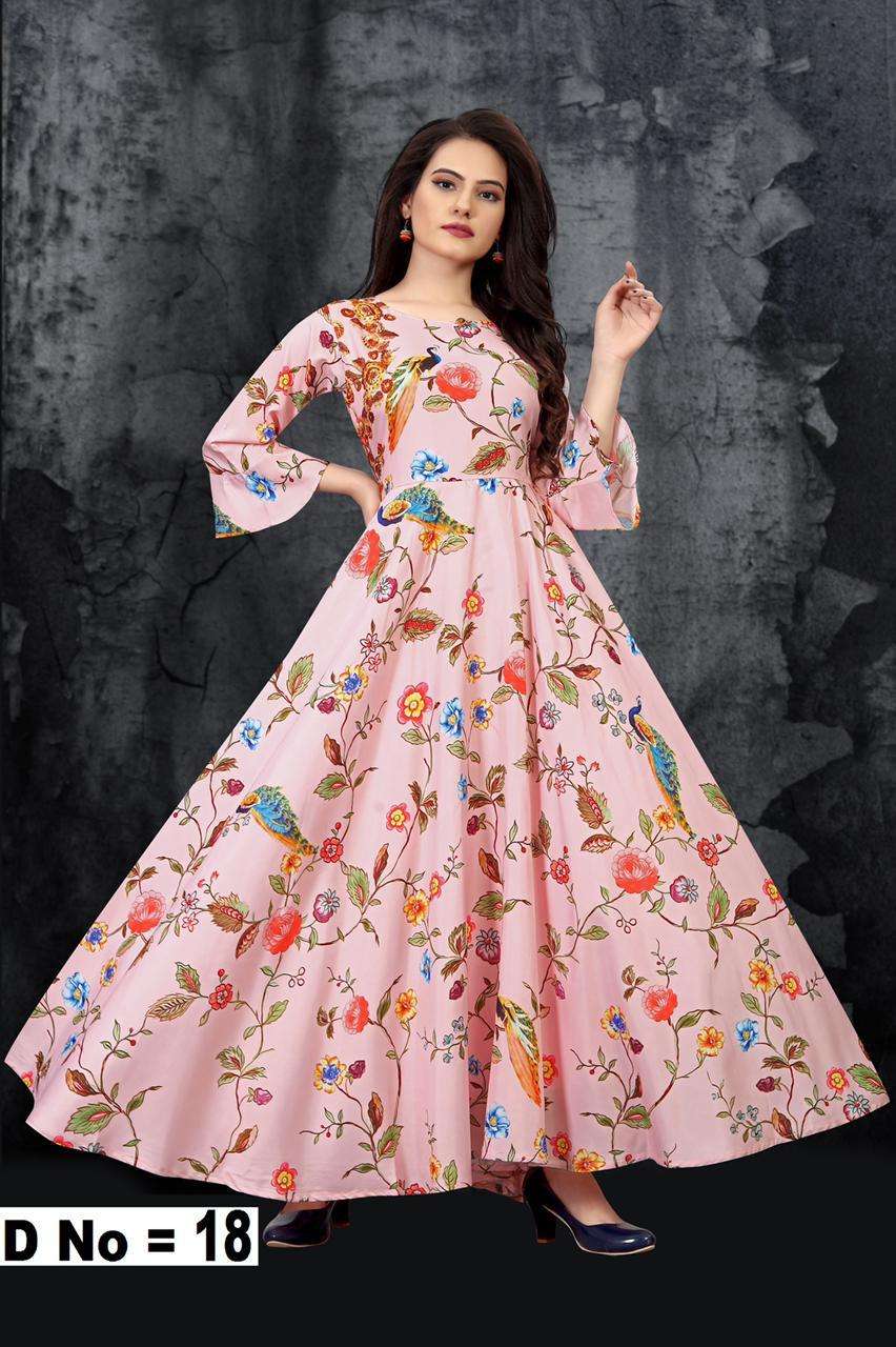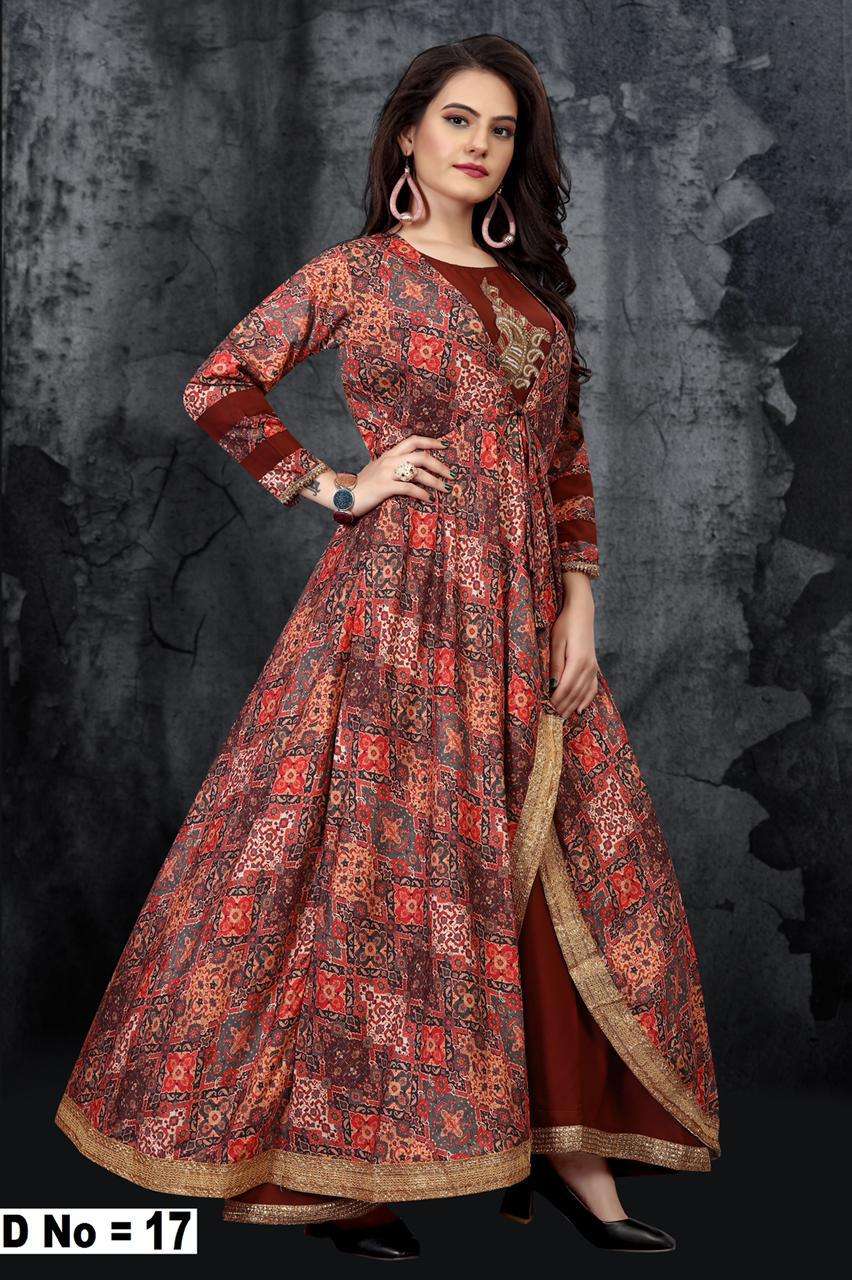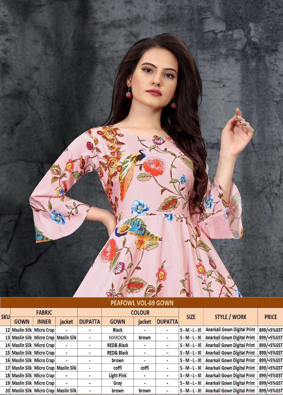 Women wear Print Gown ======================= Â Â Â Peafowl Vol-69 ======================= Febric Details Attached ======================= ======================= Design No:- 12= 899/- Design No:- 13= 899/- Design No:- 14 = 899/- Design No:- 15 = 899/- Design No:- 16 = 899/- Design No:- 17 = 899/- Design No:- 18 = 899/- Design No:- 19 = 899/- Design No:- 20 = 899/- ======================= Gown Fabric=Maslin silk Inner fabric=Micro Crap Jacket Fabric=Maslin Silk Work-Digital Print ========================= 1-Pise Weight-1 kg Size = S-M-L-Xl ========================= This is a Original Product Photo-Shoot Product. ========================= Dispatch = Today Delivery |