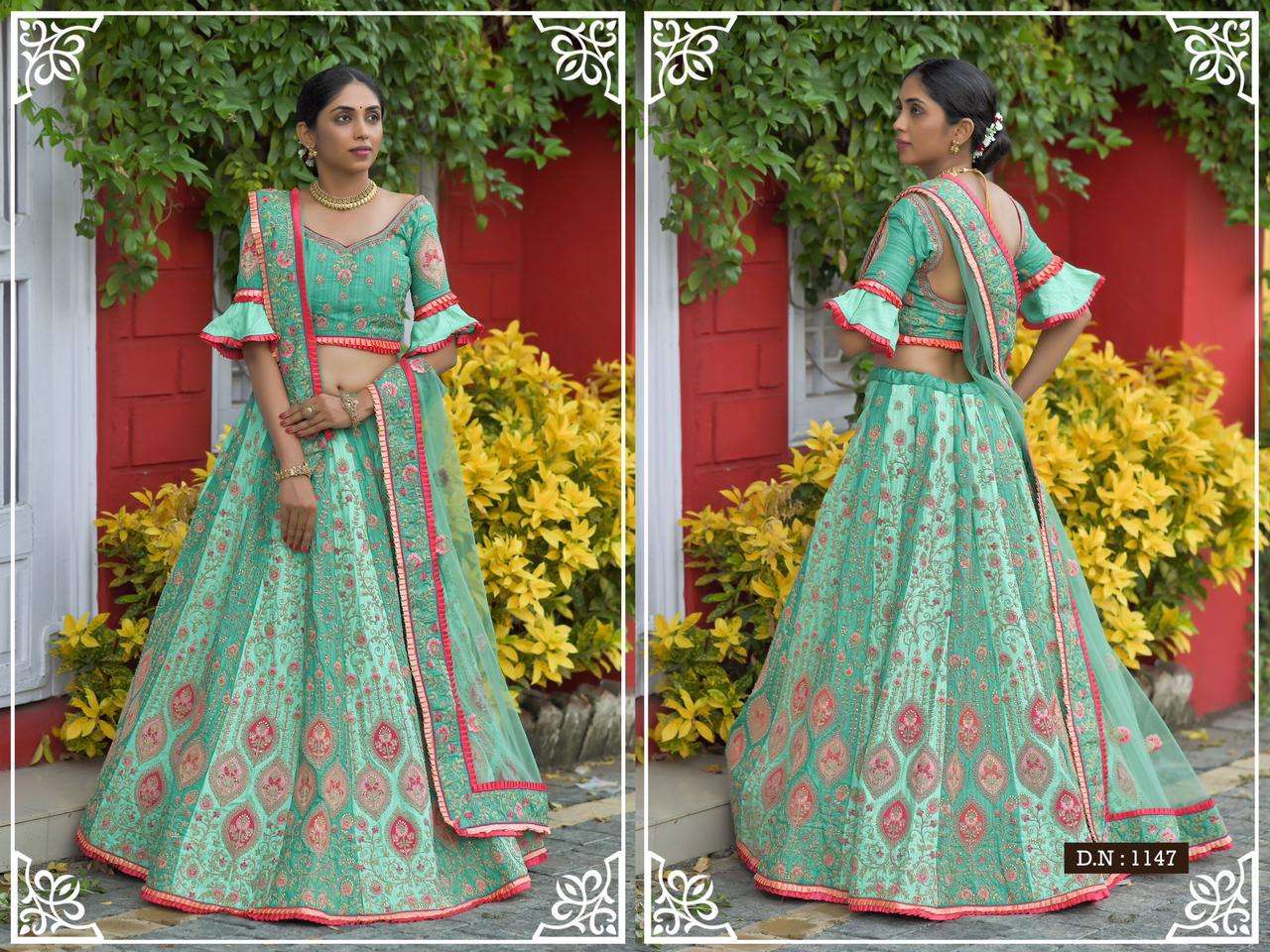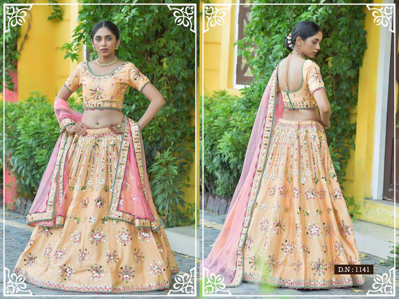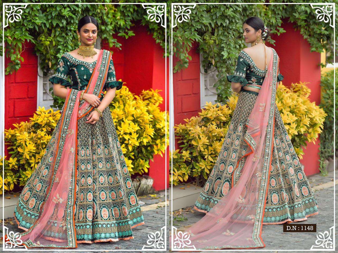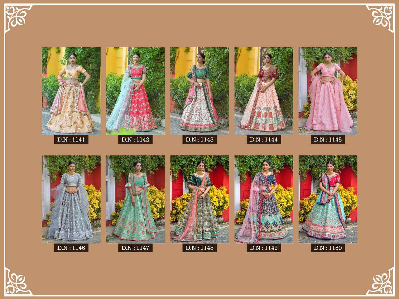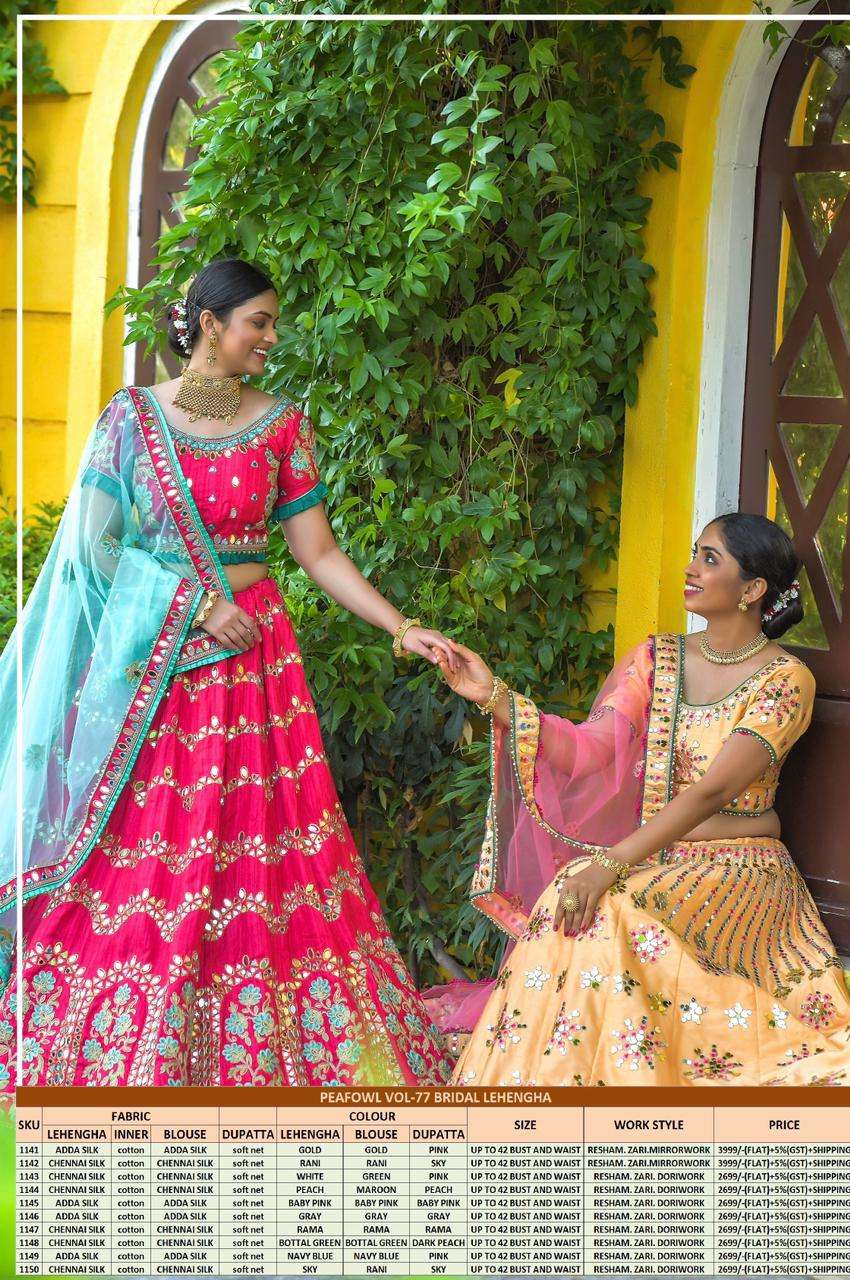 Women wear Bridal Lehangas ======================= Â Â Â Peafowl Vol-77 ======================= ========================= Design No :-1141 = 3999/- Design No :-1142 = 3999/- Design No :-1143 = 2699/- Design No :-1144 = 2699/- Design No :-1145 = 2699/- Design No :-1146 = 2699/- Design No :-1147 = 2699/- Design No :-1148 = 2699/- Design No :-1149 = 2699/- Design No :-1150 = 2699/- ======================== Lehangas Fabric=Adda Silk & chennai Silk Choli fabric=Adda Silk & chennai Silk Dupatta Fabric=Soft net Work- Resham & Embroidery ========================= 1-Pise Weight= 2.0Kg Size-Up to 42 Bust and waist |