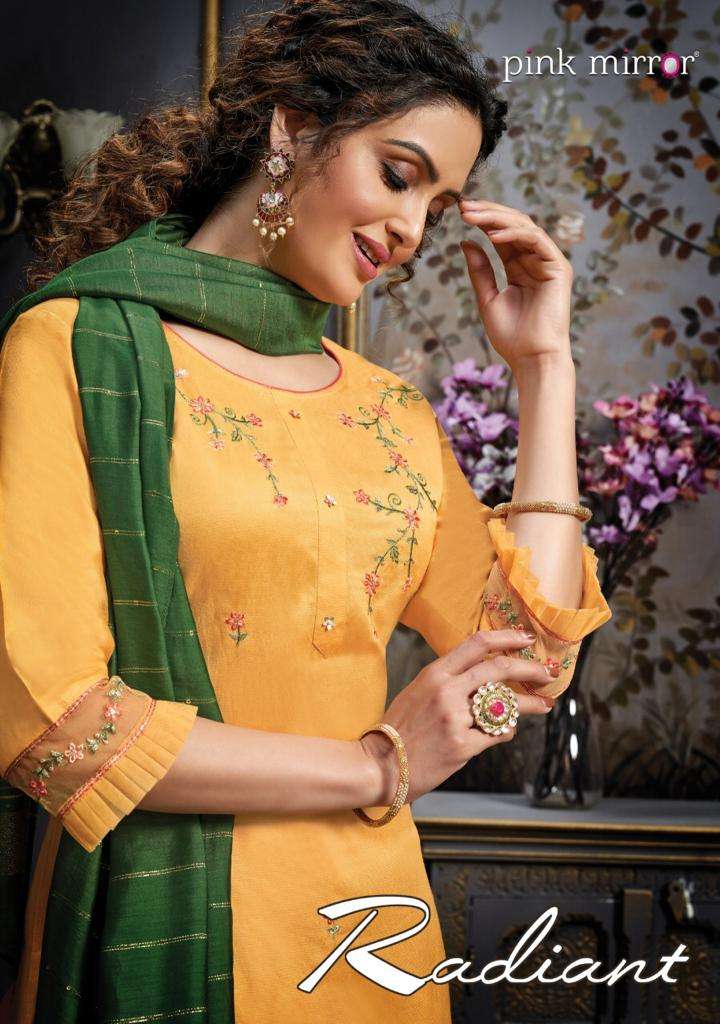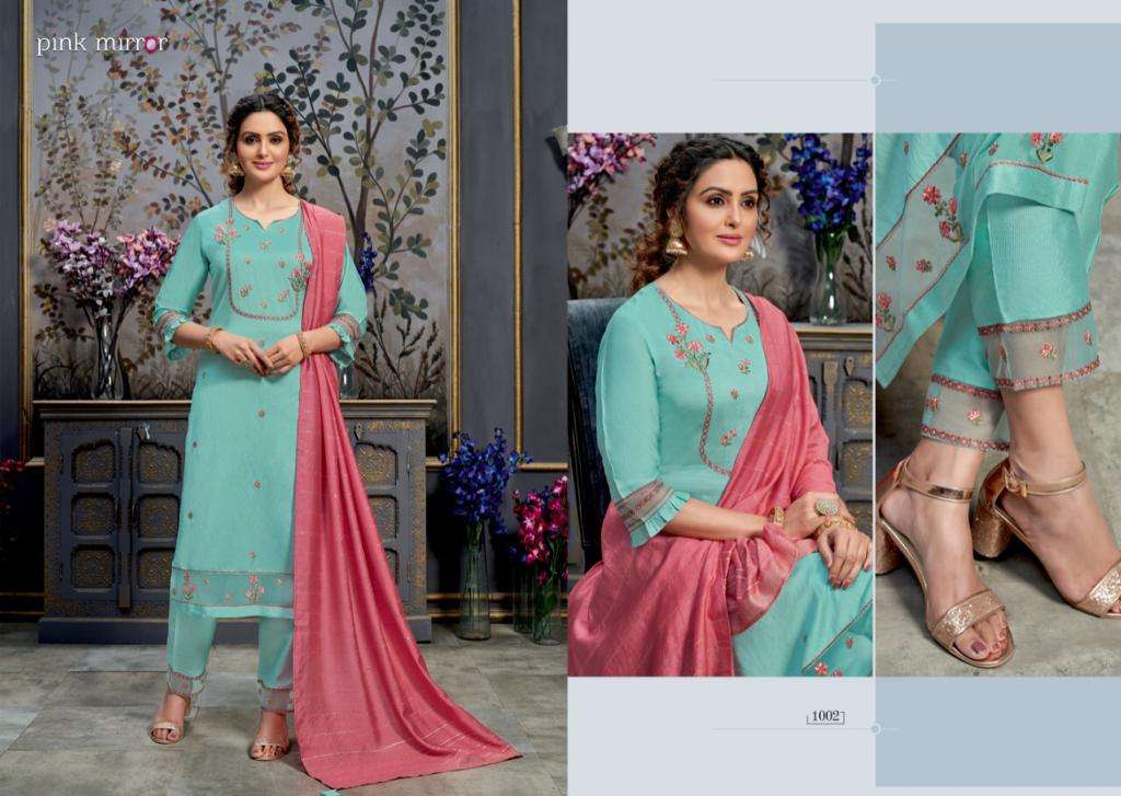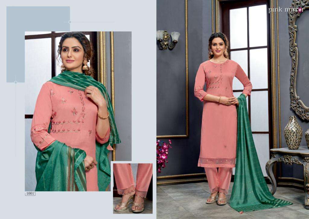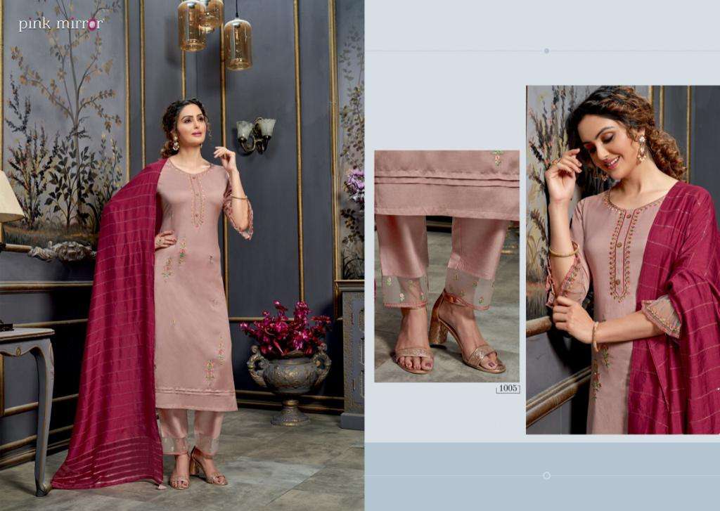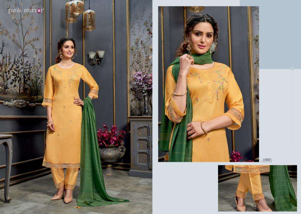 Brand : PINK MIRROR Catalogue : RADIANT (Kurti, Pant with Dupatta) Design : 6 Fabric : *Top : Viscose with embroidery & value addition* Â Â Â Â Â Â Â Â Bottom : Viscose with emb. Â Â Â Â Â Â Â Â Dupatta : Dyed with zari Jakard Size : M(38),L(40),XL(42), XXL(44) Rate :- 999/- |