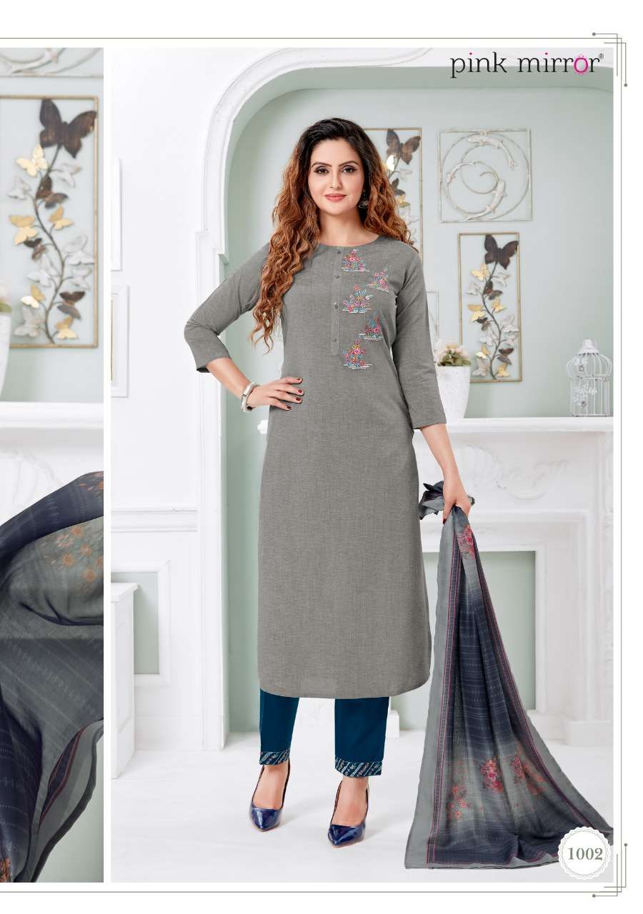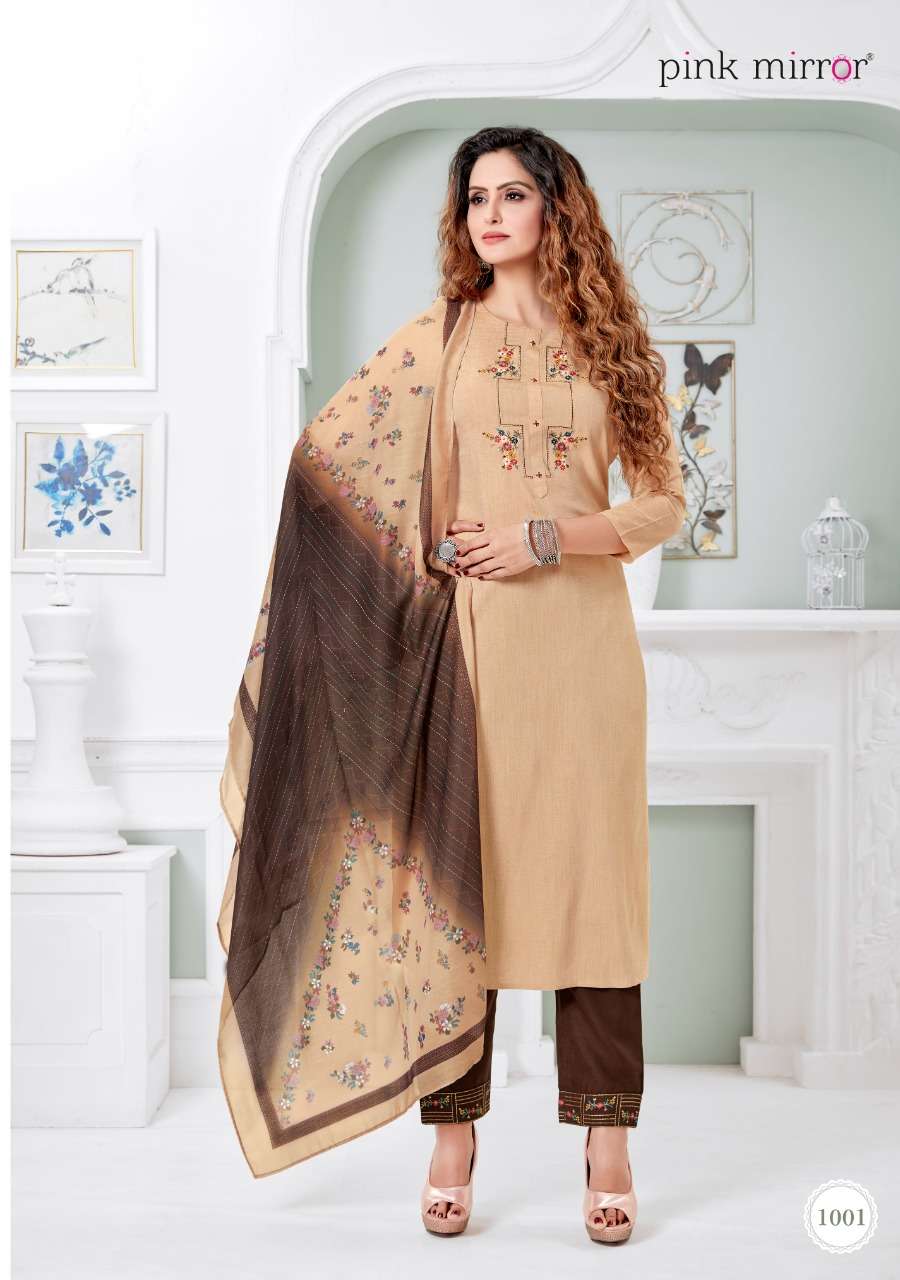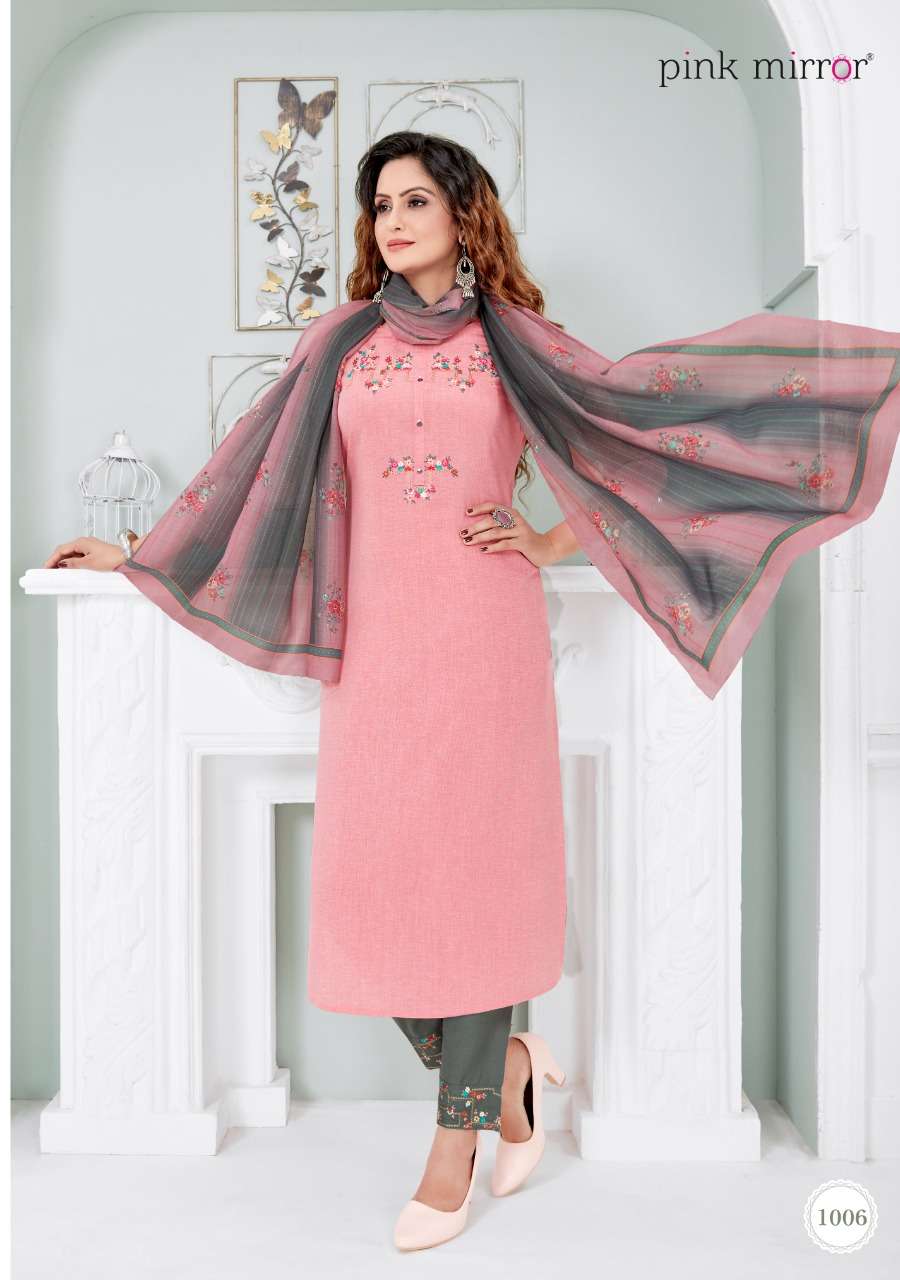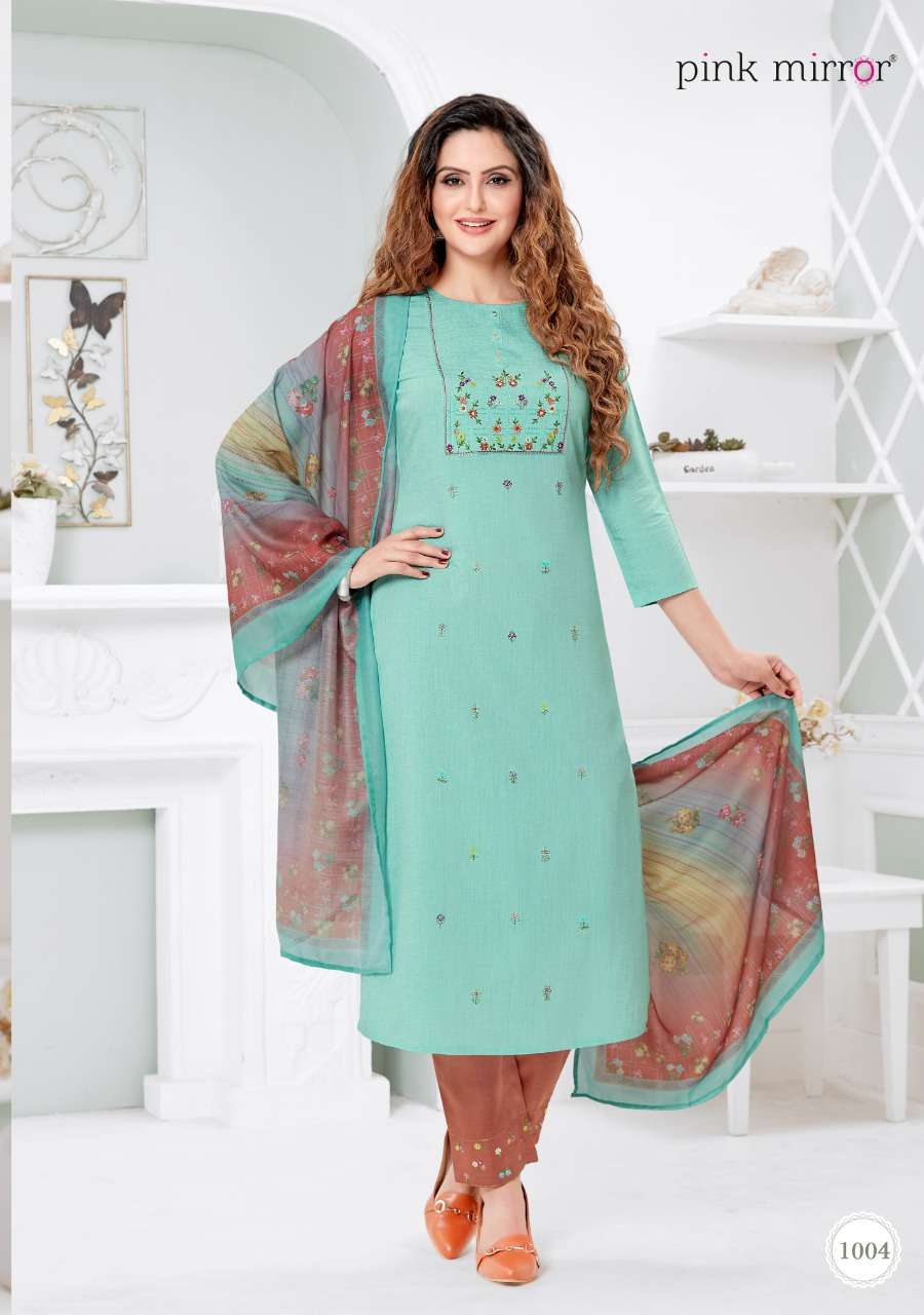 Brand : PINK MIRROR Catalogue : SERENITY (Kurti, Pant with Dupatta) Design : 6 Fabric : Top : Viscose Silk Liva  with embroidery n handwork.        Pants : Slub with embroidery .         Dupatta: Muslin digital print. Size : M(38),L(40),XL(42), XXL(44), 3XL(46) Rate :- 950/- |