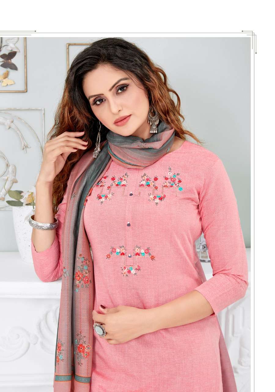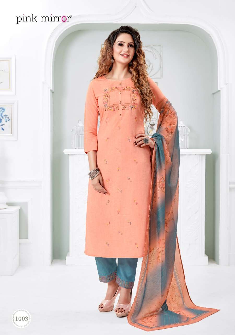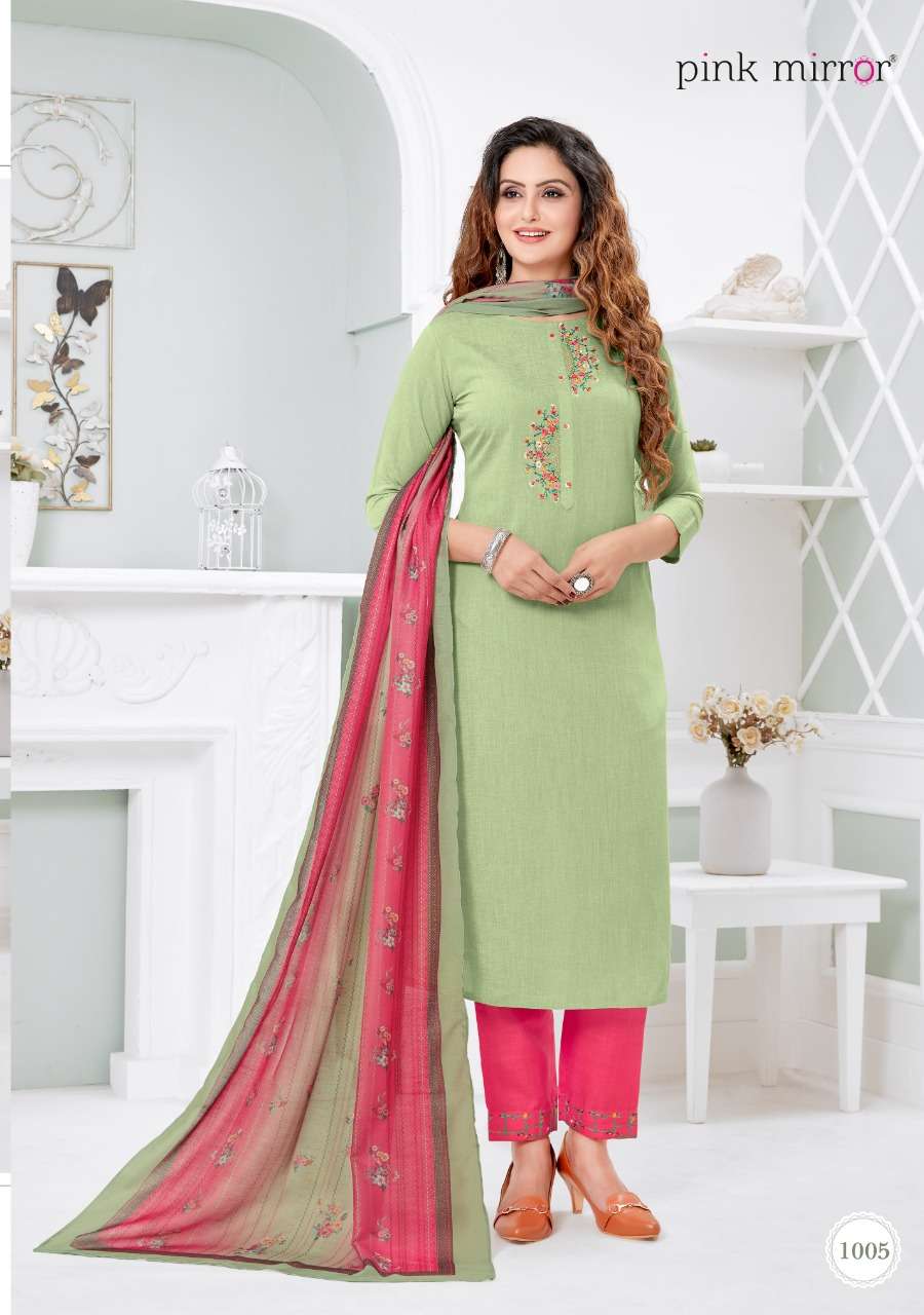 Brand : PINK MIRROR Catalogue : SERENITY (Kurti, Pant with Dupatta) Design : 6 Fabric : Top : Viscose Silk Liva  with embroidery n handwork.        Pants : Slub with embroidery .         Dupatta: Muslin digital print. Size : M(38),L(40),XL(42), XXL(44), 3XL(46) Rate :- 950/- |