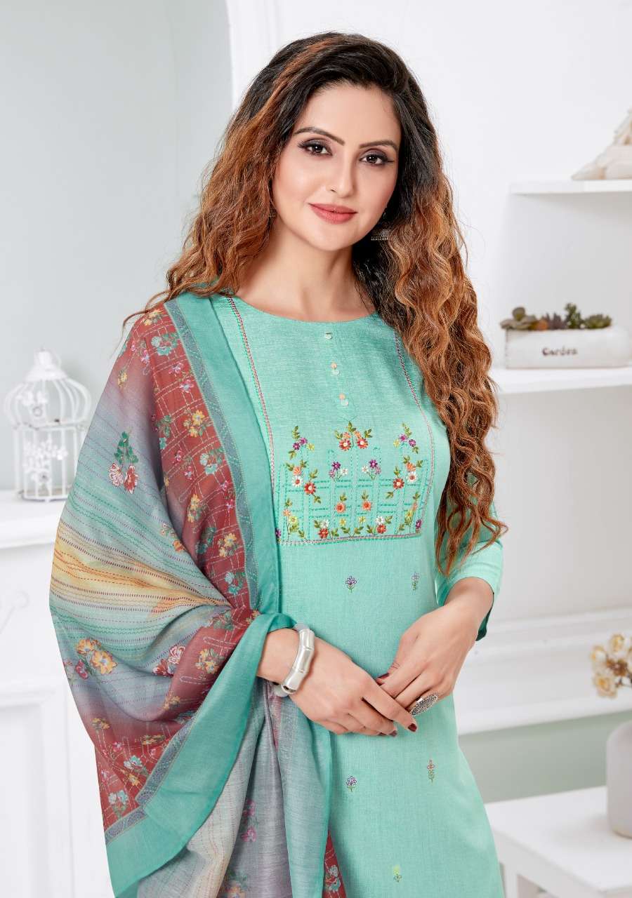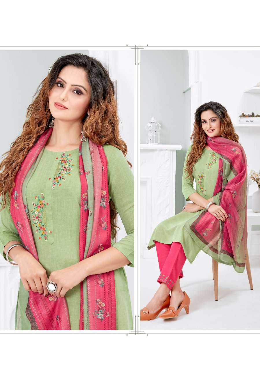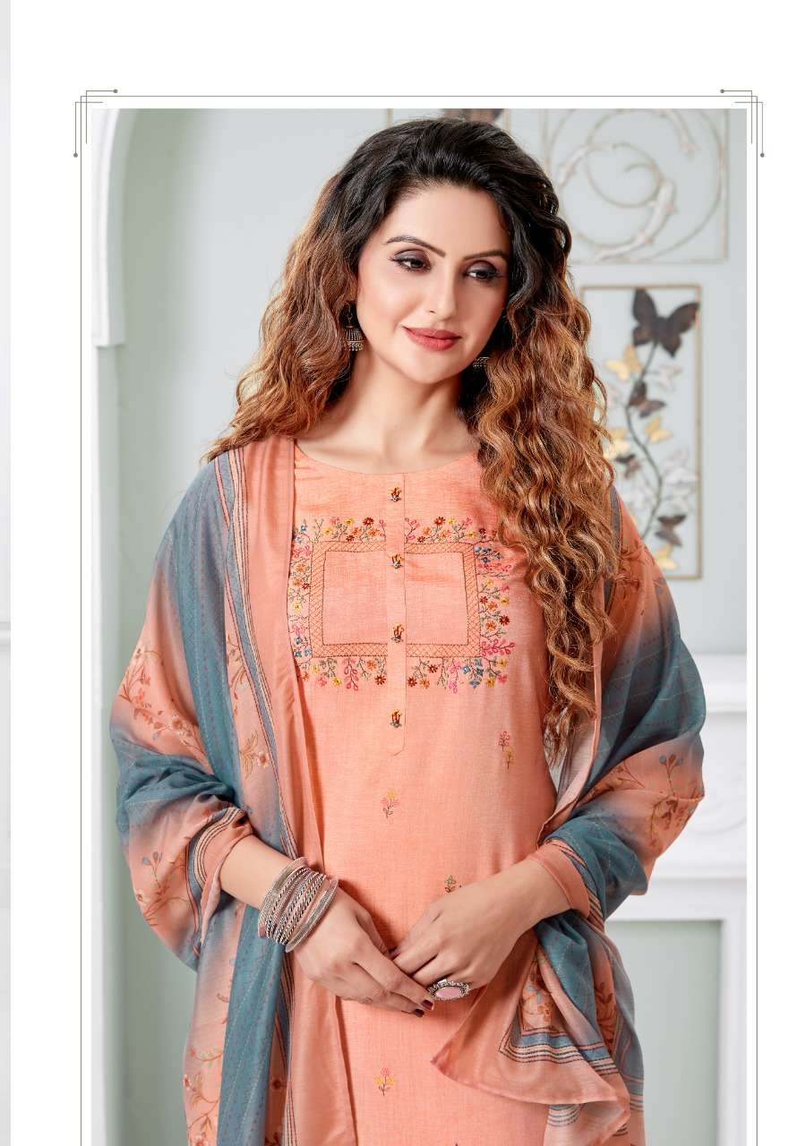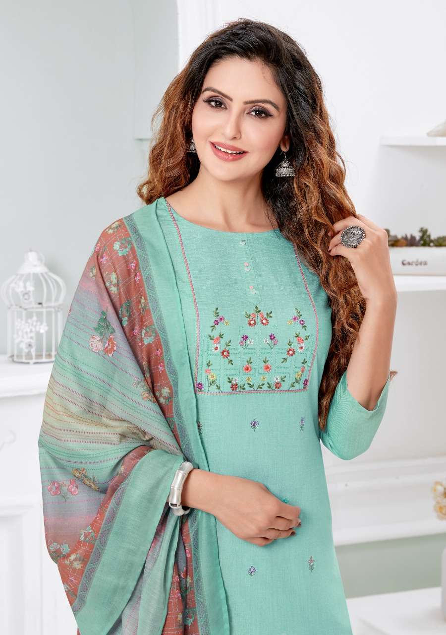 Brand : PINK MIRROR Catalogue : SERENITY (Kurti, Pant with Dupatta) Design : 6 Fabric : Top : Viscose Silk Liva  with embroidery n handwork.        Pants : Slub with embroidery .         Dupatta: Muslin digital print. Size : M(38),L(40),XL(42), XXL(44), 3XL(46) Rate :- 950/- |