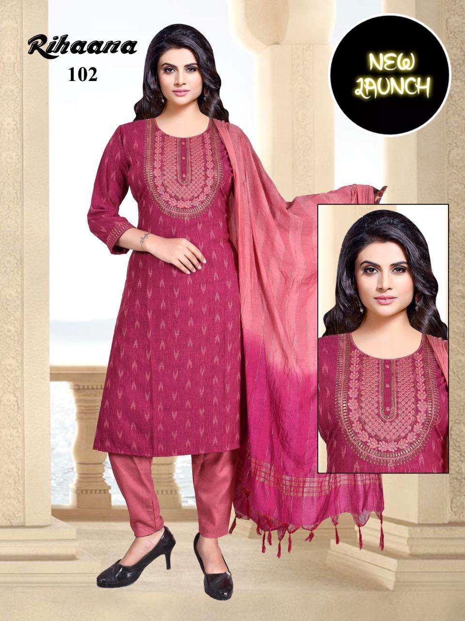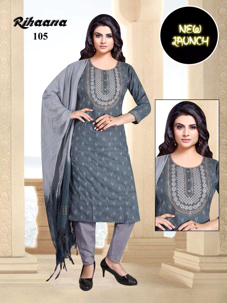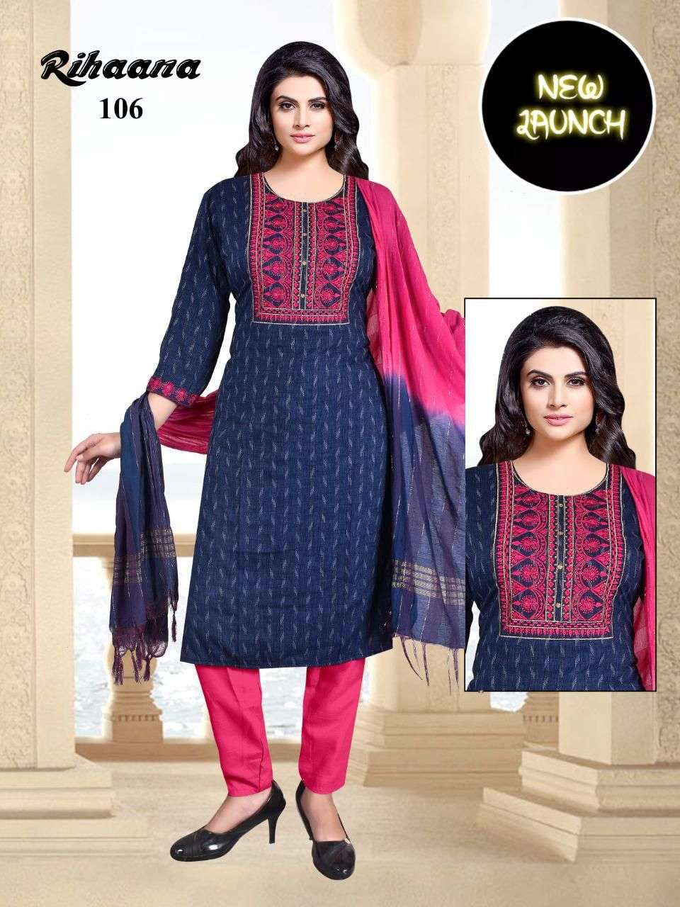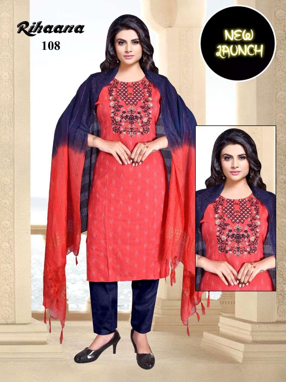 _📕Catalogue:- PLATINUM RIHAANA VOL.02 👗cloth :- TOP:- EKAT TOP WITH EMBROIDERY WORK BOTTOM:- COTTON PANT DUPATTA:- Fancy DYED DUPPATA Size:- L XL 2XL 3XL AVAILABLE 8 DESIGNS CATALOGUE Rate:- 850/- |
