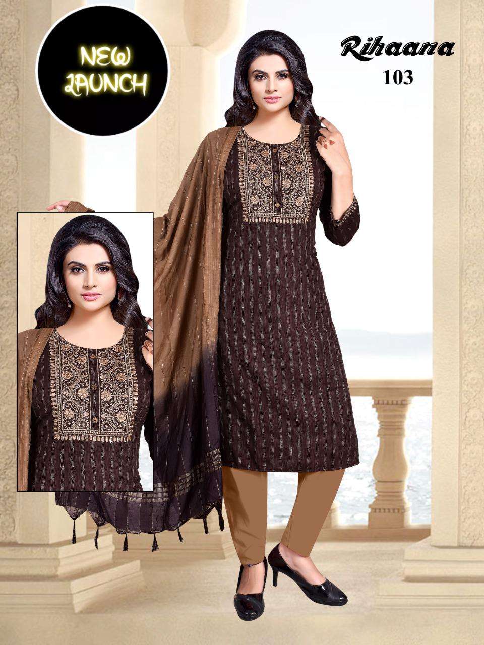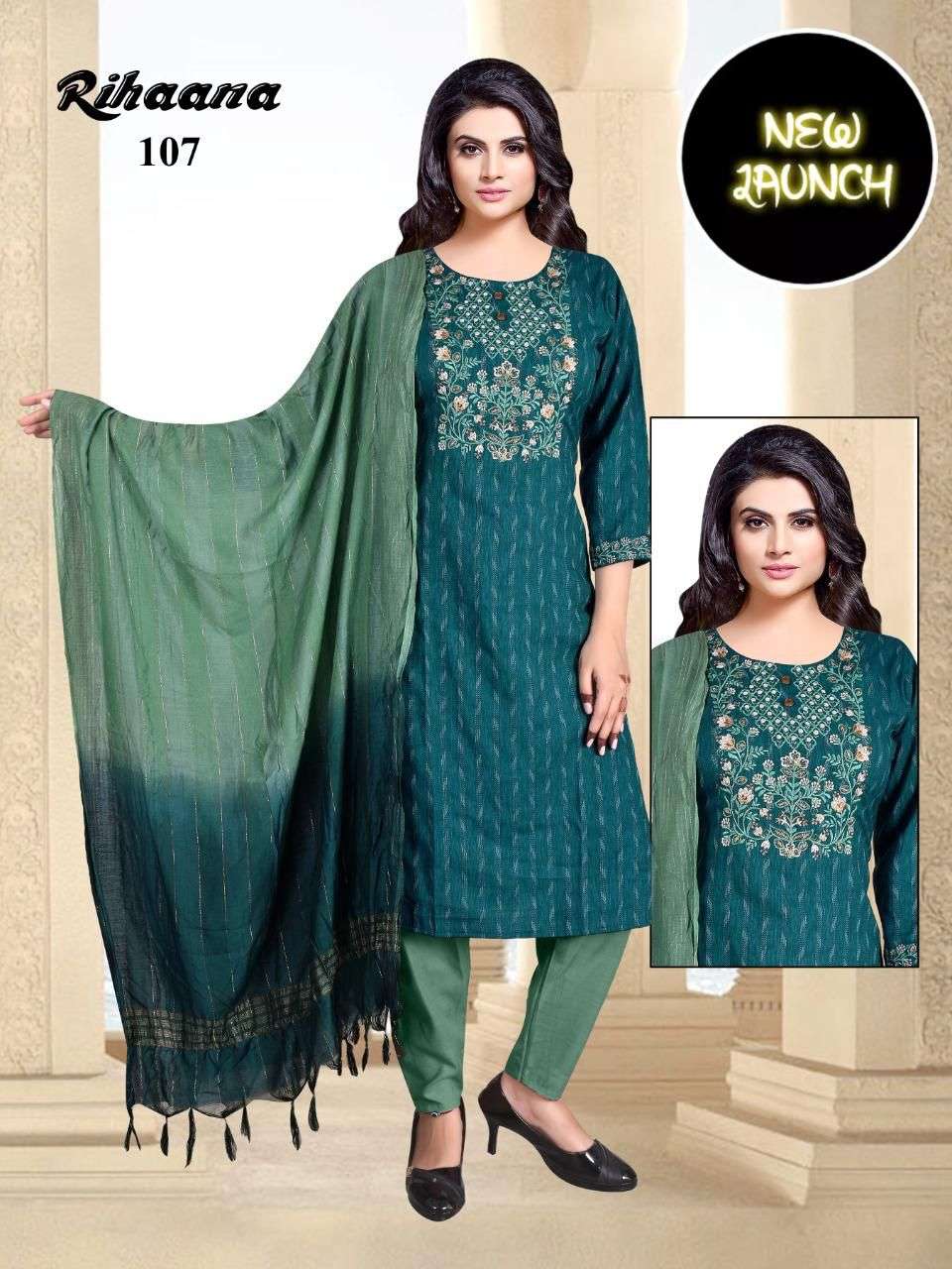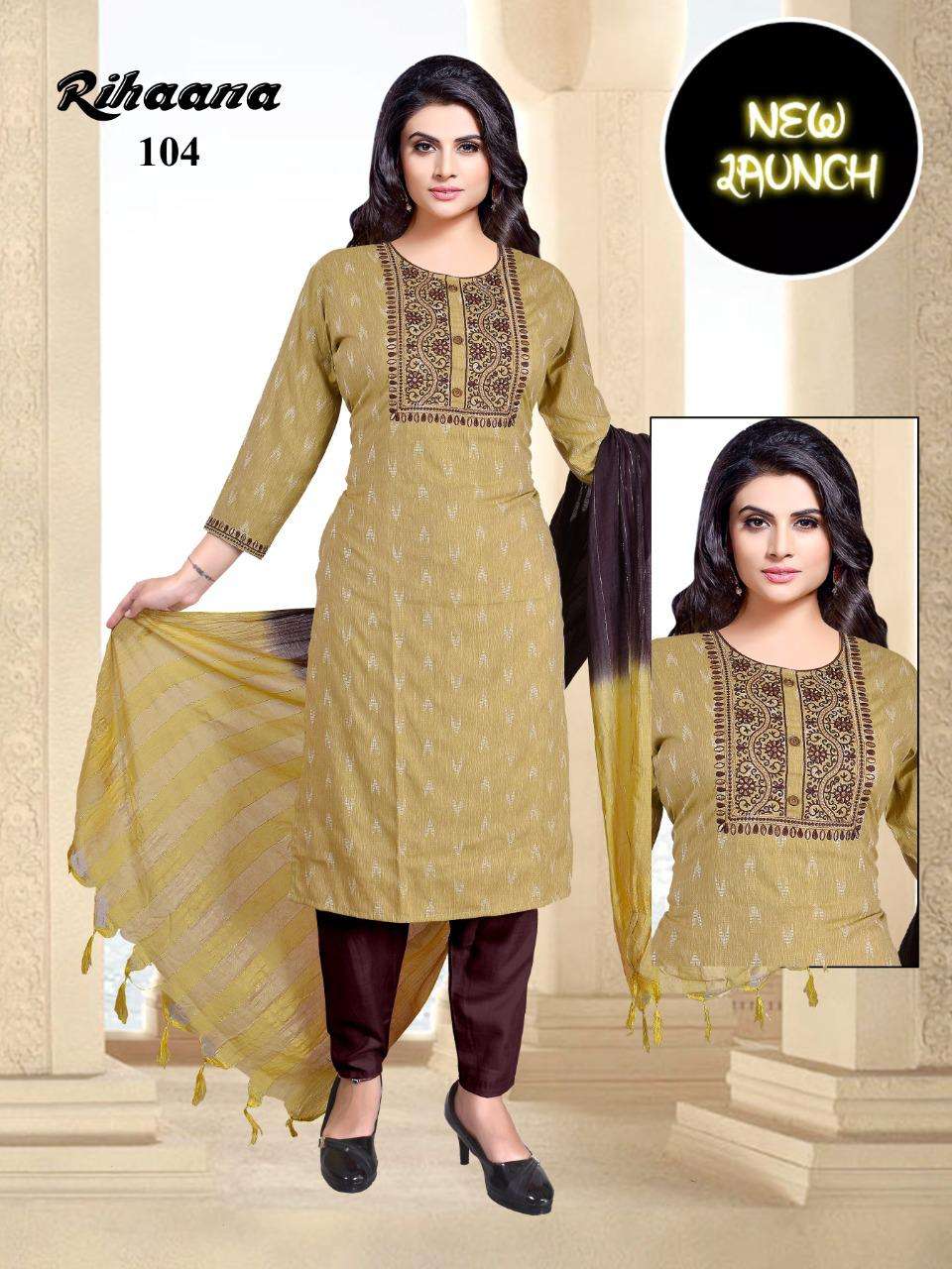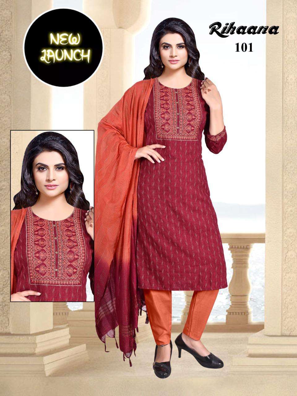 _📕Catalogue:- PLATINUM RIHAANA VOL.02 👗cloth :- TOP:- EKAT TOP WITH EMBROIDERY WORK BOTTOM:- COTTON PANT DUPATTA:- Fancy DYED DUPPATA Size:- L XL 2XL 3XL AVAILABLE 8 DESIGNS CATALOGUE Rate:- 850/- |